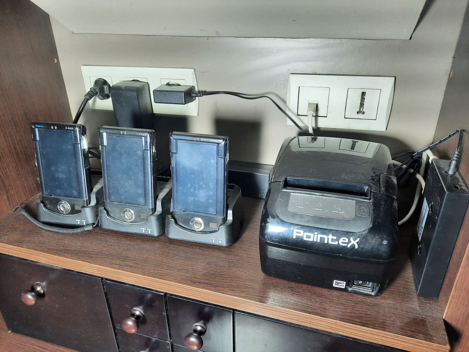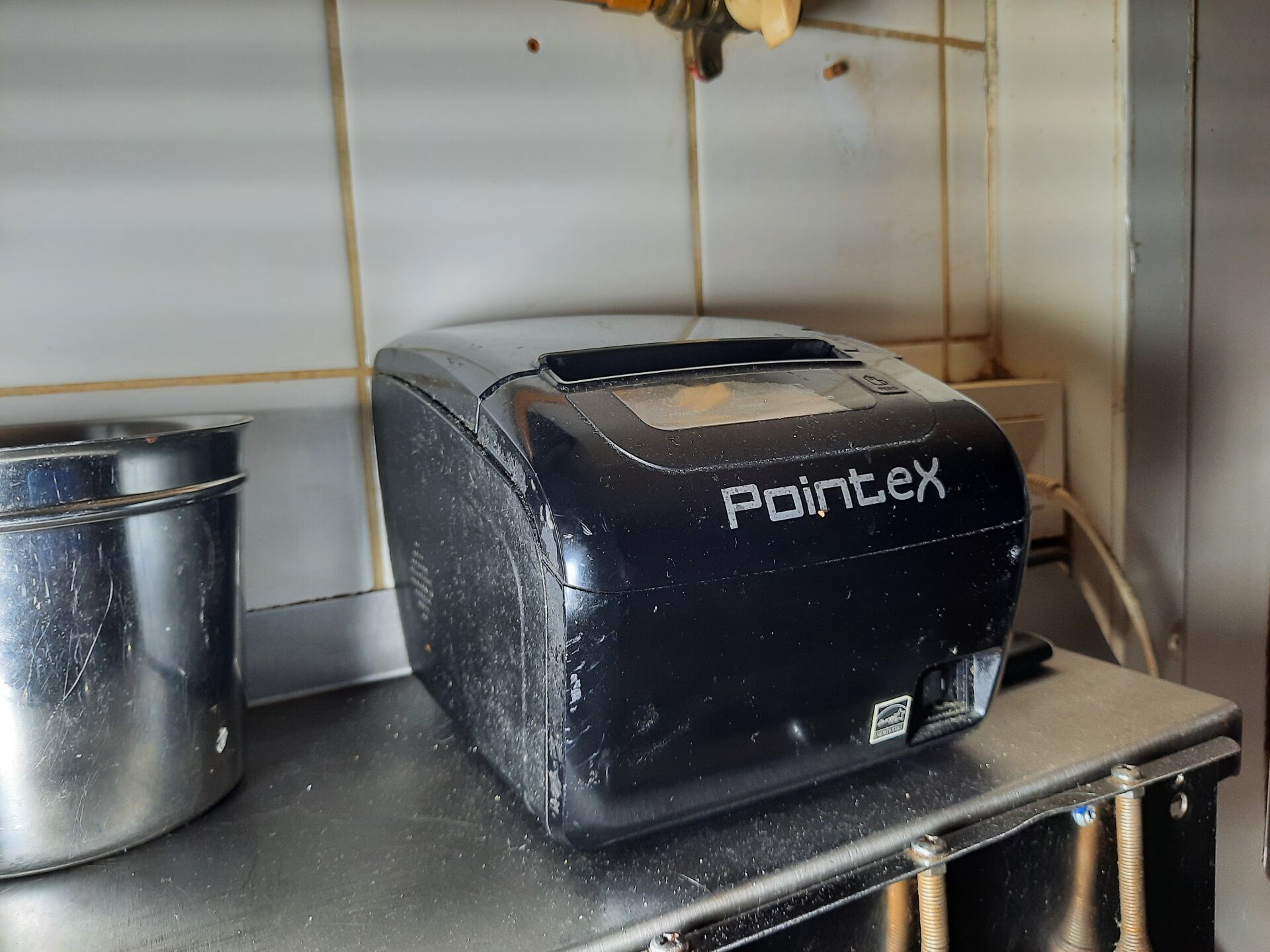 3 pads de commande tactiles, sans marque apparente 4 imprimantes à tickets POINTEX modèle PTX803 Caisse enregistreuse à écran tactile POINTEX modèle PTXPOS154. NS : E15402140 Tiroir caisse à clé