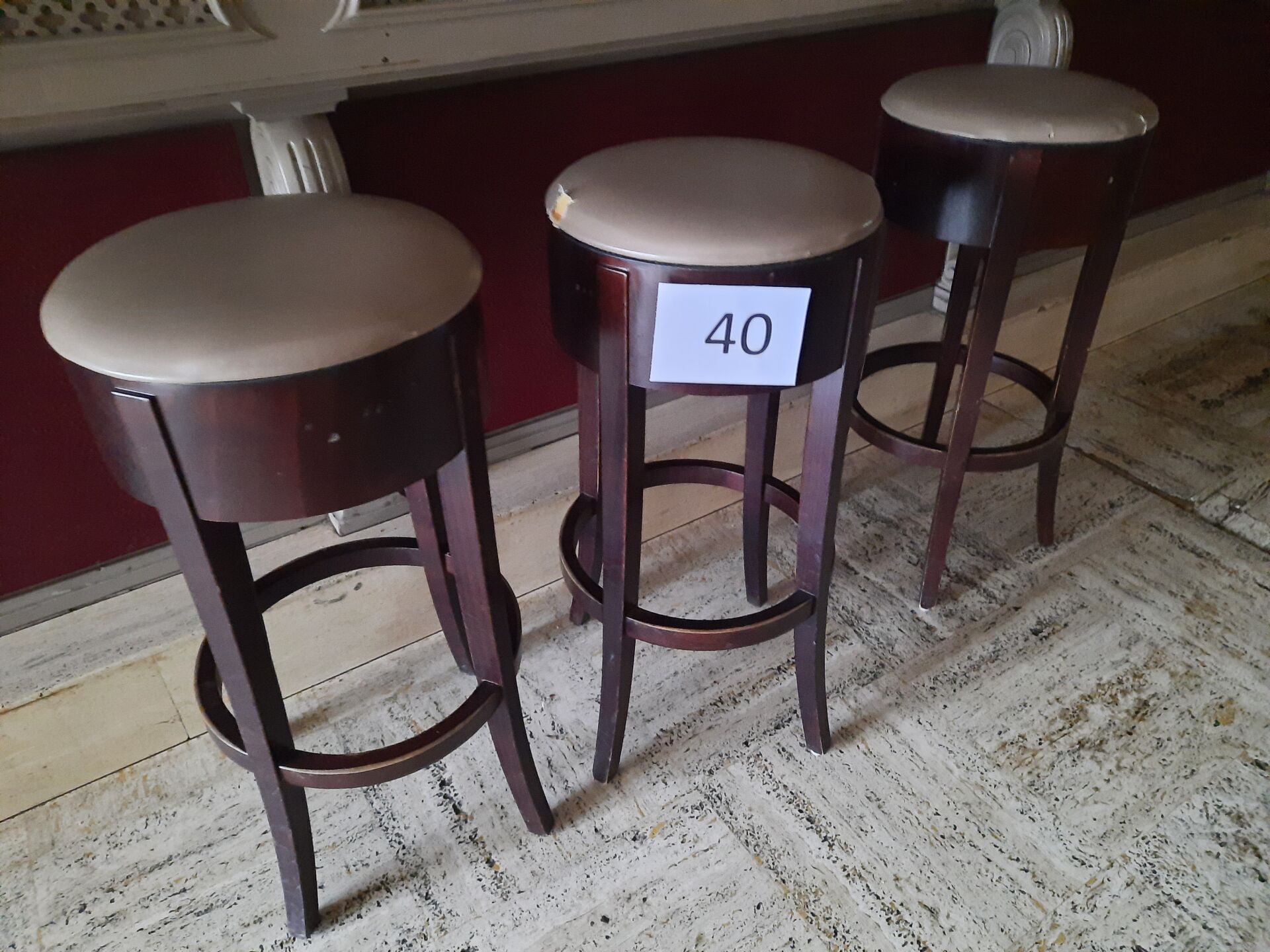 7 tabourets hauts, en bois teinté, assise simili cuir couleur taupe (accidents)