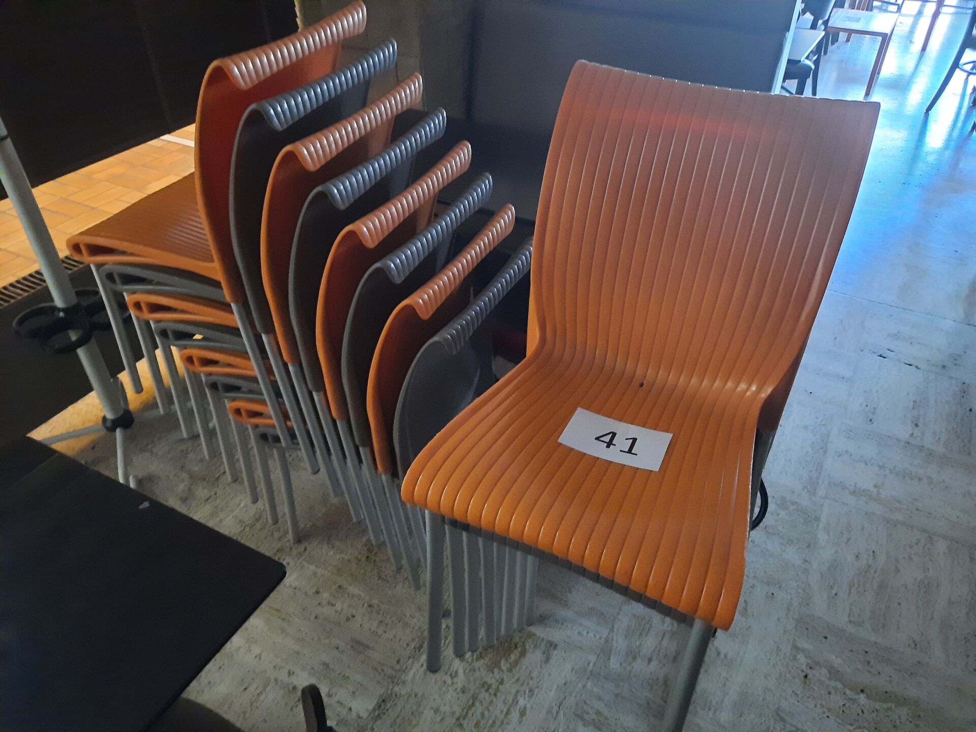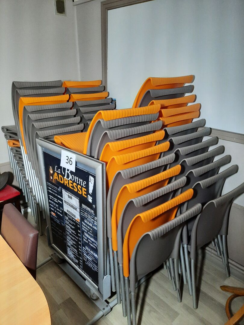 60 chaises d'extérieur en plastique, assise grise ou orange, piétement tubulaire gris On joint : Chariot de transport