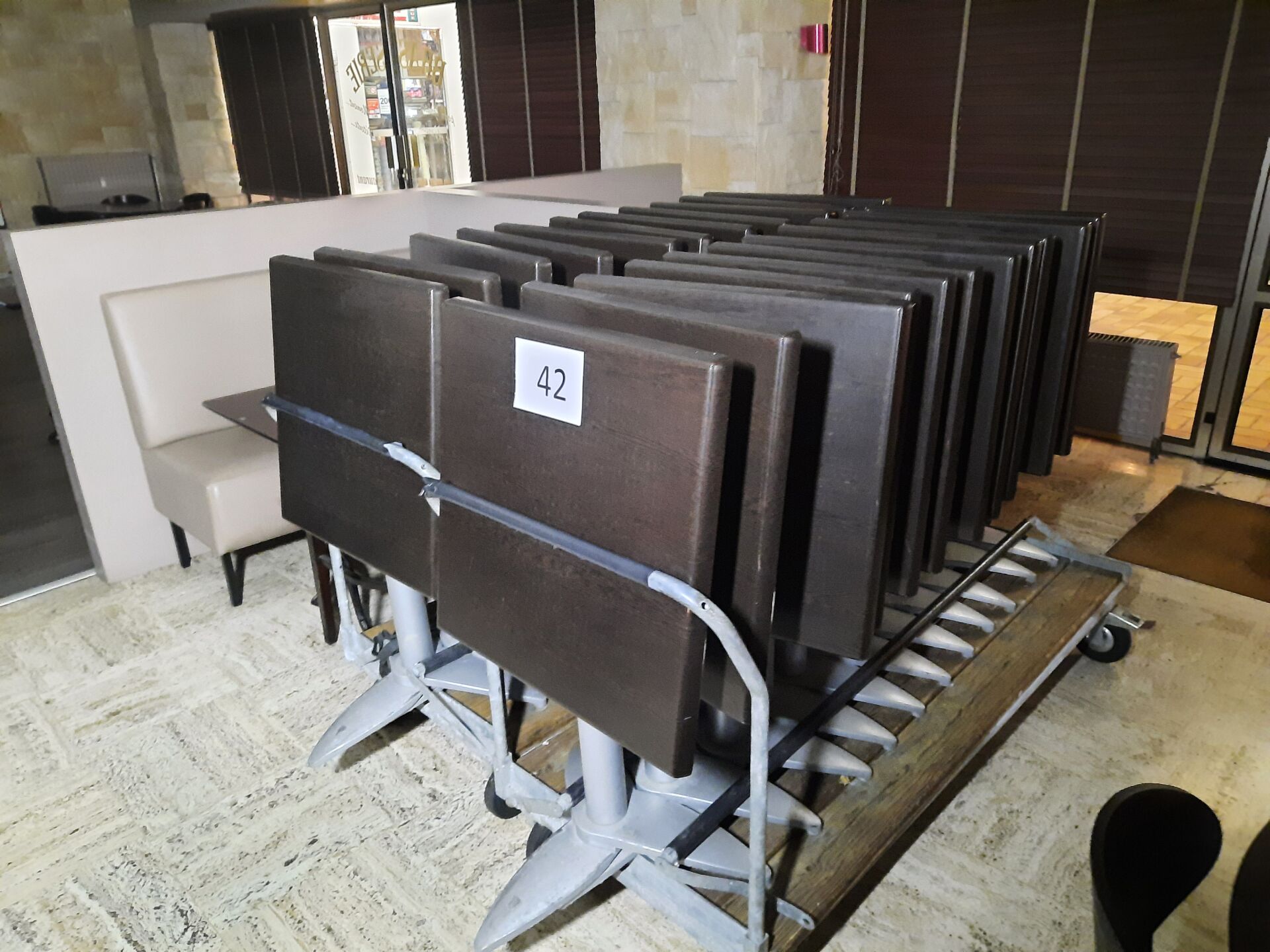 30 tables 2 couverts à plateau basculant façon bois et piétement métallique tripode (59 x 59 cm) On joint : 2 chariots de transport
