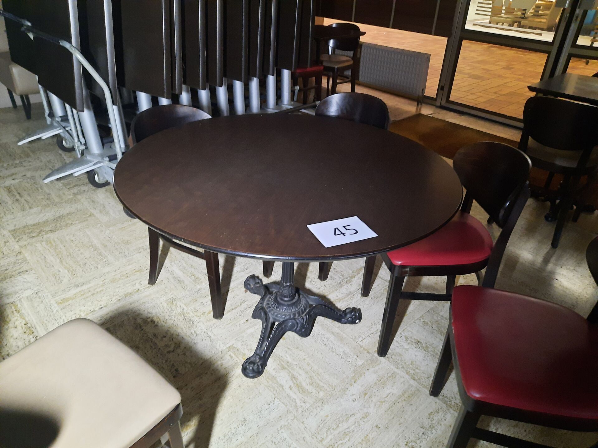 4 tables rectangulaires, piétement en fonte 1900 (120 x 60 cm) On joint : 2 tables à plateau circulaire, 6 couverts piétement tripode en fonte 1900 (diam. : 100 cm)