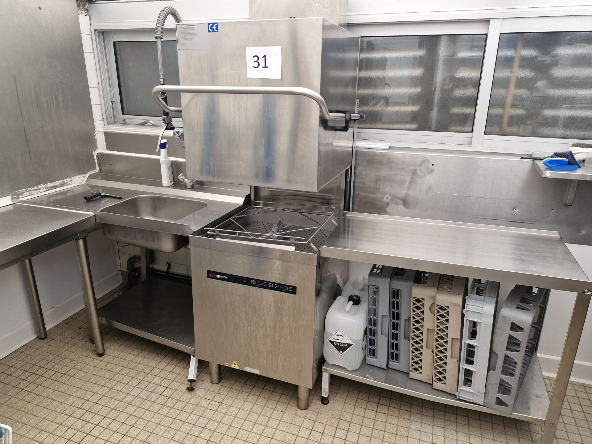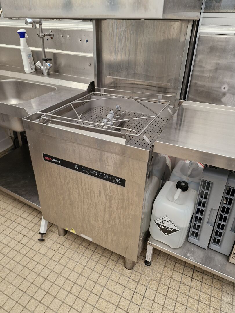 1 lave vaisselle à capot inox GGM GASTRO 65 x 85 x 210 cm avec allonge (100 x 52 cm) à droite et plonge inox avec douchette à gauche 120 x 70 cm , 6 paniers de 50 x 50 cm a démonter proprement en respectant l'étanchéité, prévoir pose de bouchons de plombier