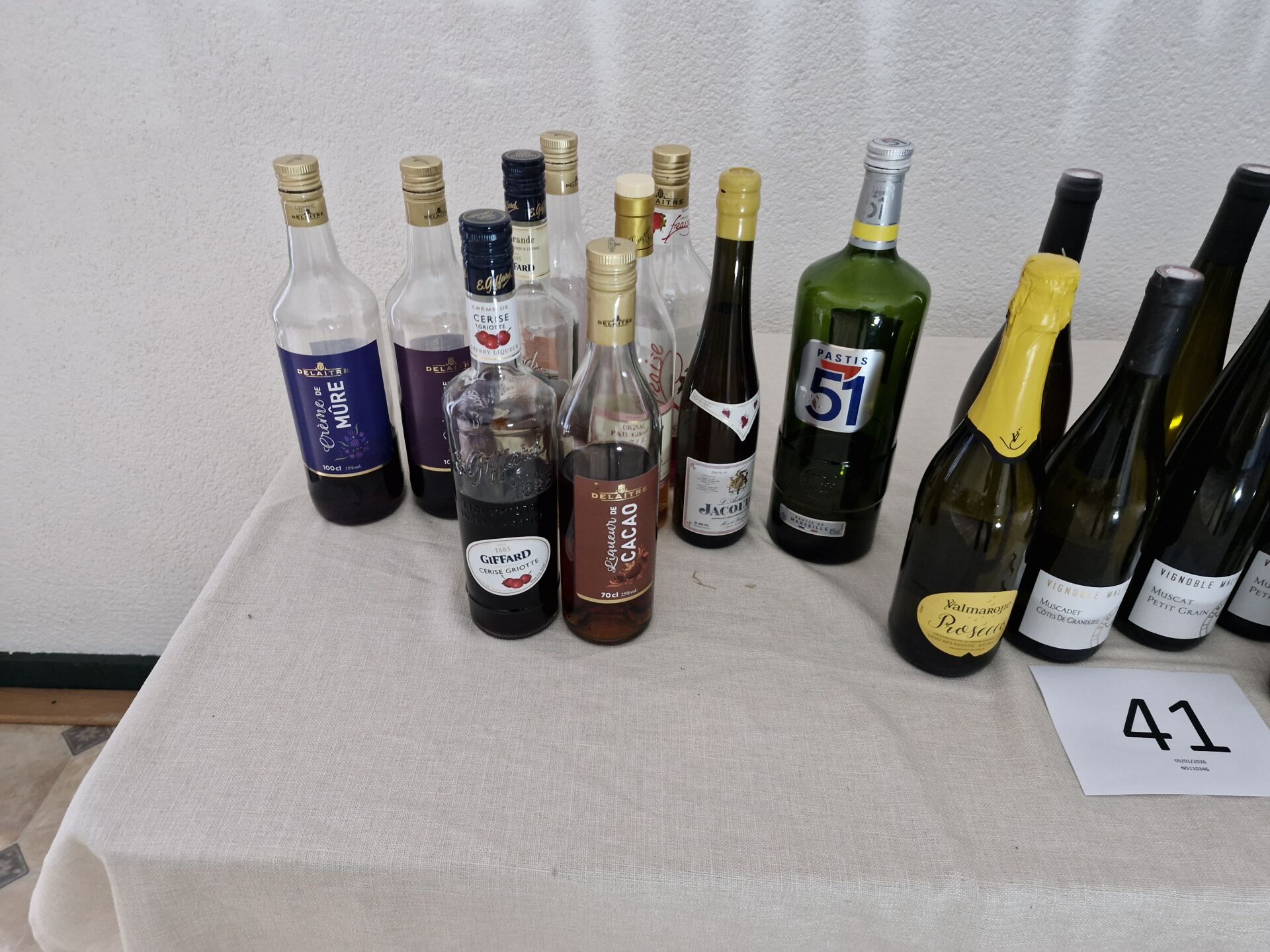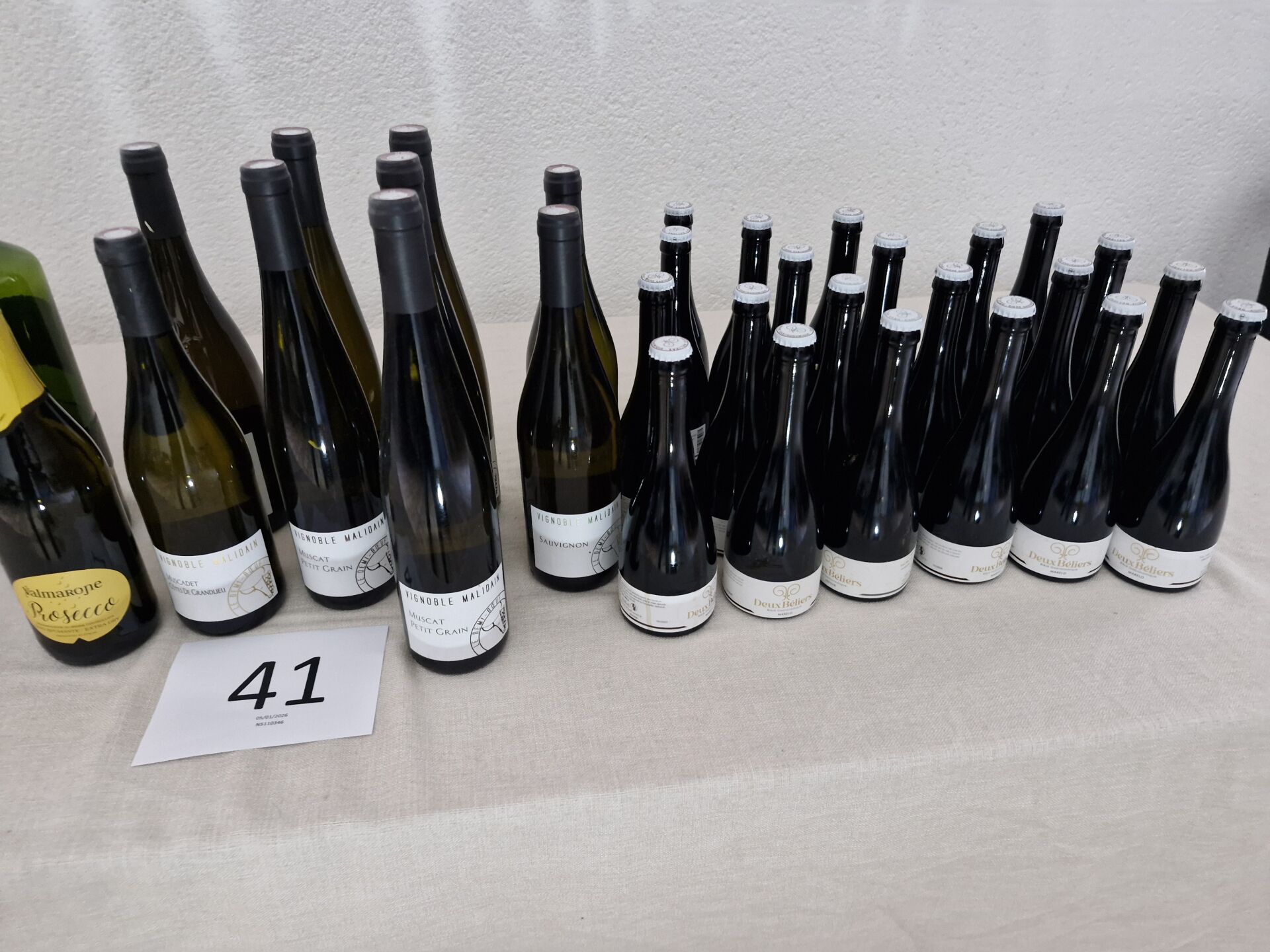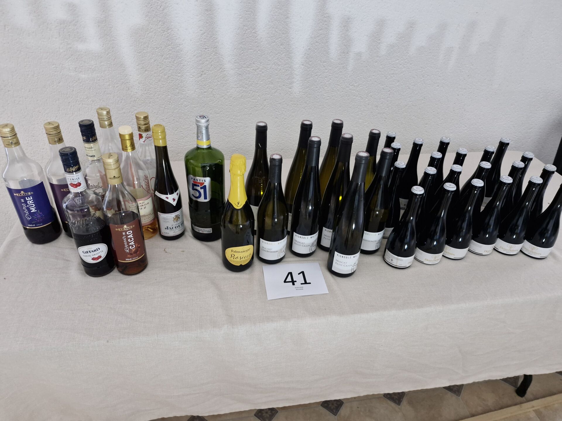 1 stock de boissons alcoolisées comprenant : 21 bouteilles( 0.33 l) bières MAKELO "2 béliers" 2 bouteilles (0.75l) Muscadet cote de Grand Lieu "Malidain" 2 bouteilles (0.75l) Sauvignon "Malidain" 5 bouteilles de muscat (0.75l) Amphibolite "Malidain" + bouteilles d'alcool entamées