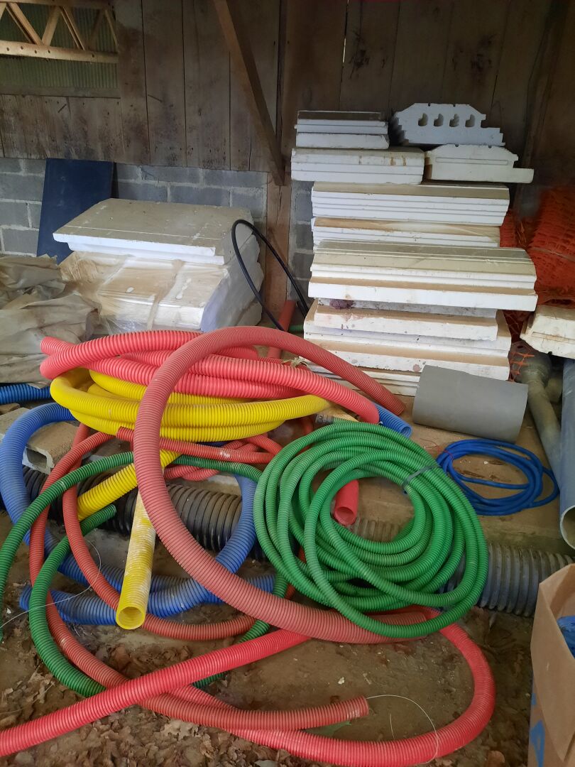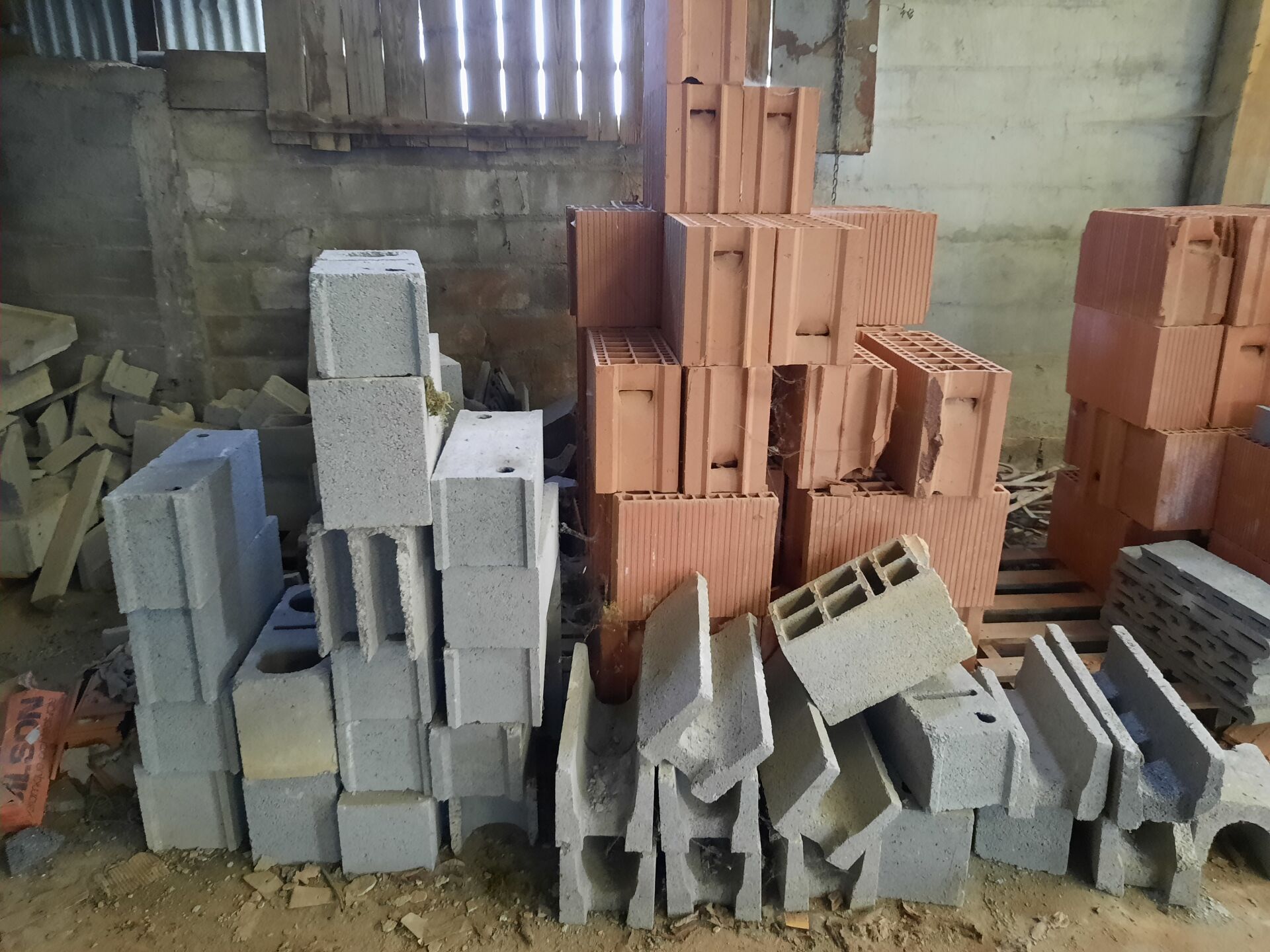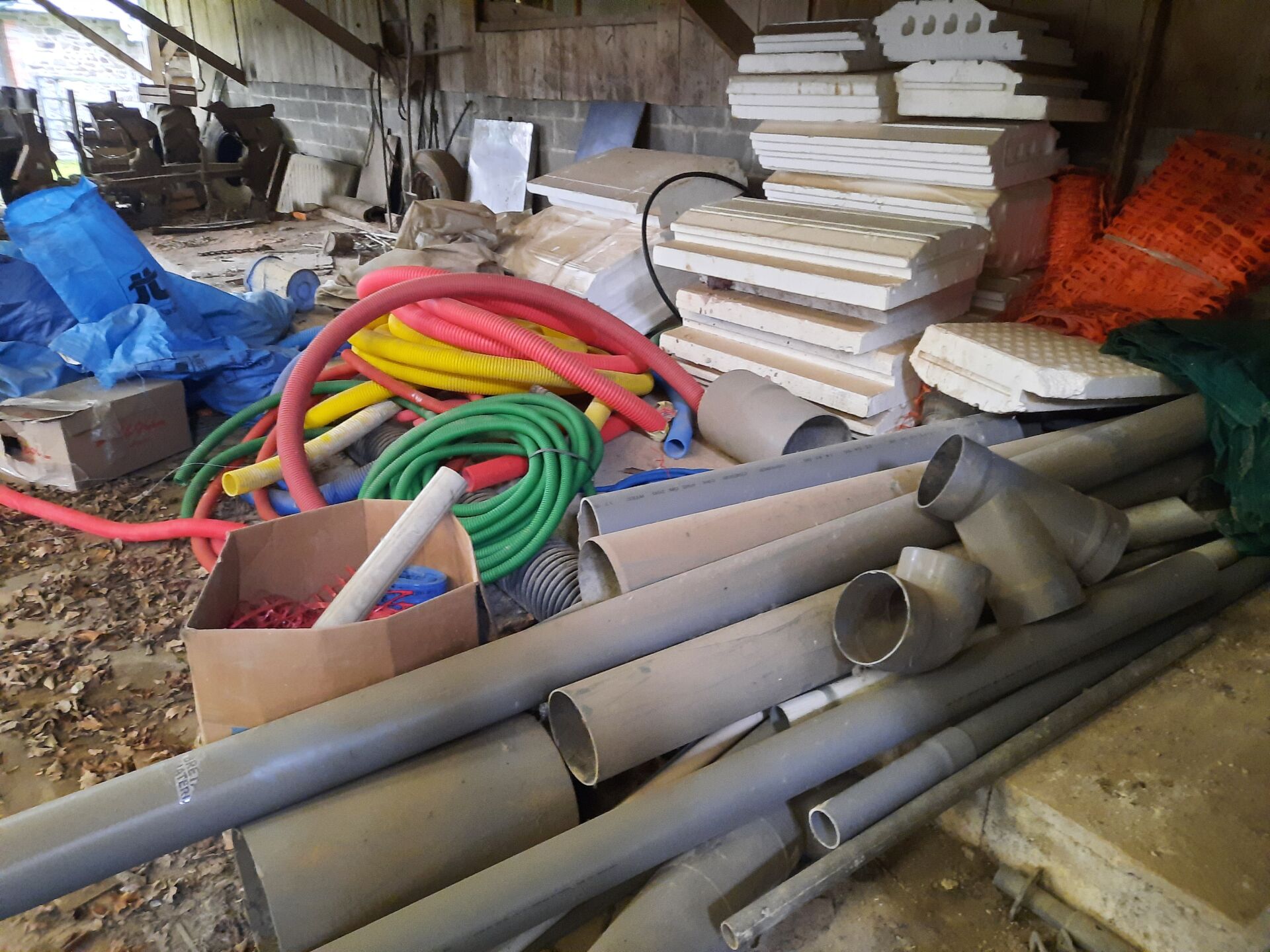 Stock de parpaings, tuyaux en PVC, briques alvéolaires, gaines, hourdis polystyrène