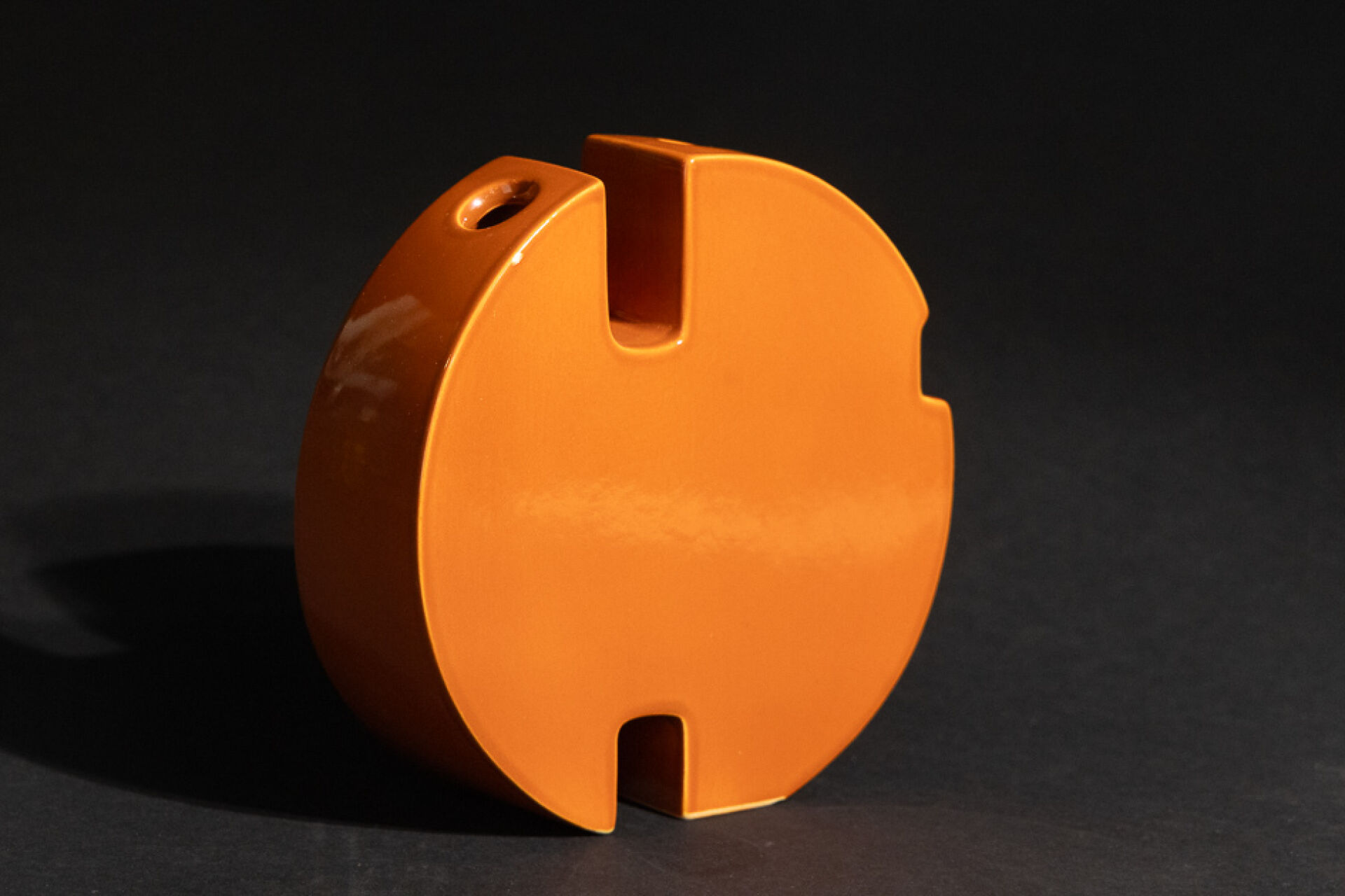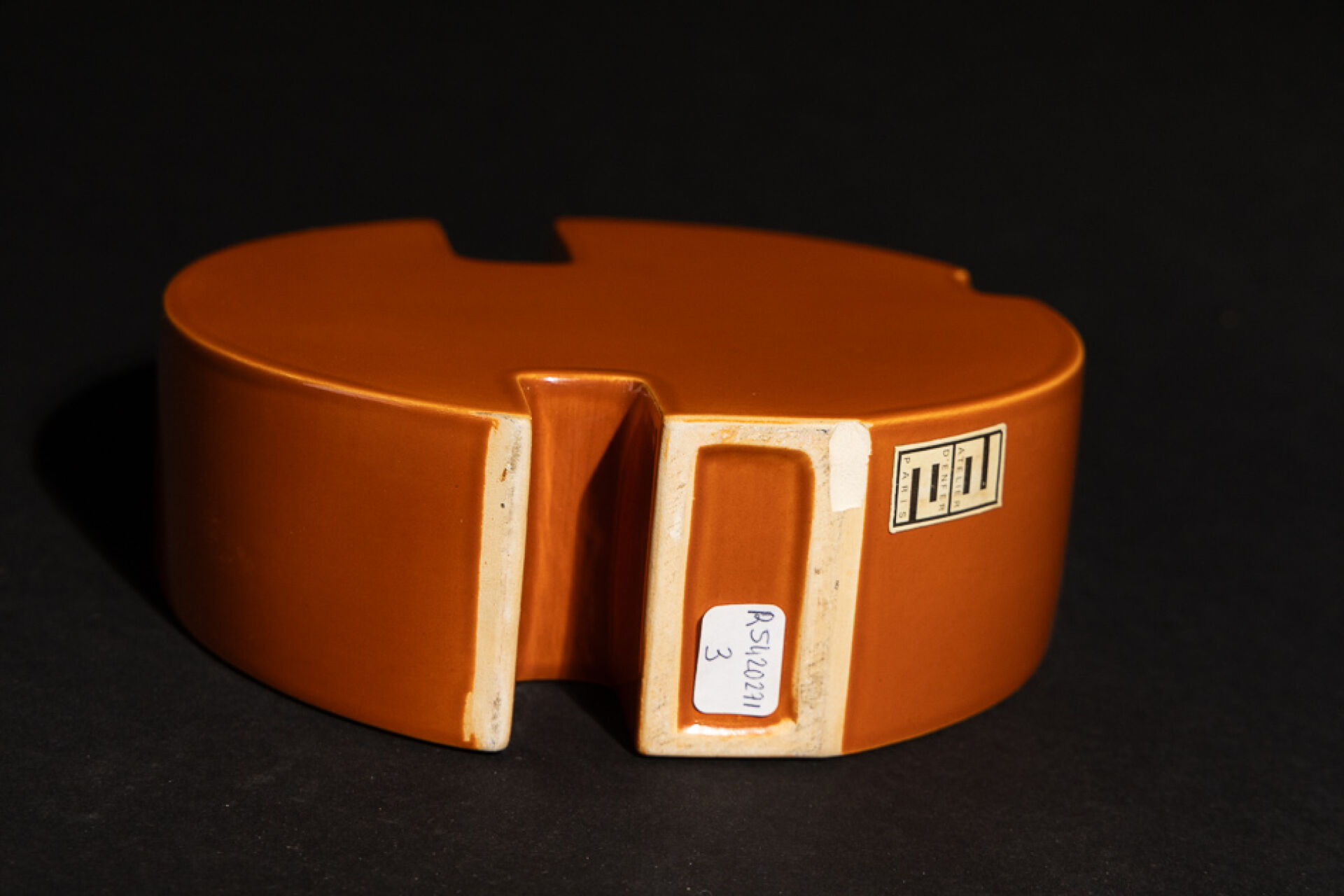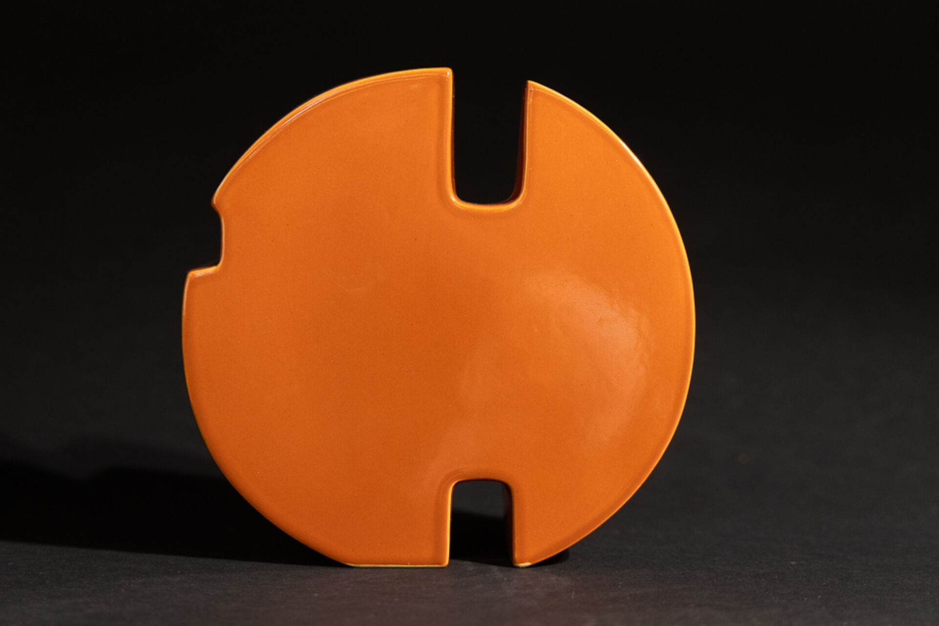 Marie-Madeleine BOUCRAUT - Atelier d'enfer. Vase disque de forme libre en faïence orange-brun à deux compartiments. Etiquette (deux petits éclats). Haut. : 18 cm - Larg. : 19 cm Un modèle similaire conservé au musée d'Art et d'Industrie André Diligent de Roubaix. Marie-Madeleine Boucraut de son vrai non Noémi Faber est aux Arts Décoraitfs à la fin des années 50, formation qu'elle complètera par un séjour italien. De retour elle s'installe à Paris, passage de l'Enfer et se consacre à la céramique dans le goût du Bauhaus,, pour la couleur son choix se porte la monochromie. Monochrome comme son célèbre voisin Yves Klein qui avait son atelier dans le même passage.