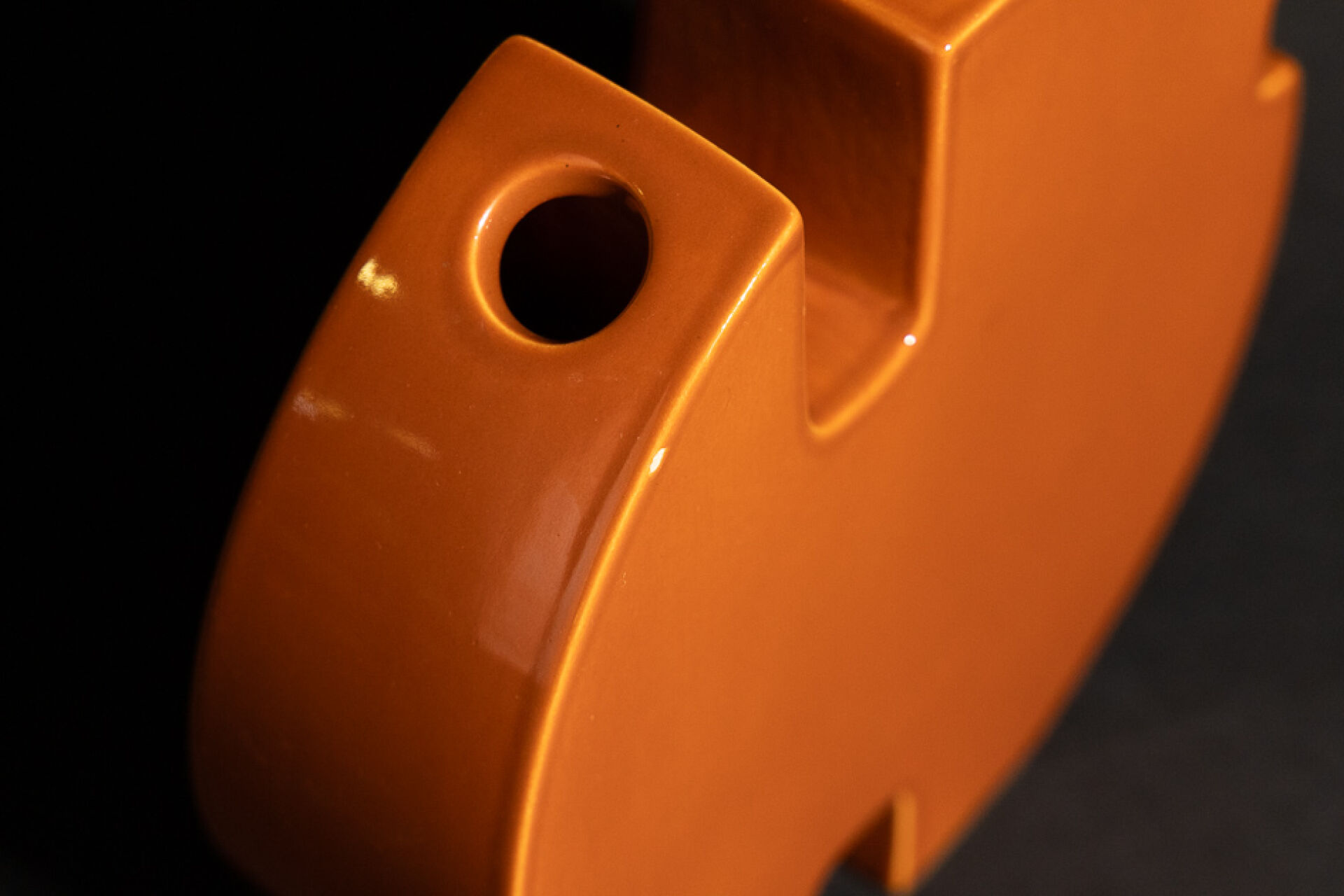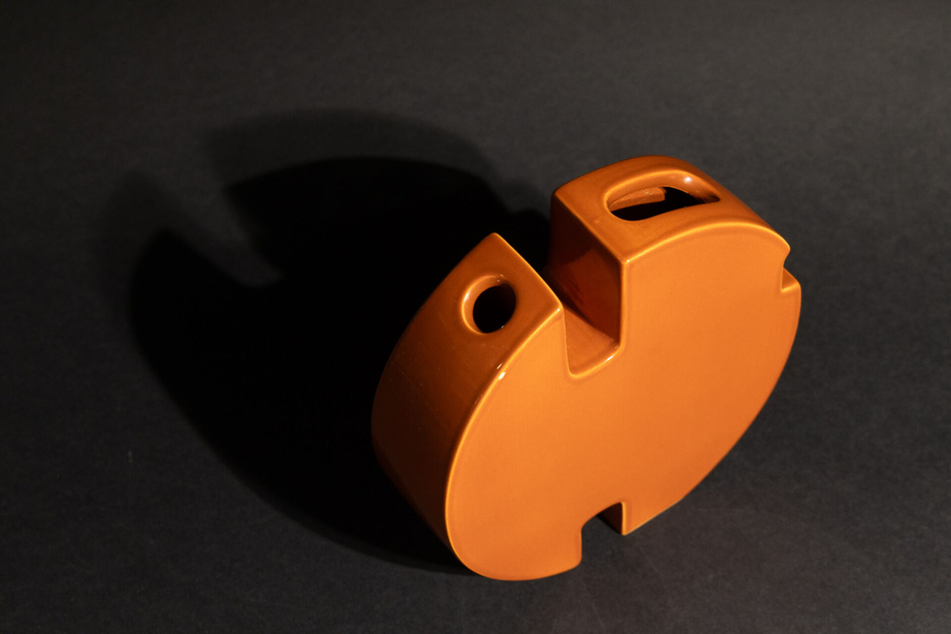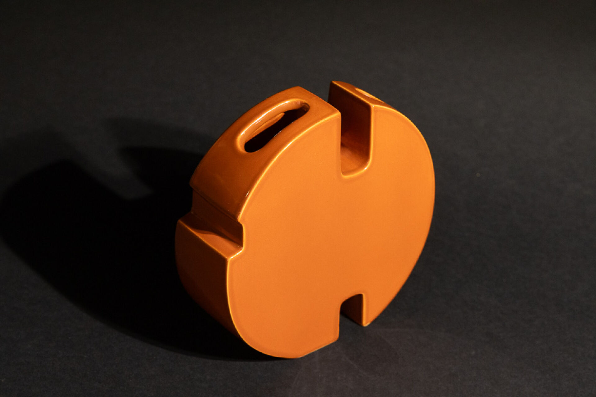 Marie-Madeleine BOUCRAUT - Atelier d'enfer. Vase disque de forme libre en faïence orange-brun à deux compartiments. Etiquette (deux petits éclats). Haut. : 18 cm - Larg. : 19 cm Un modèle similaire conservé au musée d'Art et d'Industrie André Diligent de Roubaix. Marie-Madeleine Boucraut de son vrai non Noémi Faber est aux Arts Décoraitfs à la fin des années 50, formation qu'elle complètera par un séjour italien. De retour elle s'installe à Paris, passage de l'Enfer et se consacre à la céramique dans le goût du Bauhaus,, pour la couleur son choix se porte la monochromie. Monochrome comme son célèbre voisin Yves Klein qui avait son atelier dans le même passage.