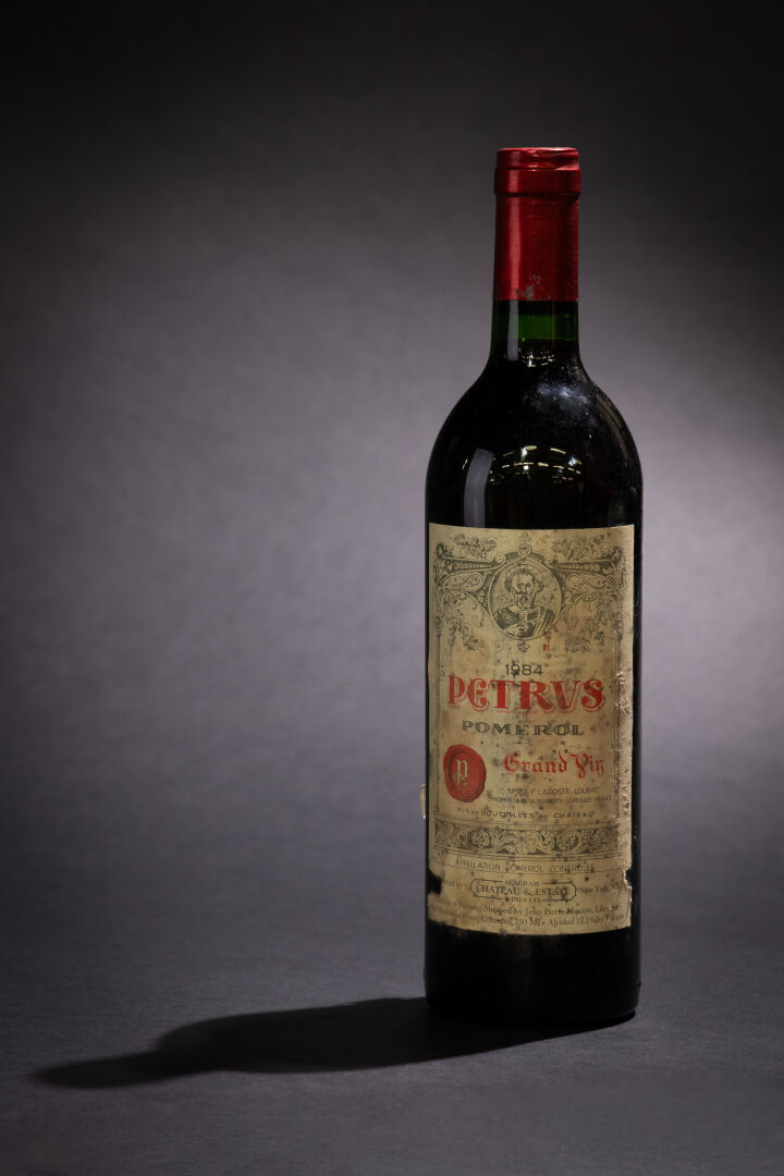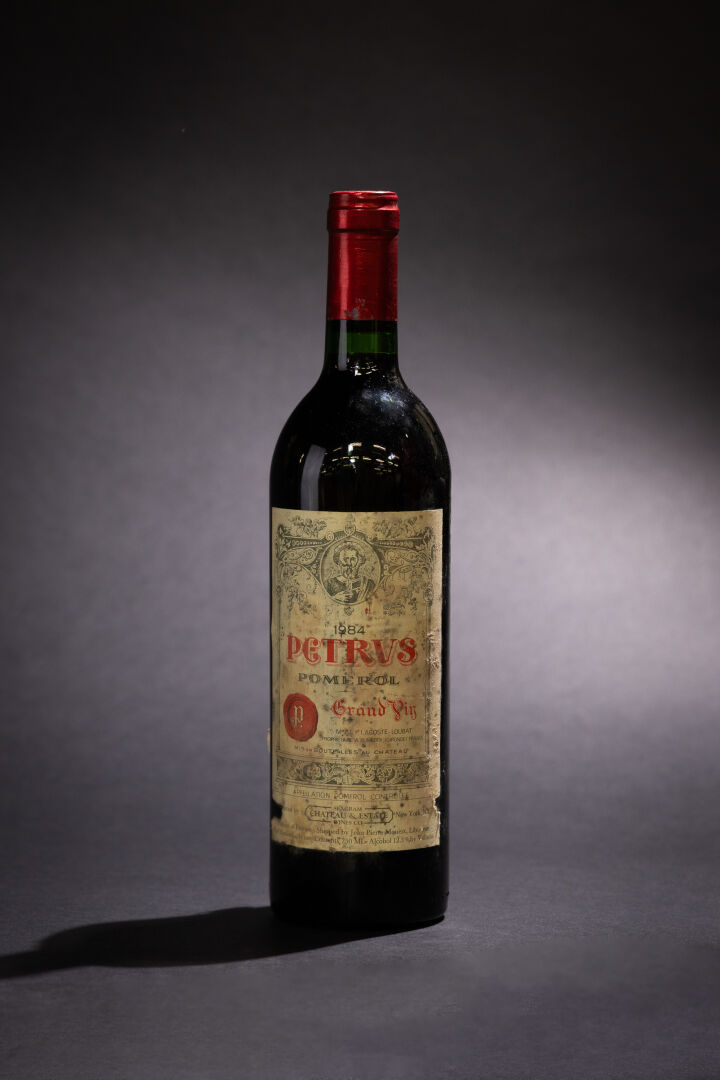 Une bouteille de PETRUS 1984 Pomerol (excellent niveau : étiquette Import U.S.A marquée par l'humidité et abîmée sur les côtés mais très lisible ; capsule estampée légèrement sale faiblement incurvée au sommet) Expertise réalisée par Monsieur KUZNIEWSKI.