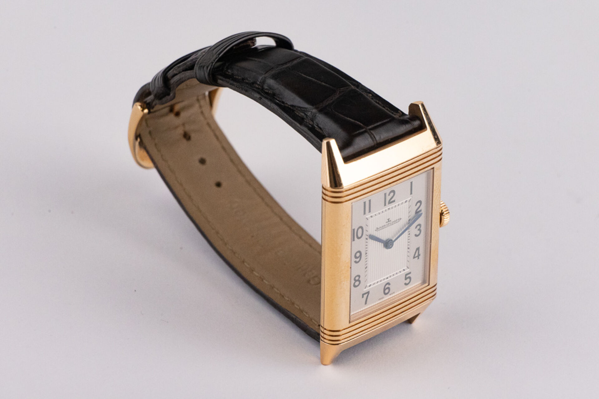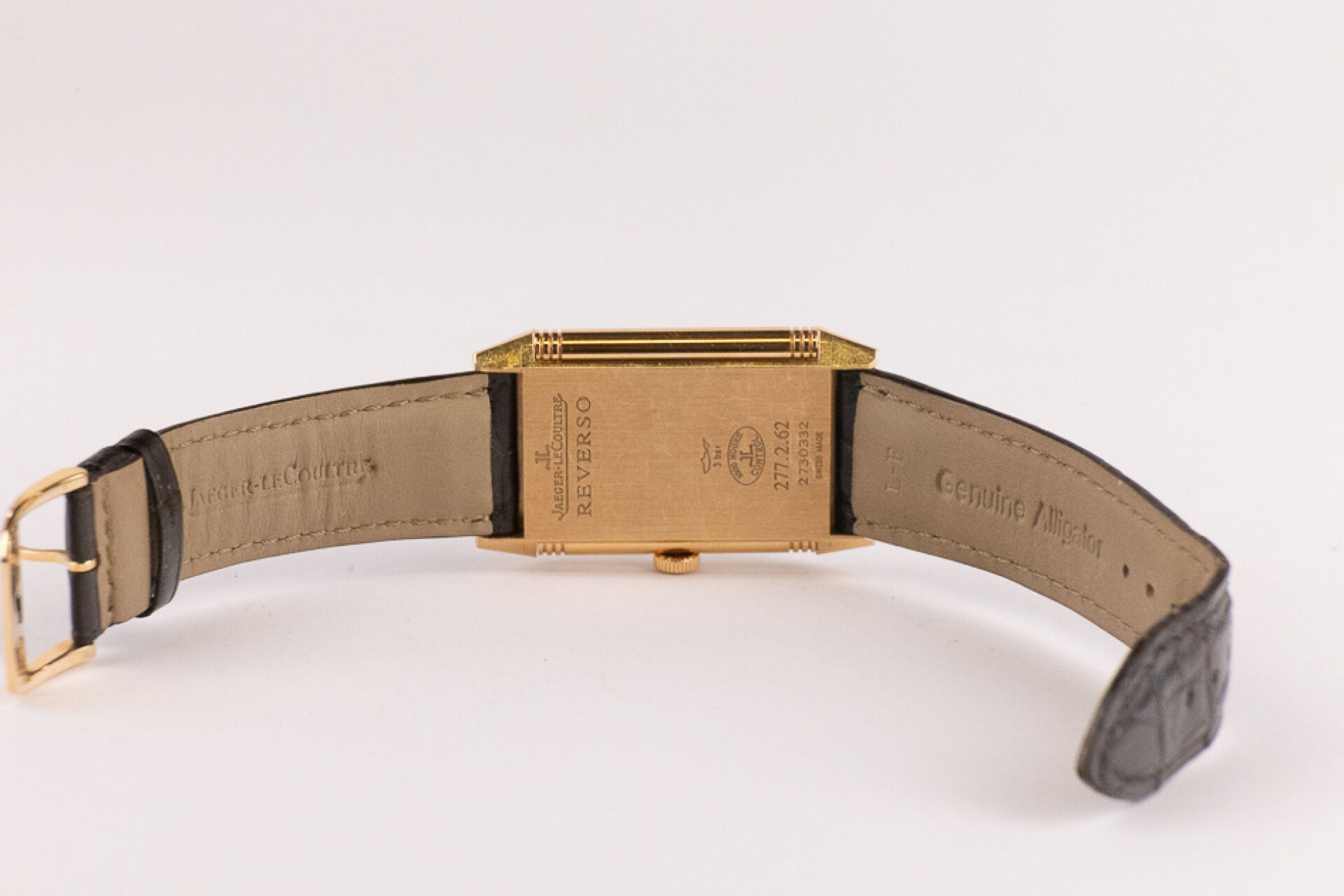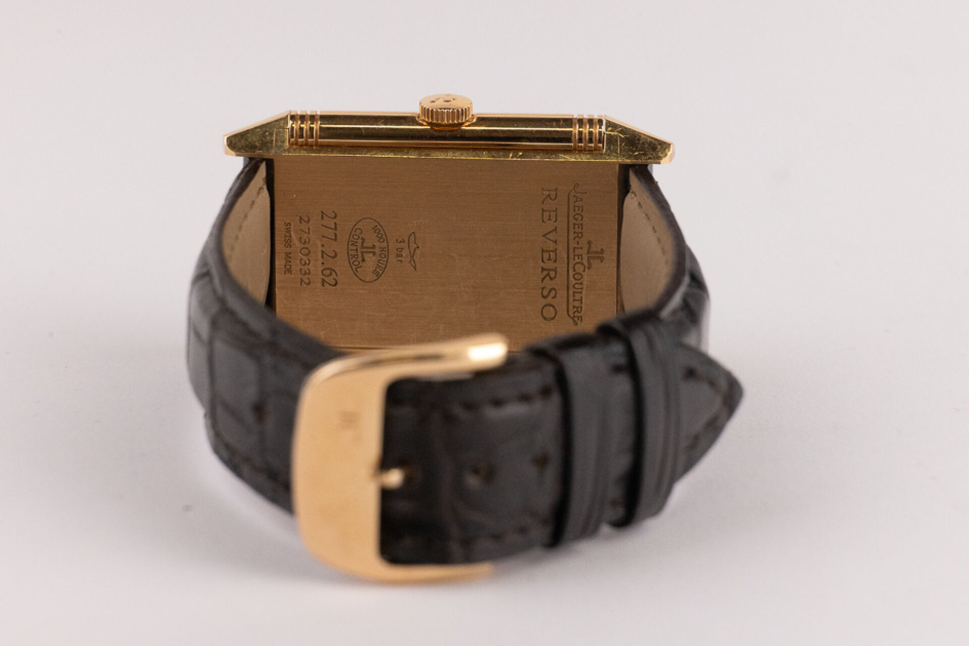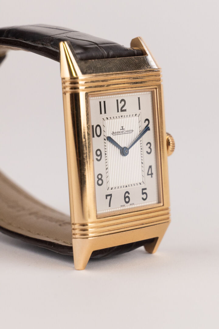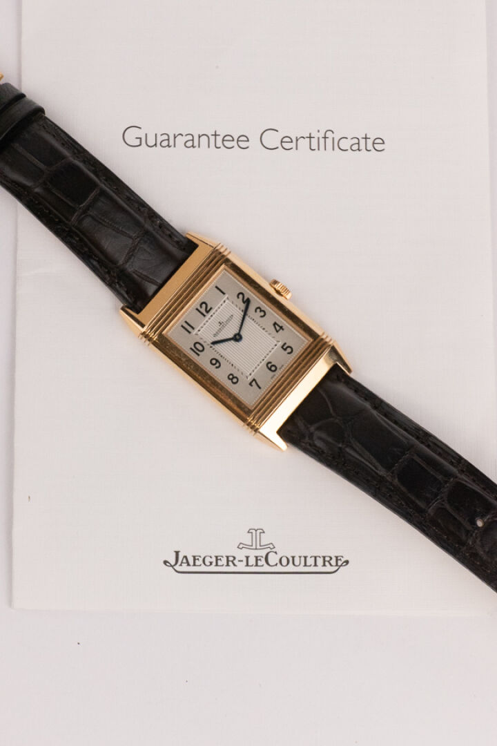 JAEGER-LECOULTRE, 2011 - Montre homme Reverso, boitier rectangulaire en or rose 18k (750 millièmes), cadran blanc, chiffre arabes, signé JEAGER LECOULTRE Reverso au dos, bracelet en cuir imitation croco noir, boucle ardillon signée en or rose 18k (750 millièmes), mouvement quartz ? Certificat de garantie Ref. 277.2.62 Dim. : 32 x 23 mm - Long. : 15,5 à 19 cm - Poids brut : 71,50 gr (micro rayures au dos) Conditions de vente spécifiques : Veuillez noter que toutes les montres sont vendues en l'état. Aucune garantie n'est faite sur l'état de marche, une révision est donc conseillée. Certaines montres ont été ouvertes pour identifier le type et la qualité du mouvement, y compris les montres résistantes à l'eau, il est donc conseillé à l'acheteur de consulter un horloger pour revoir l'étanchéité de la montre.