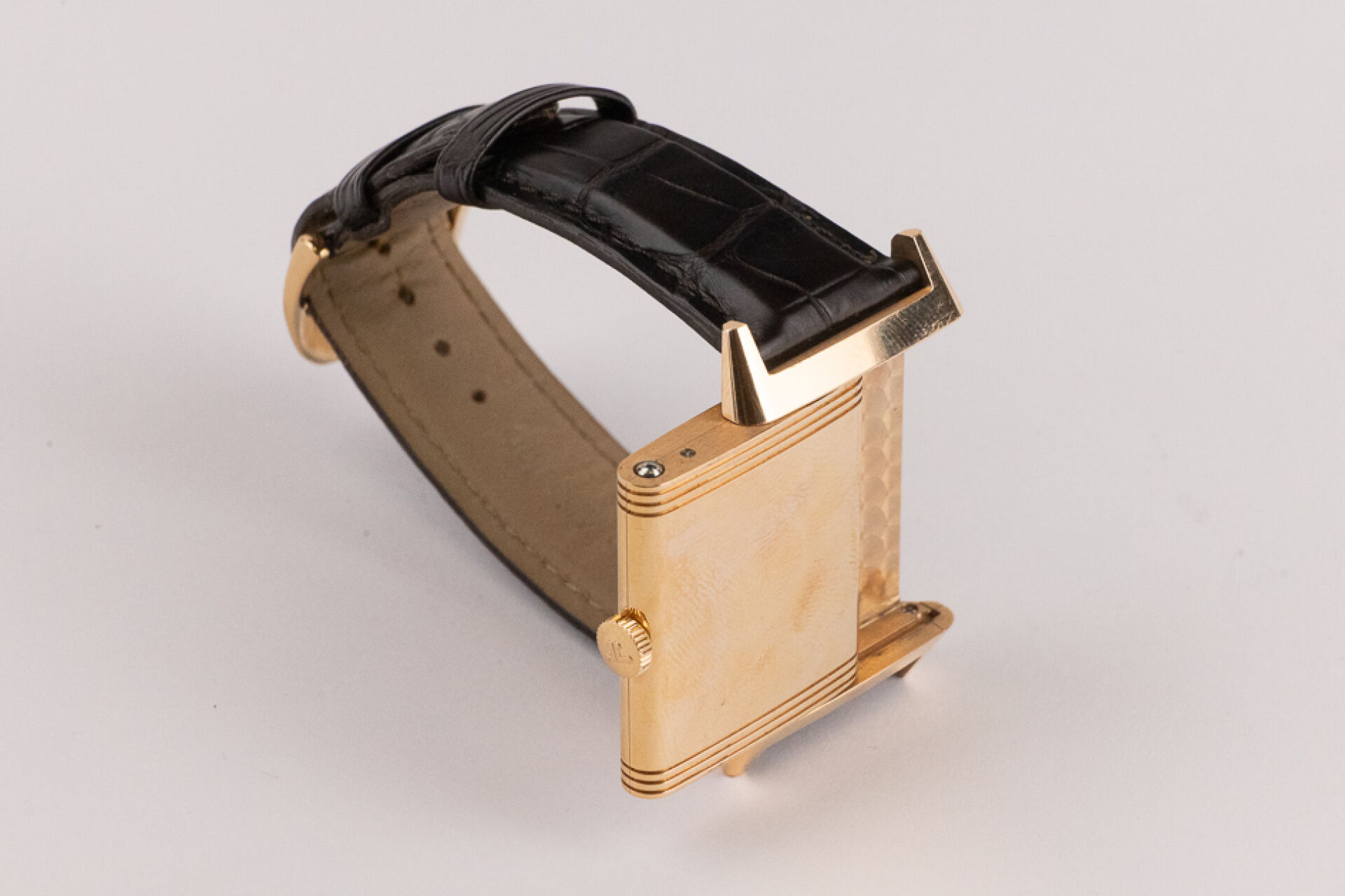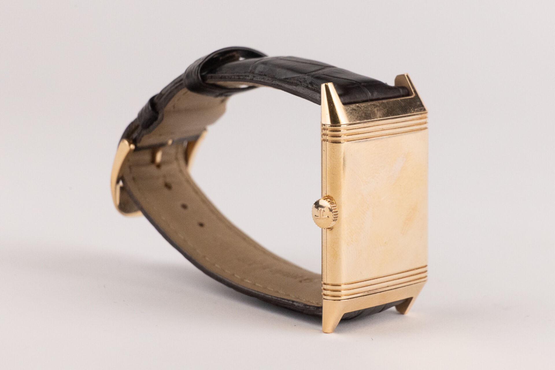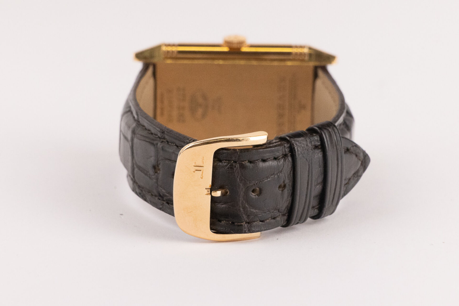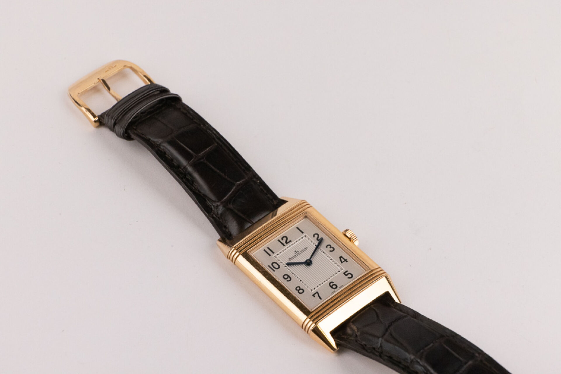 JAEGER-LECOULTRE, 2011 - Montre homme Reverso, boitier rectangulaire en or rose 18k (750 millièmes), cadran blanc, chiffre arabes, signé JEAGER LECOULTRE Reverso au dos, bracelet en cuir imitation croco noir, boucle ardillon signée en or rose 18k (750 millièmes), mouvement quartz ? Certificat de garantie Ref. 277.2.62 Dim. : 32 x 23 mm - Long. : 15,5 à 19 cm - Poids brut : 71,50 gr (micro rayures au dos) Conditions de vente spécifiques : Veuillez noter que toutes les montres sont vendues en l'état. Aucune garantie n'est faite sur l'état de marche, une révision est donc conseillée. Certaines montres ont été ouvertes pour identifier le type et la qualité du mouvement, y compris les montres résistantes à l'eau, il est donc conseillé à l'acheteur de consulter un horloger pour revoir l'étanchéité de la montre.