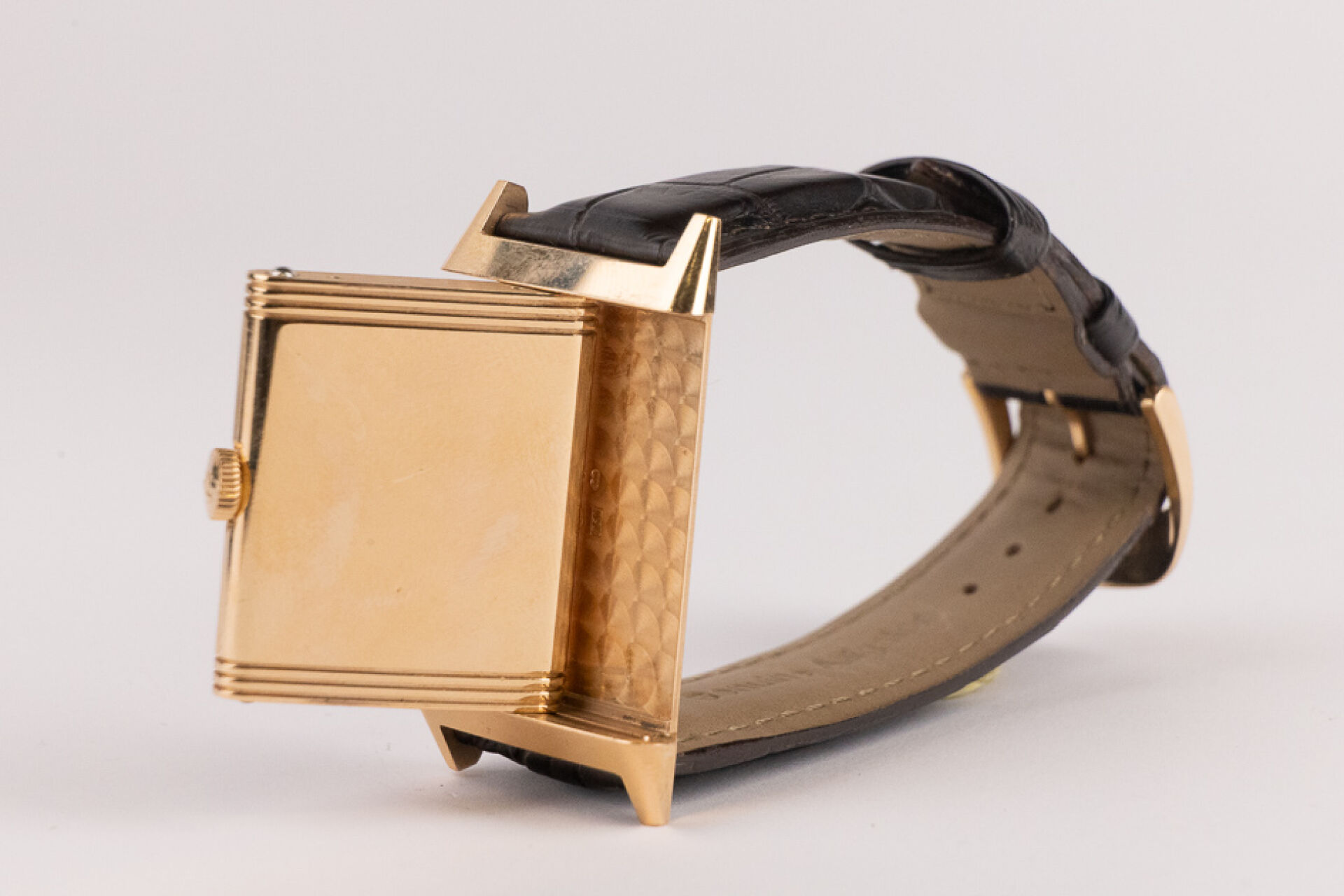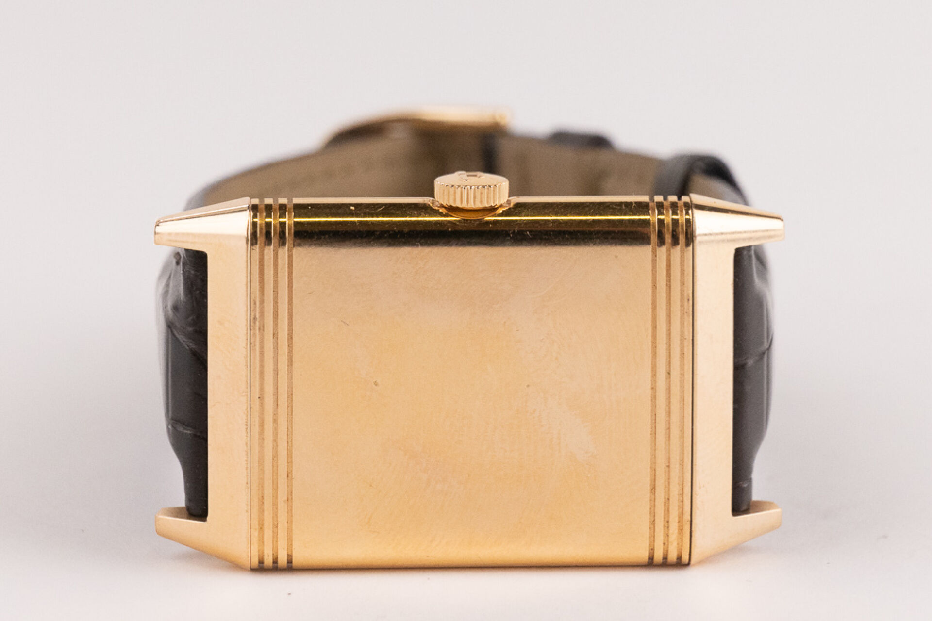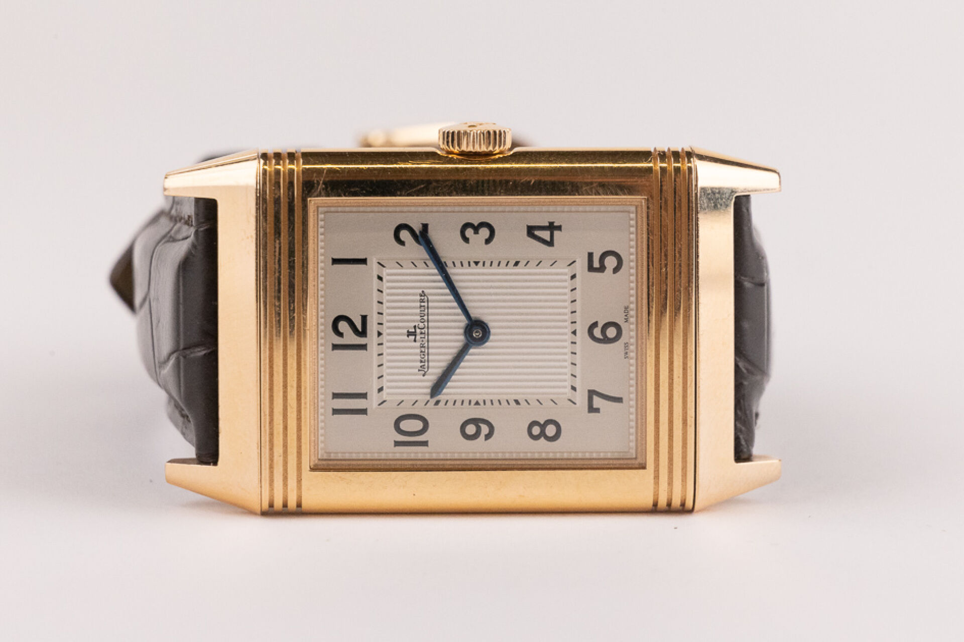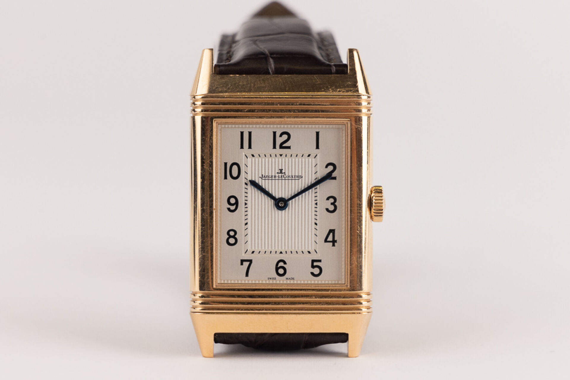 JAEGER-LECOULTRE, 2011 - Montre homme Reverso, boitier rectangulaire en or rose 18k (750 millièmes), cadran blanc, chiffre arabes, signé JEAGER LECOULTRE Reverso au dos, bracelet en cuir imitation croco noir, boucle ardillon signée en or rose 18k (750 millièmes), mouvement quartz ? Certificat de garantie Ref. 277.2.62 Dim. : 32 x 23 mm - Long. : 15,5 à 19 cm - Poids brut : 71,50 gr (micro rayures au dos) Conditions de vente spécifiques : Veuillez noter que toutes les montres sont vendues en l'état. Aucune garantie n'est faite sur l'état de marche, une révision est donc conseillée. Certaines montres ont été ouvertes pour identifier le type et la qualité du mouvement, y compris les montres résistantes à l'eau, il est donc conseillé à l'acheteur de consulter un horloger pour revoir l'étanchéité de la montre.