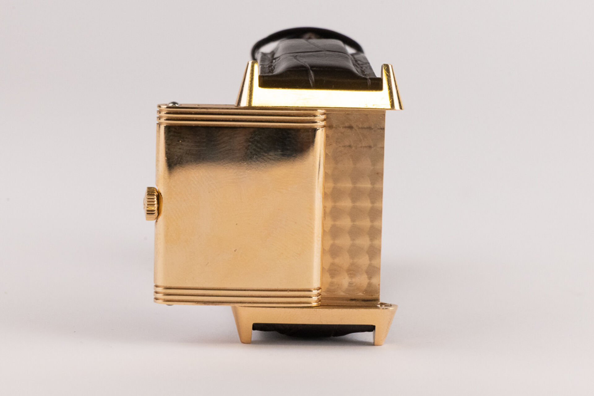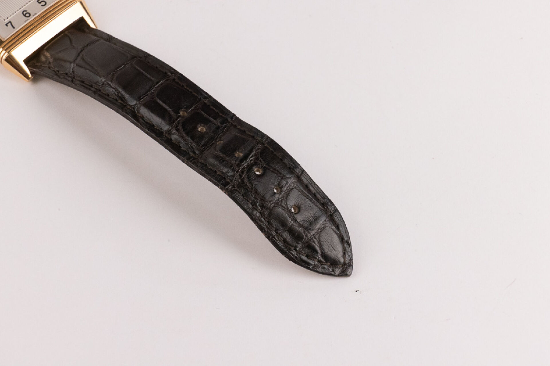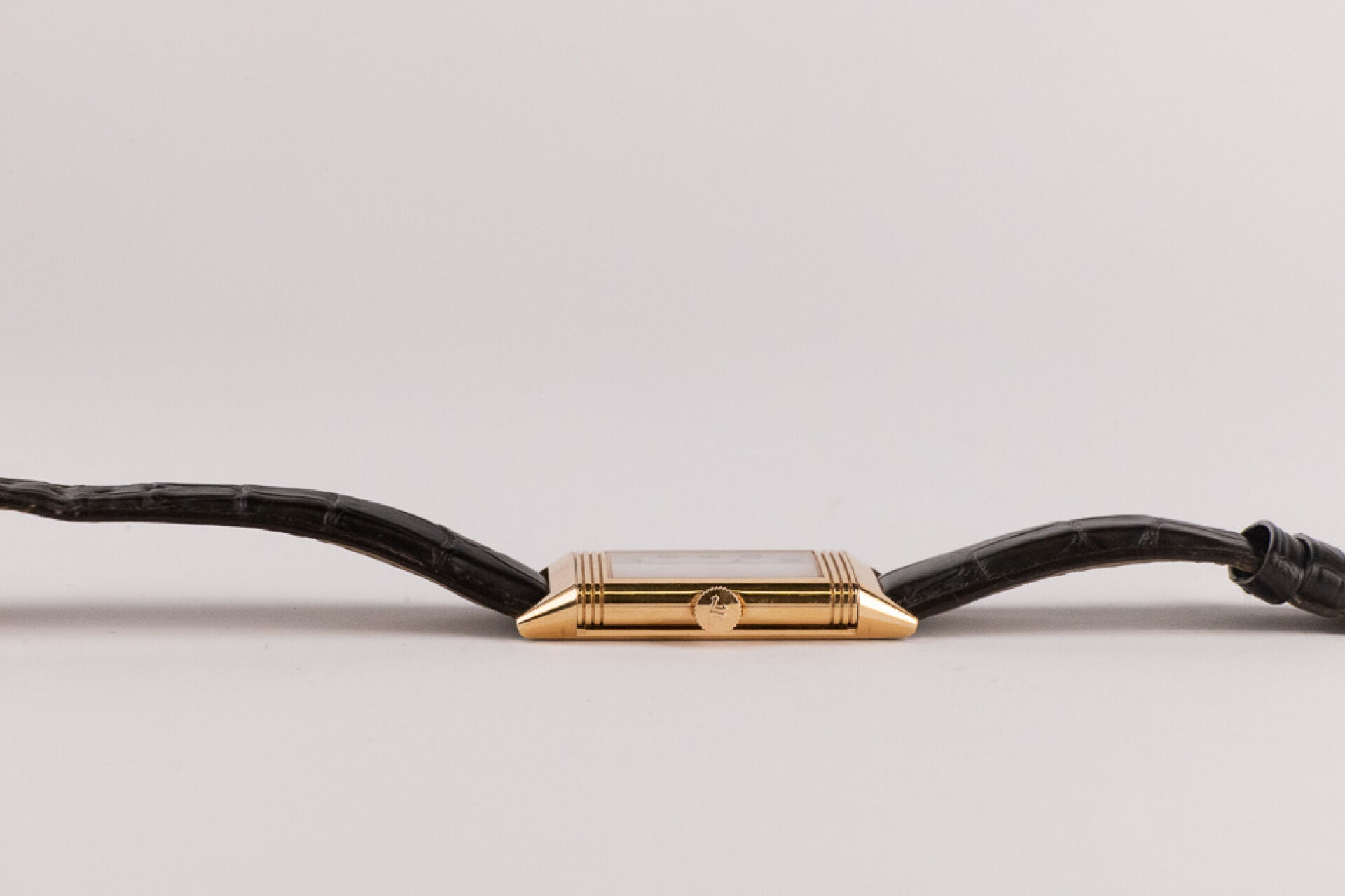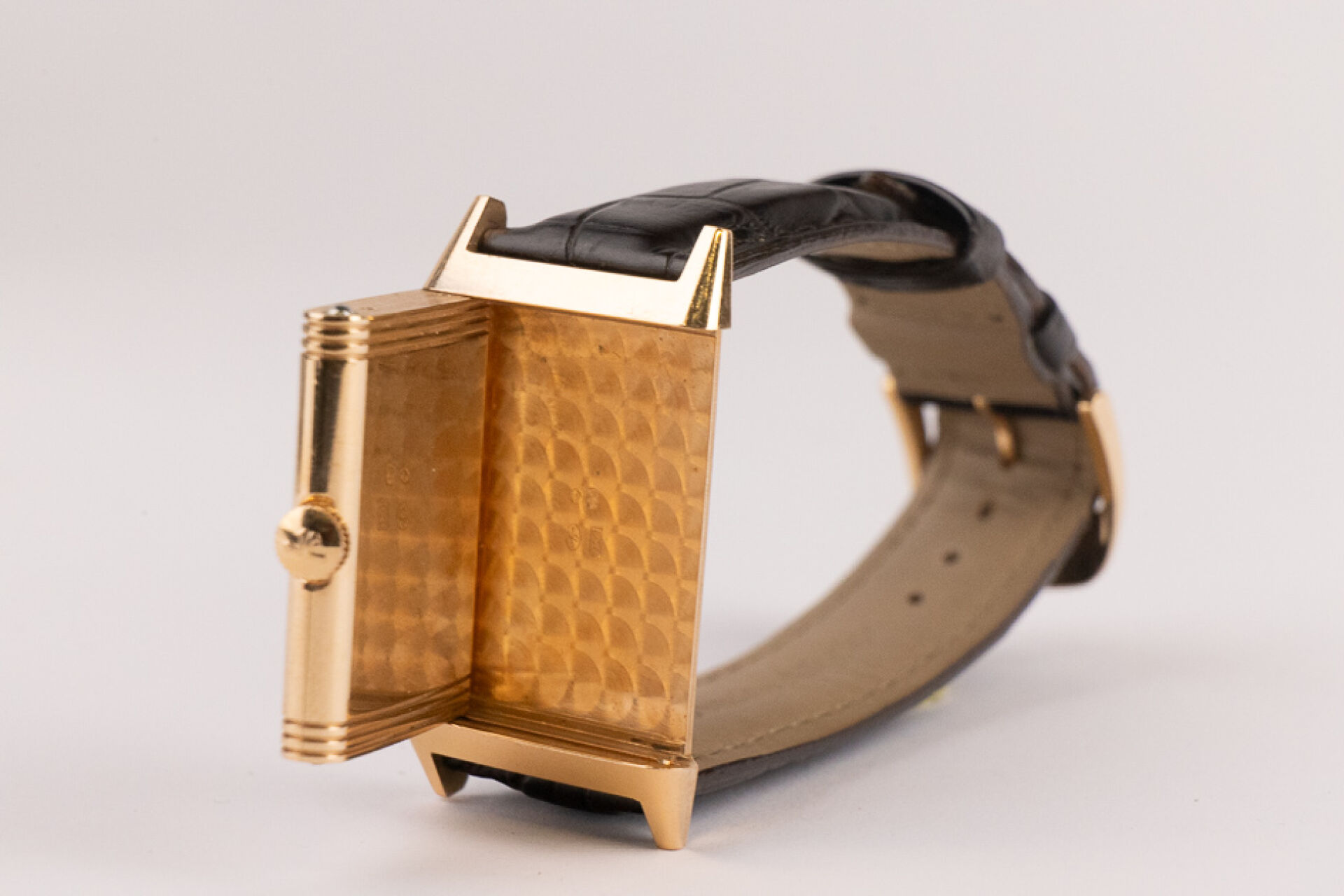 JAEGER-LECOULTRE, 2011 - Montre homme Reverso, boitier rectangulaire en or rose 18k (750 millièmes), cadran blanc, chiffre arabes, signé JEAGER LECOULTRE Reverso au dos, bracelet en cuir imitation croco noir, boucle ardillon signée en or rose 18k (750 millièmes), mouvement quartz ? Certificat de garantie Ref. 277.2.62 Dim. : 32 x 23 mm - Long. : 15,5 à 19 cm - Poids brut : 71,50 gr (micro rayures au dos) Conditions de vente spécifiques : Veuillez noter que toutes les montres sont vendues en l'état. Aucune garantie n'est faite sur l'état de marche, une révision est donc conseillée. Certaines montres ont été ouvertes pour identifier le type et la qualité du mouvement, y compris les montres résistantes à l'eau, il est donc conseillé à l'acheteur de consulter un horloger pour revoir l'étanchéité de la montre.
