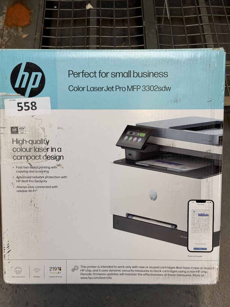 IMPRIMANTE HP COLOR LASER JET PRO MFP 3302 SDW 196786388484 (avec scellés) (expédition sur devis) Lot issu de colis non réclamés : état de fonctionnement non garanti.
