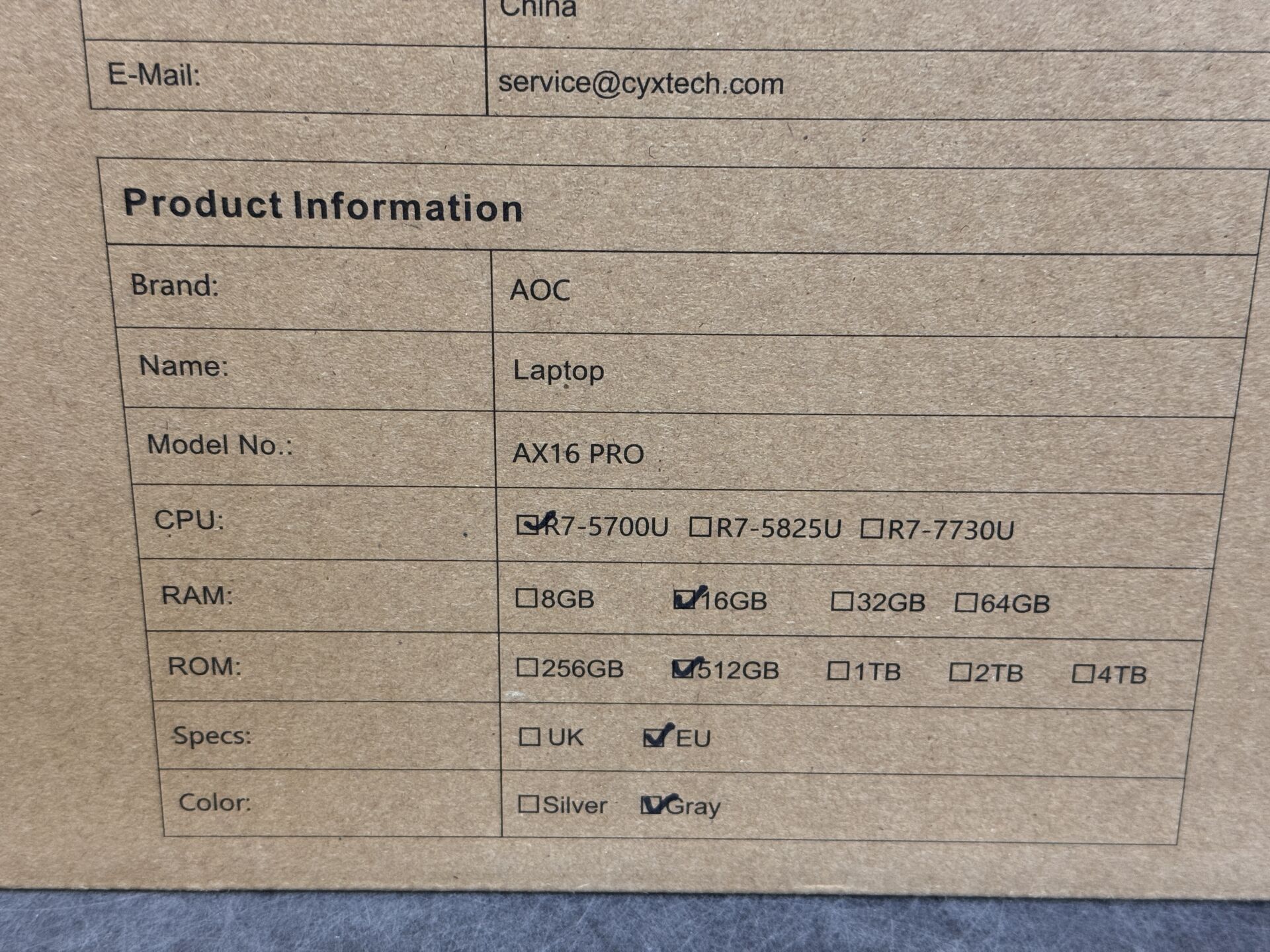 PC PORTABLE AOC AX 16PRO RYZEN 7 5700 16/512GB (avec scellés) EXPEDITION POSSIBLE (ce lot chez vous en France métropolitaine pour 30,64€) Lot issu de colis non réclamés : état de fonctionnement non garanti.