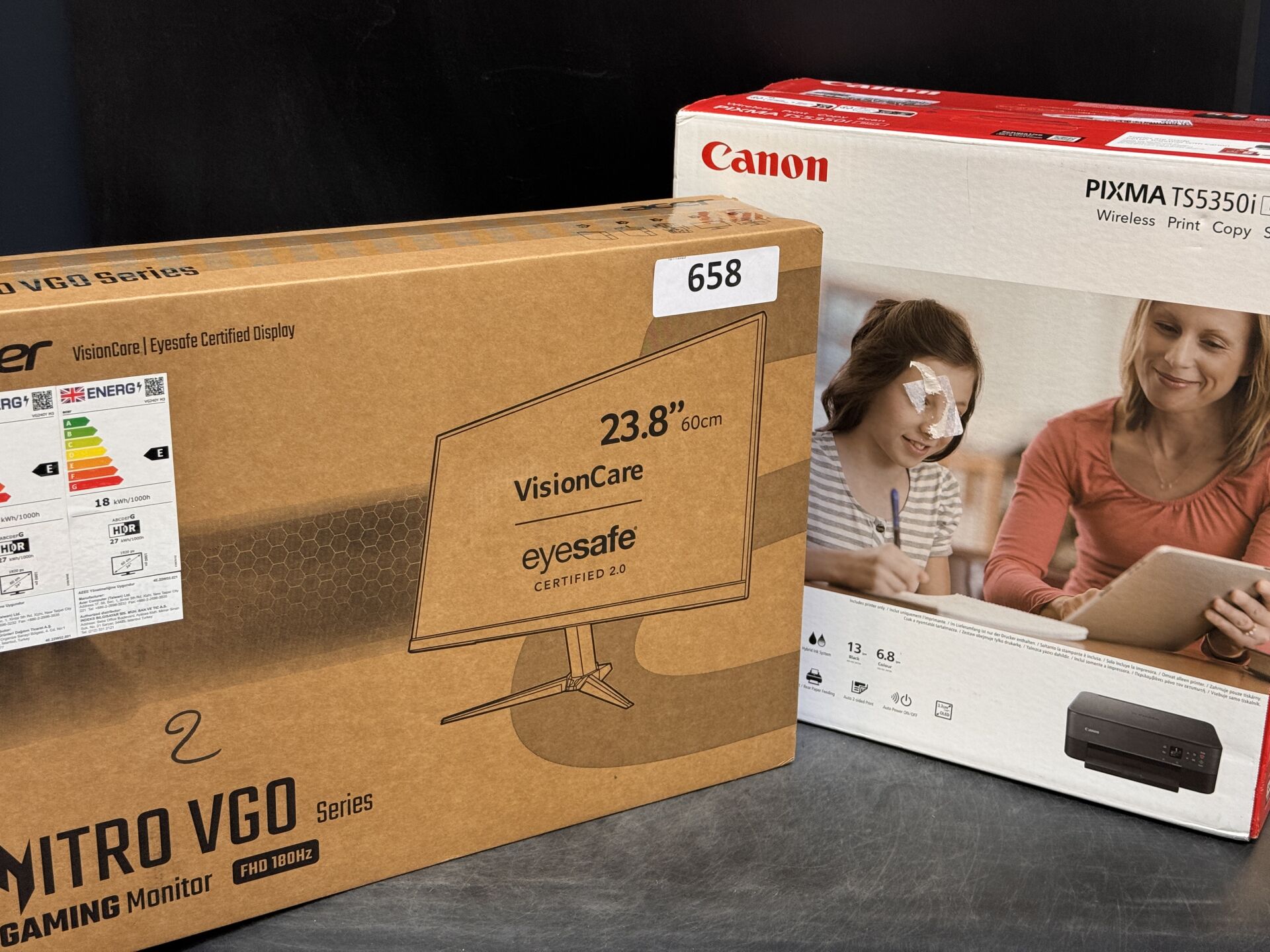 MONITEUR ACER 23,8" NITRO VG240Y M3 (avec scellés) + IMPRIMANTE CANON PIXMA TS5350i (expédition sur devis) Lot issu de colis non réclamés : état de fonctionnement non garanti.