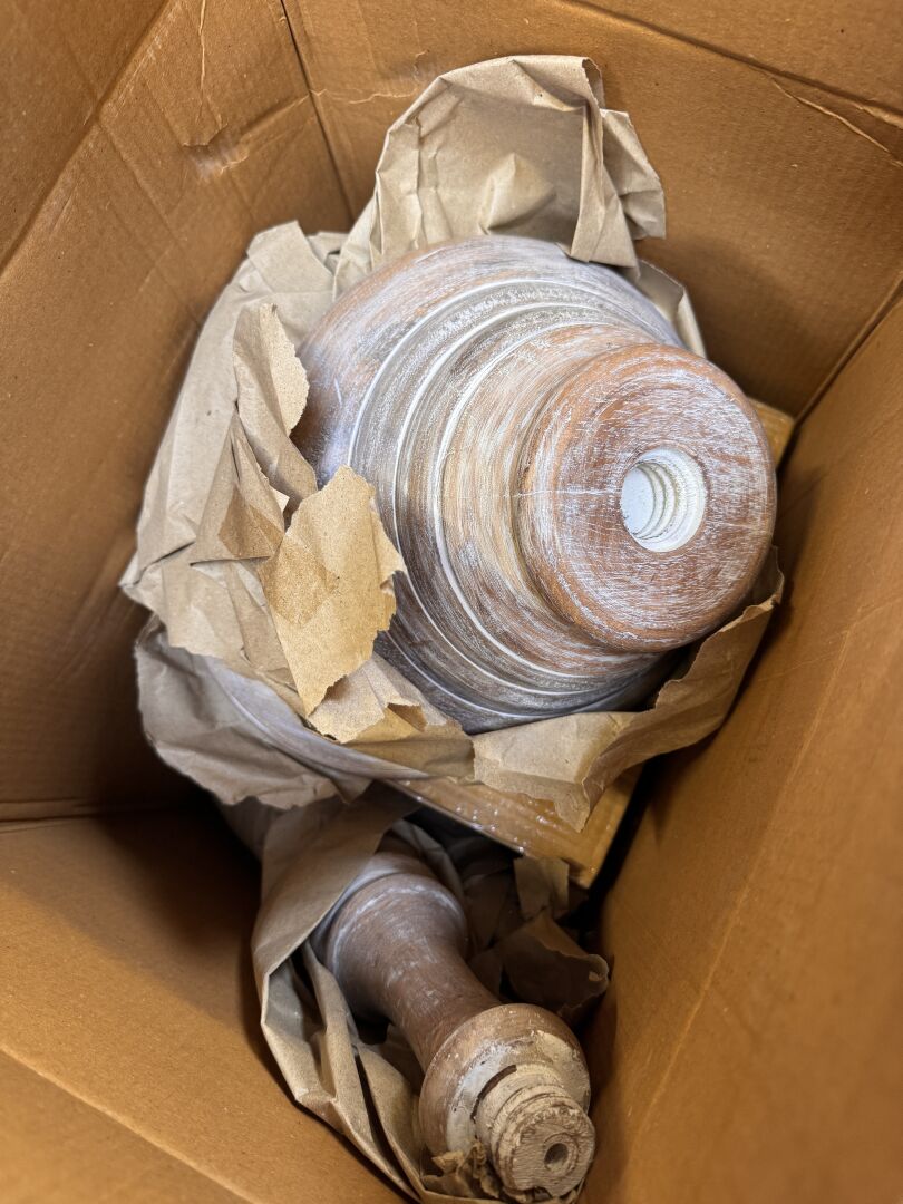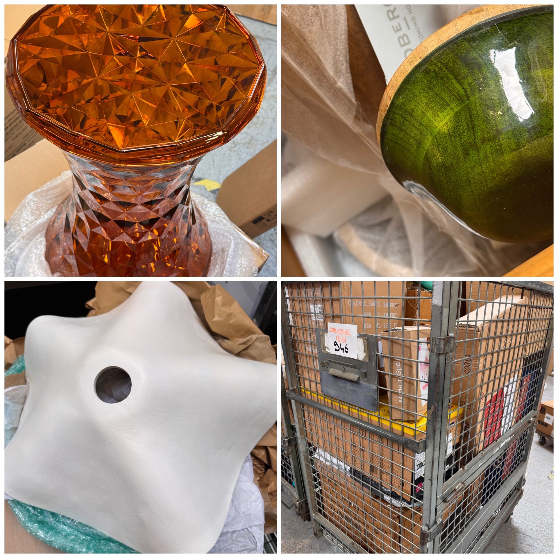 FORT ENSEMBLE DE PETITS MOBILIERS ET DECORATIONS (environ 1m3) DONT TABOURET, RANGE-BUCHES, MIROIR (expédition sur devis) Lot issu de colis non réclamés : état de fonctionnement non garanti.