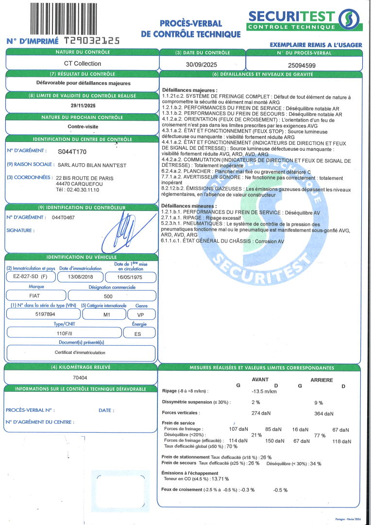 BVM- SIMILI CUIR ROUGE. LEGERES RAYURES ET TRACES DE CORROSION. DEFAILLANCES MAJEURES: DEFAUT DU SYSTEME DE FREINAGE ARG- DESEQUILIBRE DU FREIN DE SERVICE AR- DEFAUT D'ORIENTATION DU FEU DE CROISEMENT AVG- VISIBILITE FORTEMENT REDUITE DU FEU STOP ARG- DEFAUT DES CLIGNOTANTS AVG, AVD, ARG ET ARD- FEUX DE SIGNAL DE DETRESSE- TOTALEMENT INOPERANT- PLANCHER C GRAVEMENT DETERIORE- AVERTISSEUR SONORE TOTALEMENT INOPERANT-DEFAUT DES EMISSIONS GAZEUSES. DEFAILLANCES MINEURES: DESEQUILIBRE DU FREIN DE SERVICE AV- RIPAGE EXCESSIF- 4 PNEUS SOUS GONFLES- CORROSION DU CHASSIS AV. FRAIS VOLONTAIRES 18 % HT