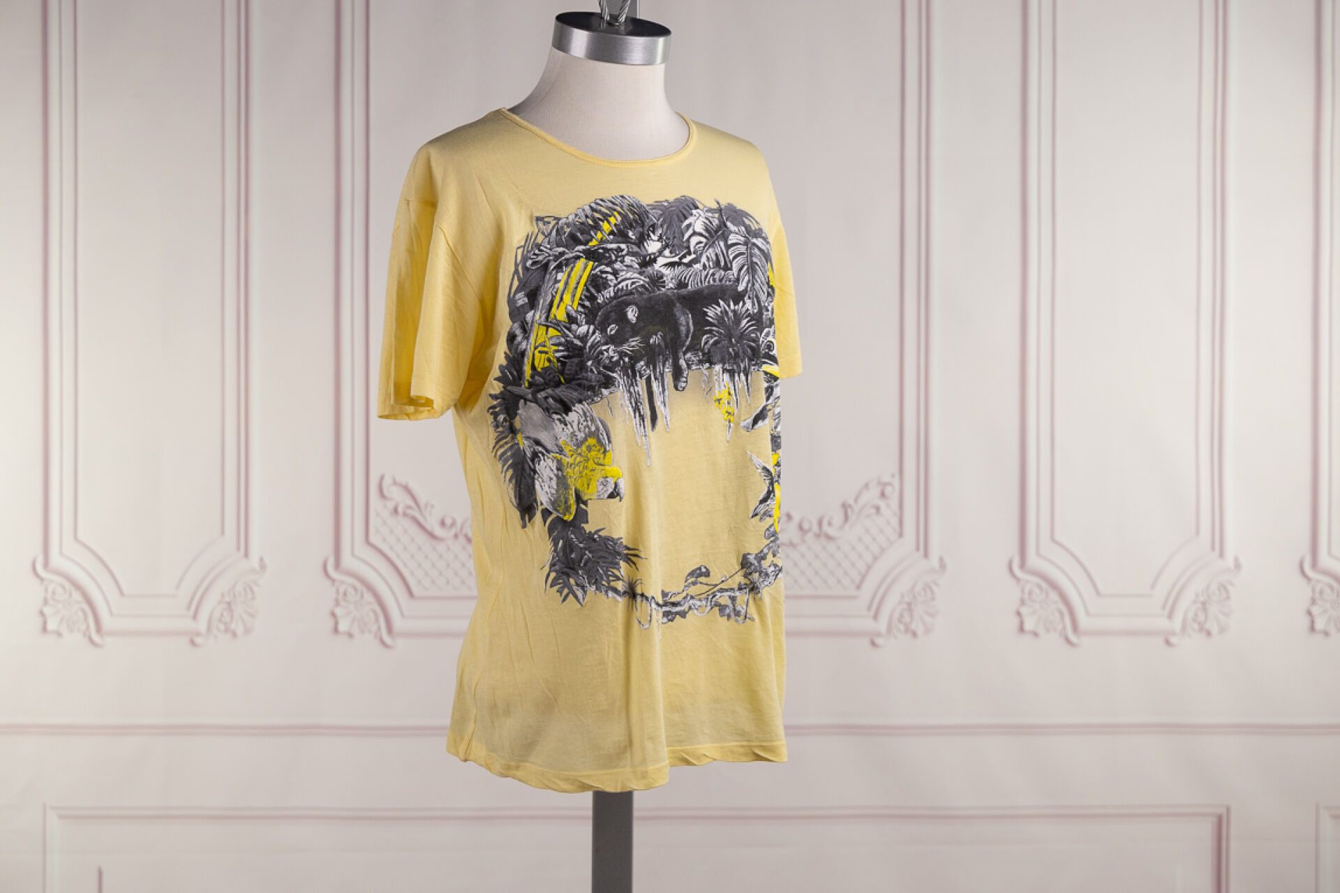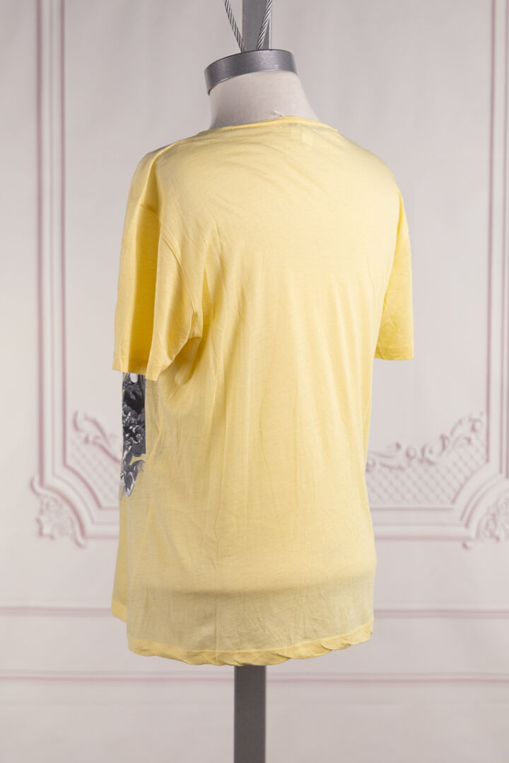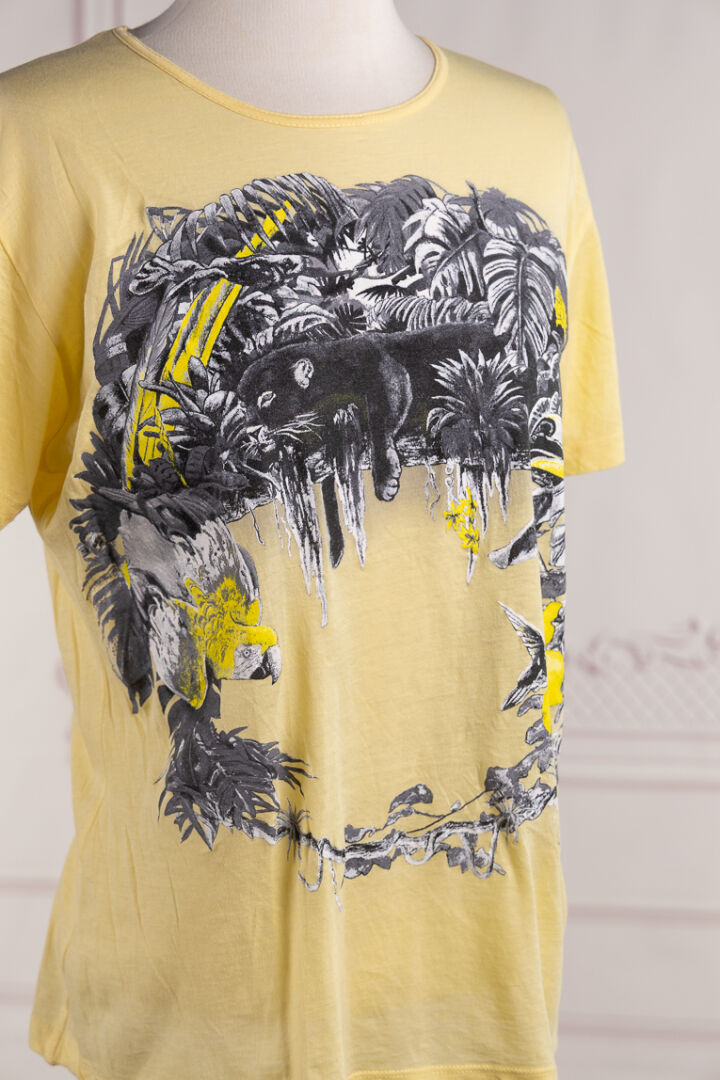 BALENCIAGA - T-shirt en coton jaune imprimée de d'animaux et de végétation, manches courtes, col rond. Taille indiquée M Déjà porté