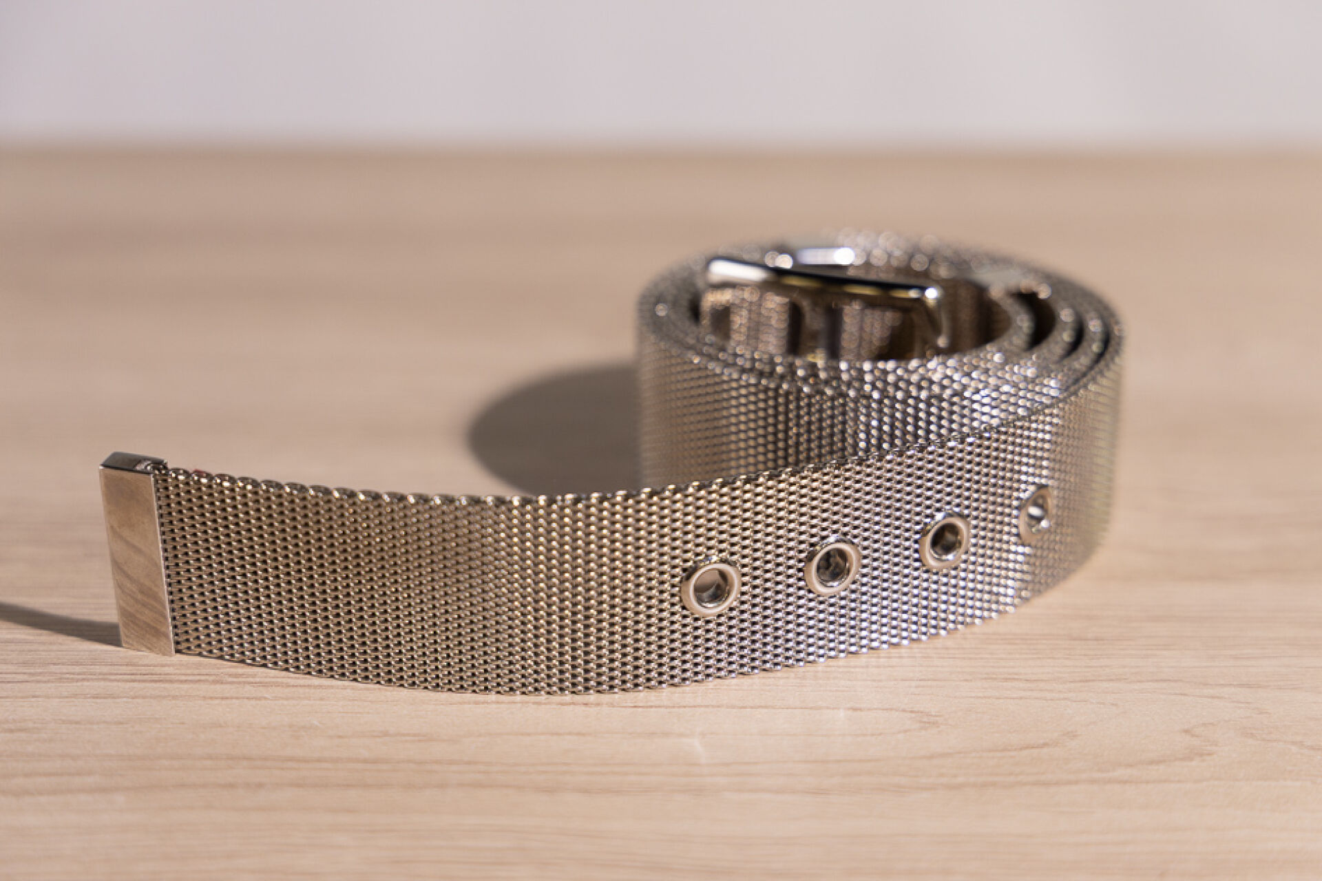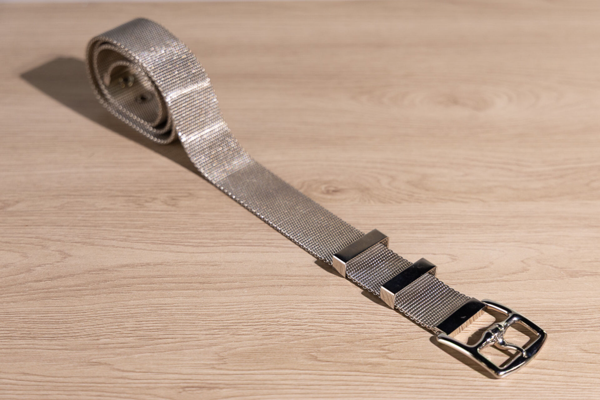 HERMÈS Made in France - Ceinture étrivière, boucle et passants en métal argenté sur maille métallique. (Bel état, infimes griffures d'usage.) Taille indiquée 85.