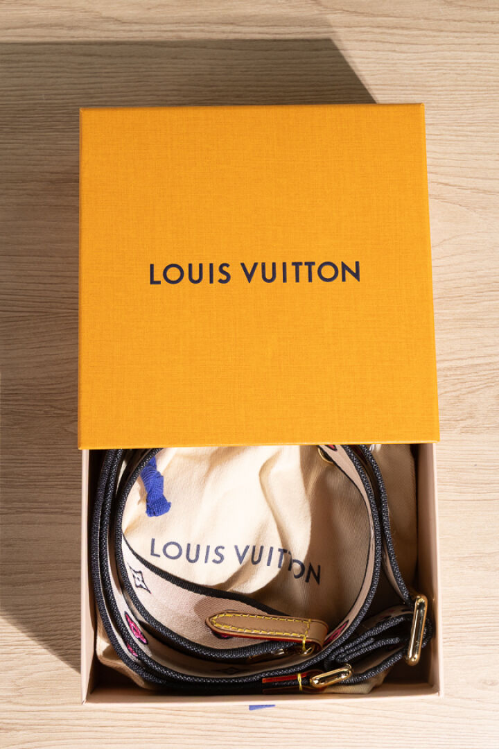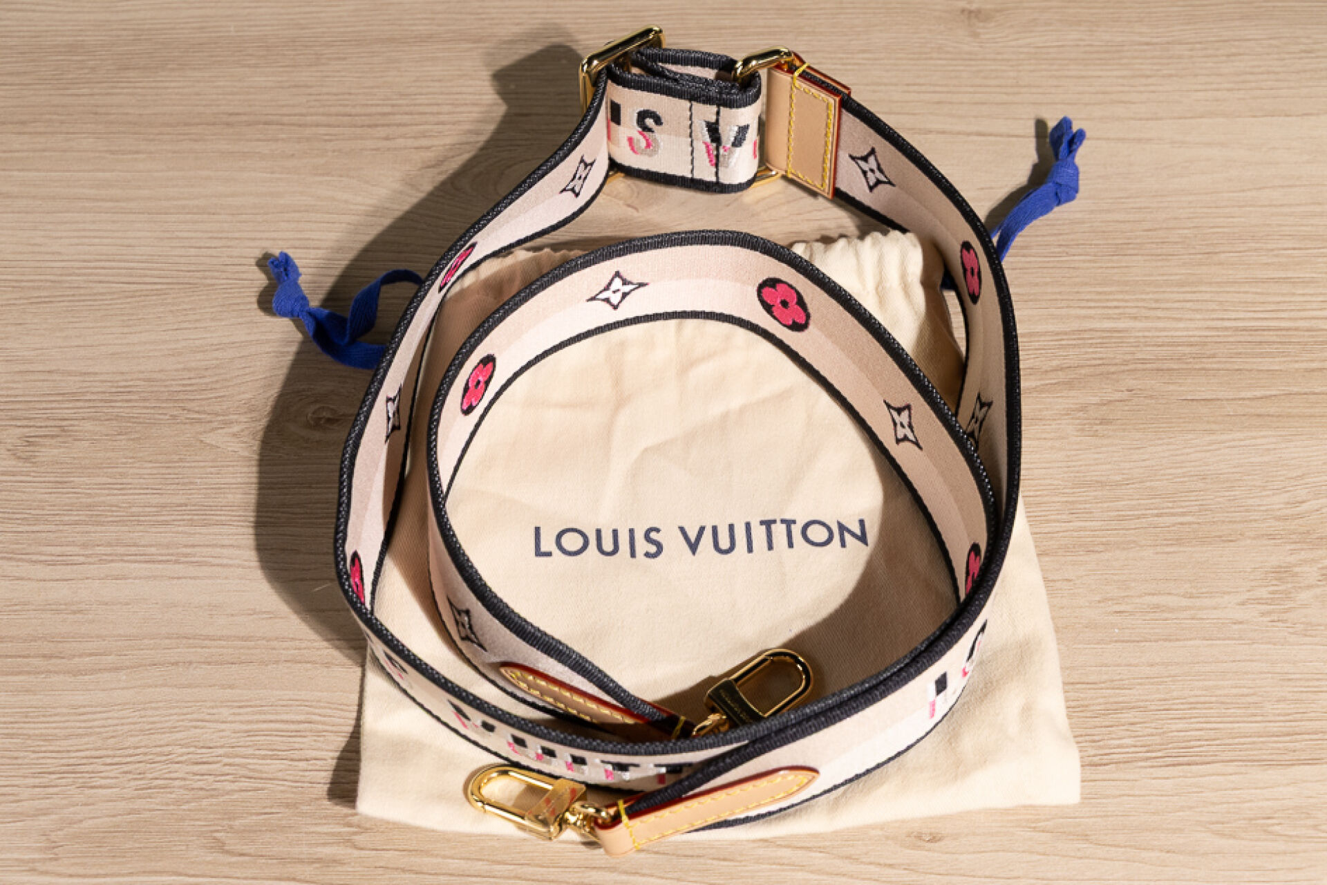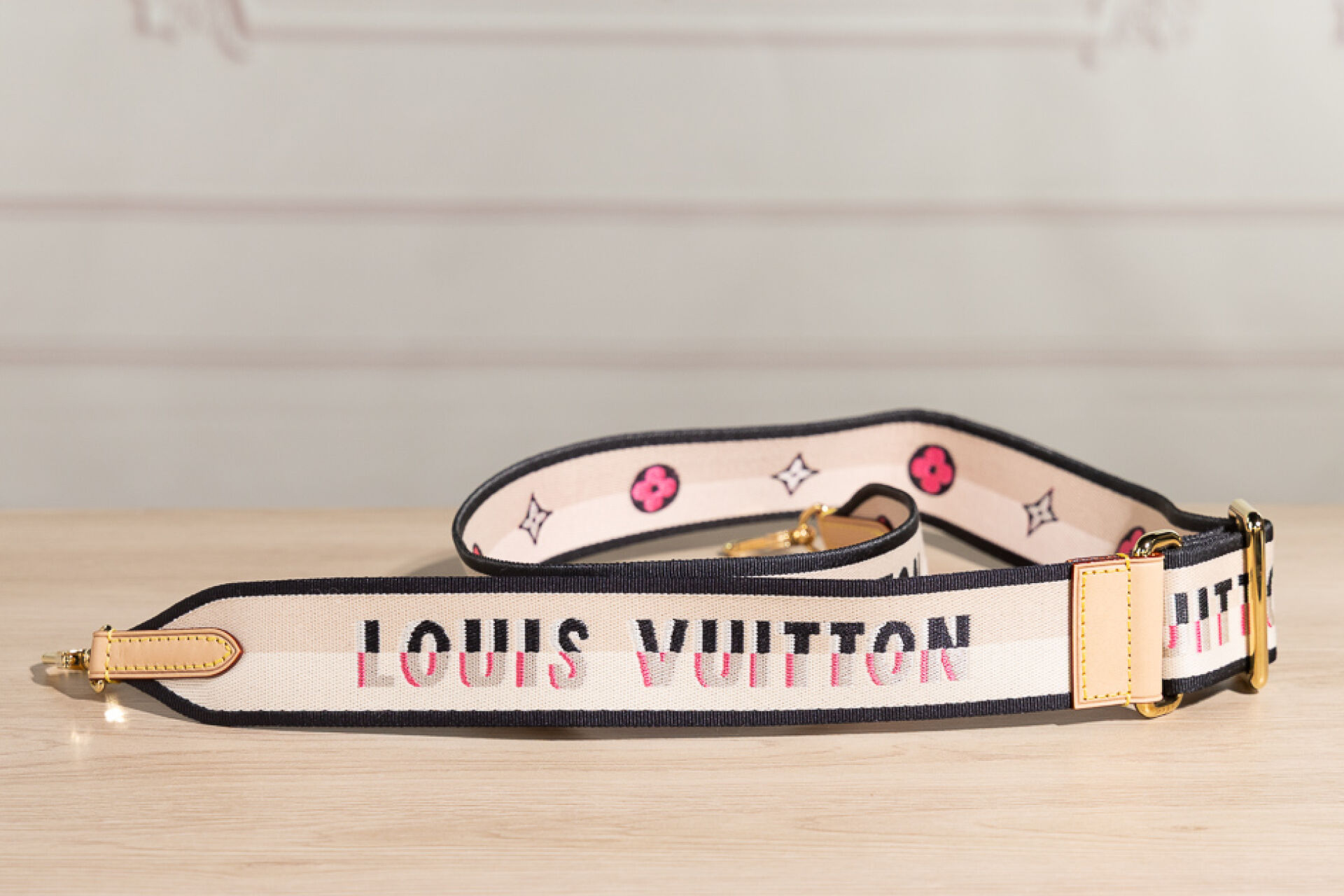 LOUIS VUITTON - Anse bandoulière amovible réglable, sangle signée au Monogram noir, beige, rose et cuir naturel. Housse et boite
