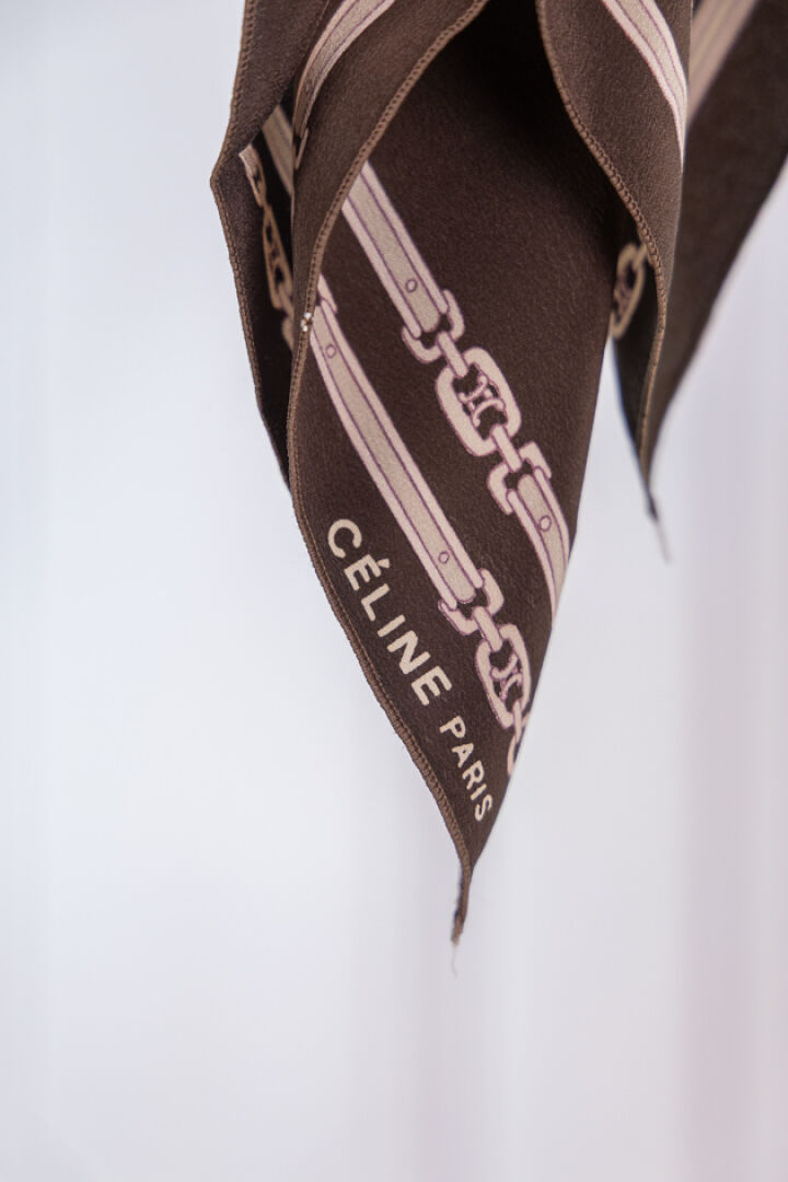 CELINE - Lot de quatre petits carrés en soie imprimée à motif d'anneaux, sangles, cordages à dominante bordeaux/beige, bordeaux/marine, marron/beige et beige sur fond crème et roulotté rouge.