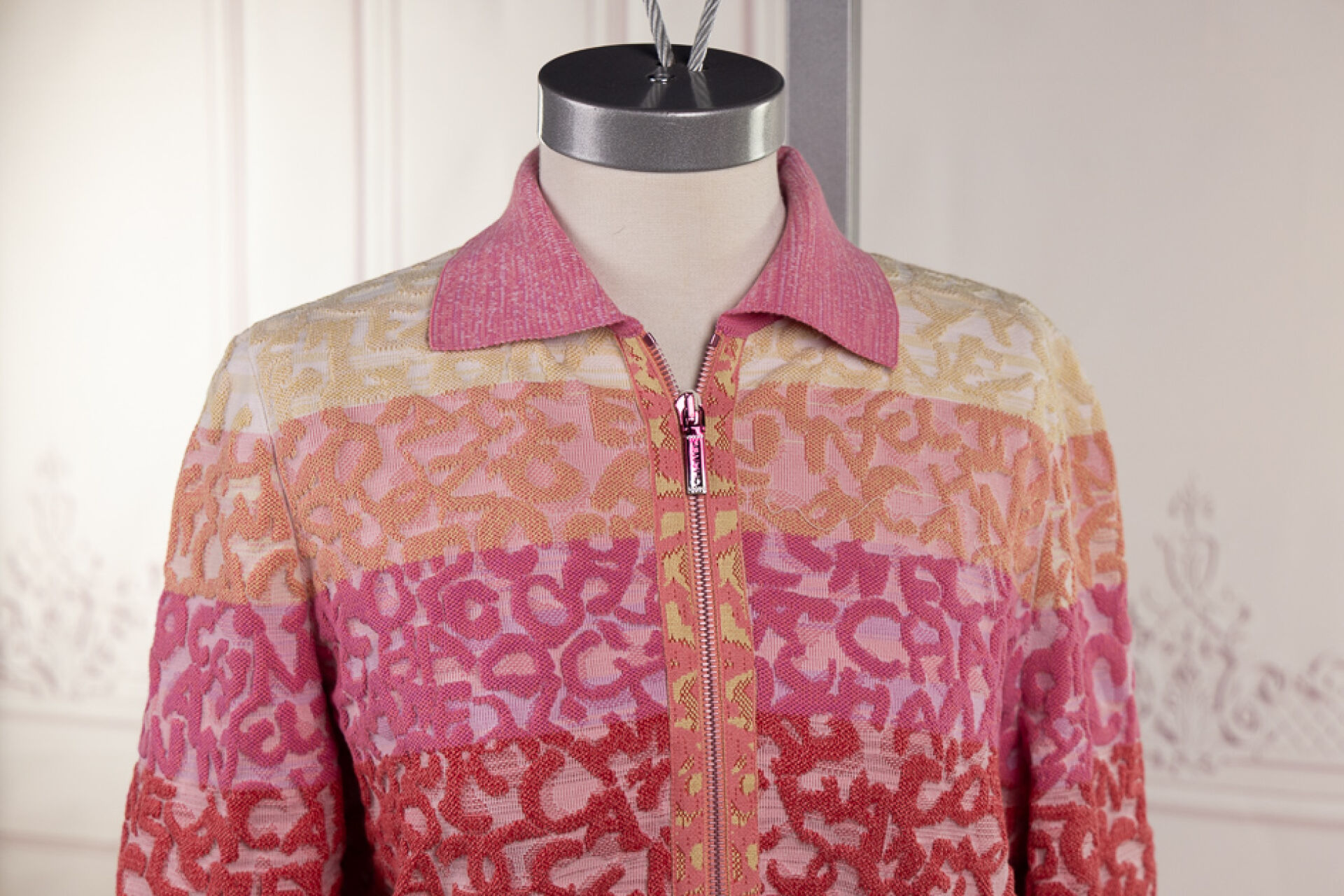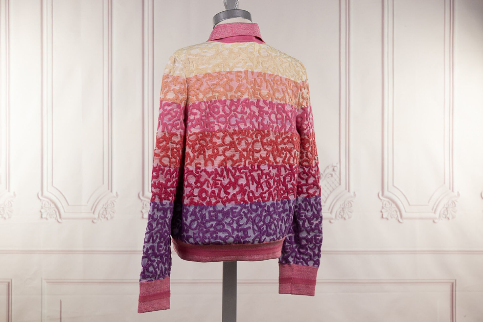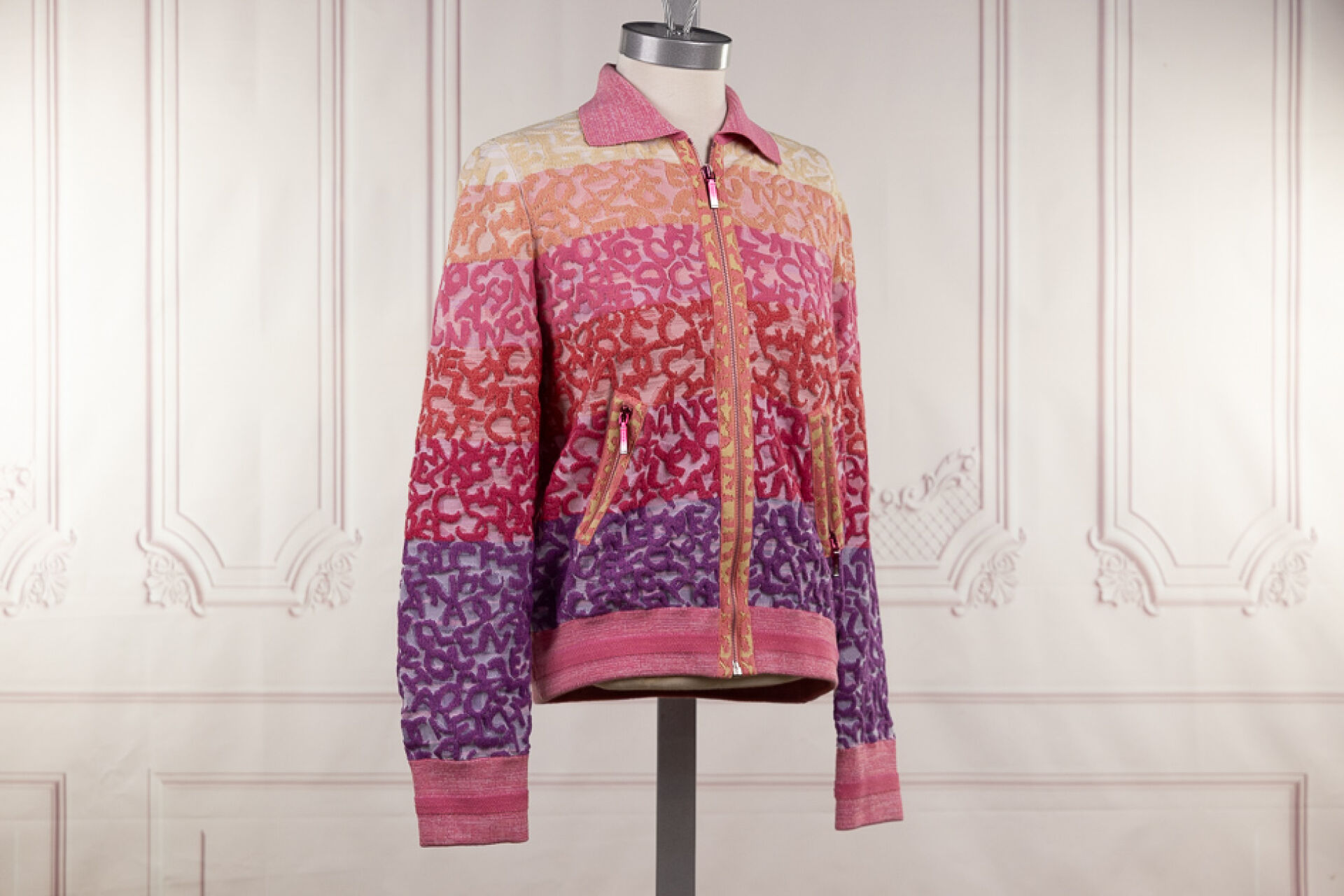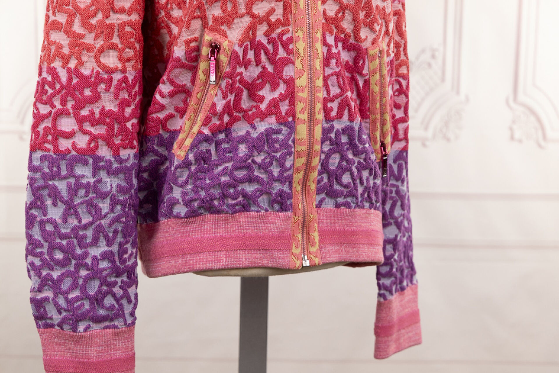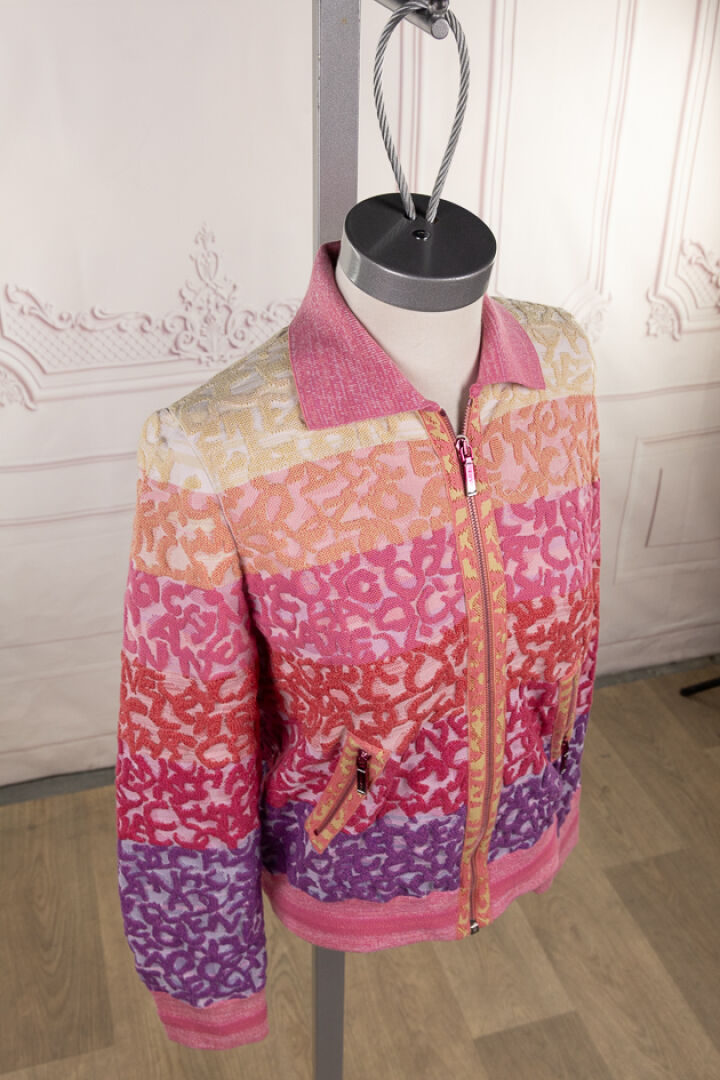 CHANEL - Blouson cardigan rayé rose, orange, jaune, parme en coton stretch maille inversée chinée, col, fermeture à glissière, manches longues, deux poches zippées en biais. Taille indiquée 40 Très bon état