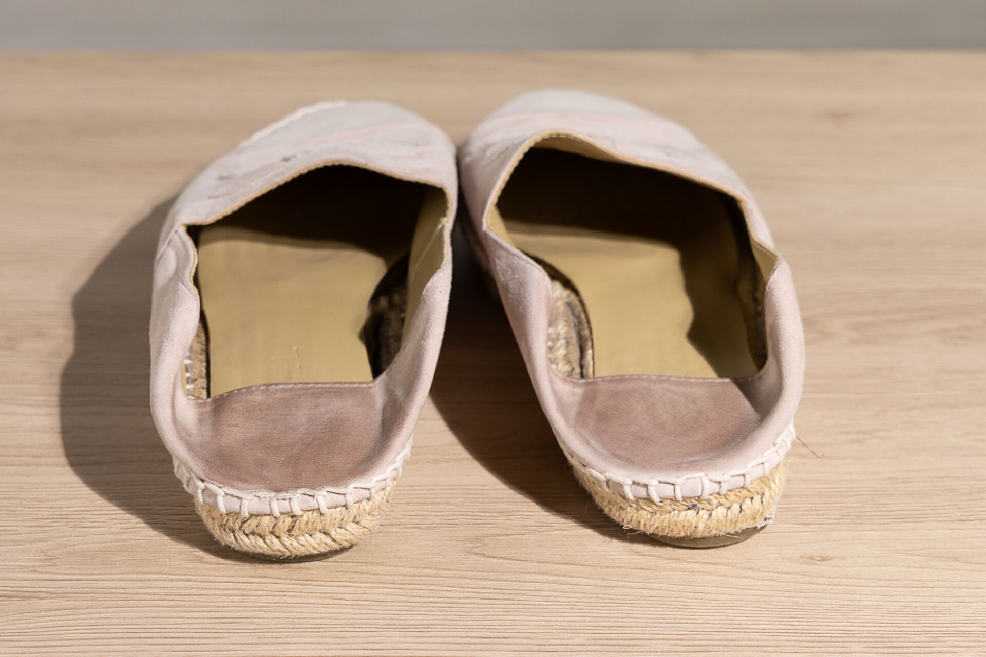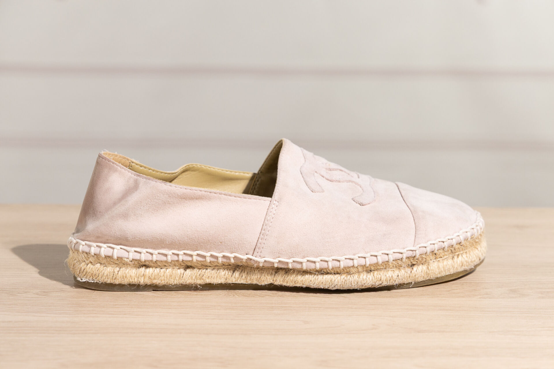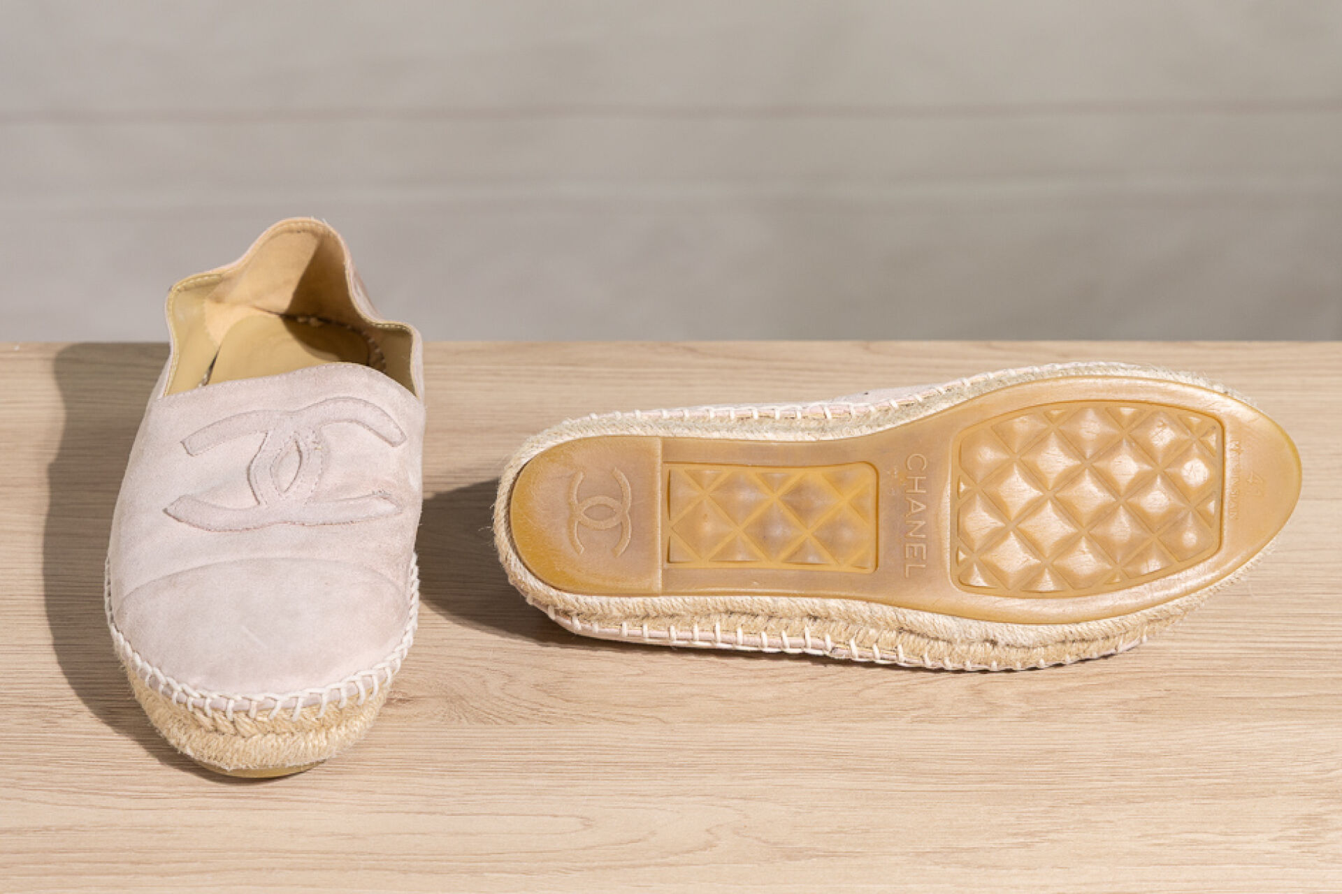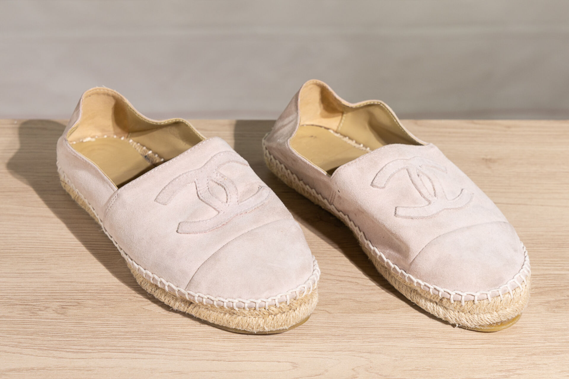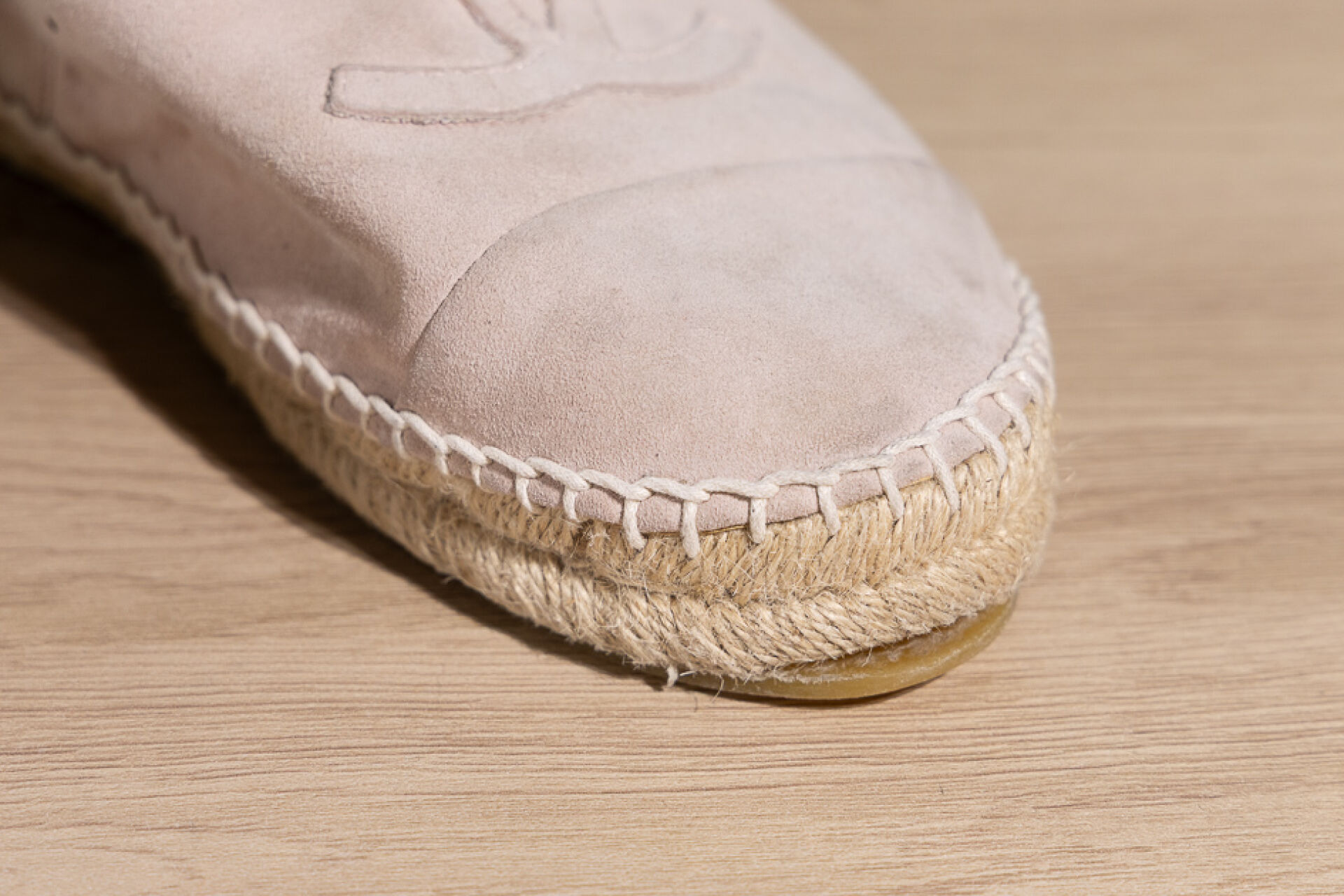 CHANEL - Paire d'espadrilles en daim rose très clair, empeigne rehaussée du sigle surpiqué. Pointure 41 En l'état