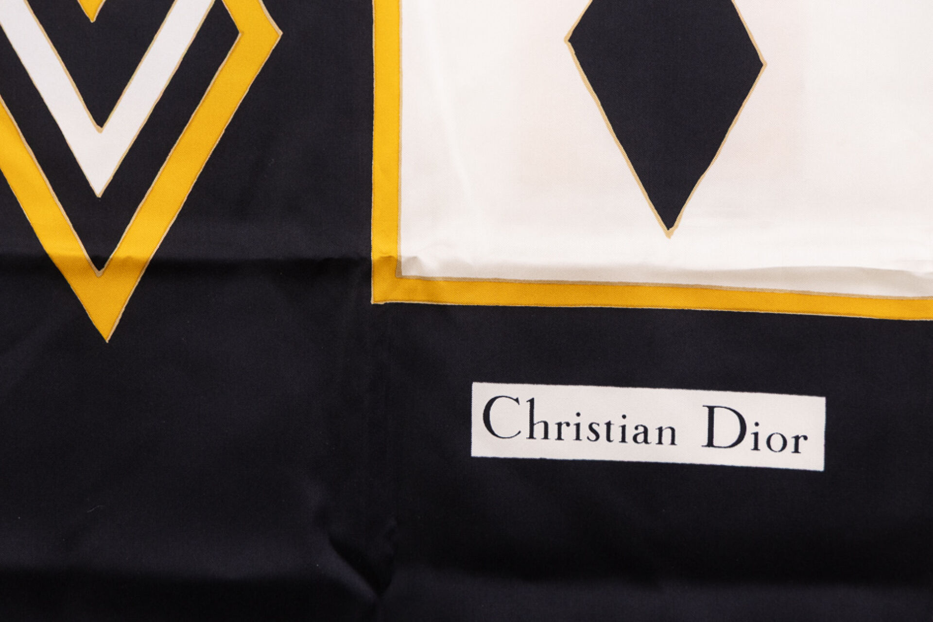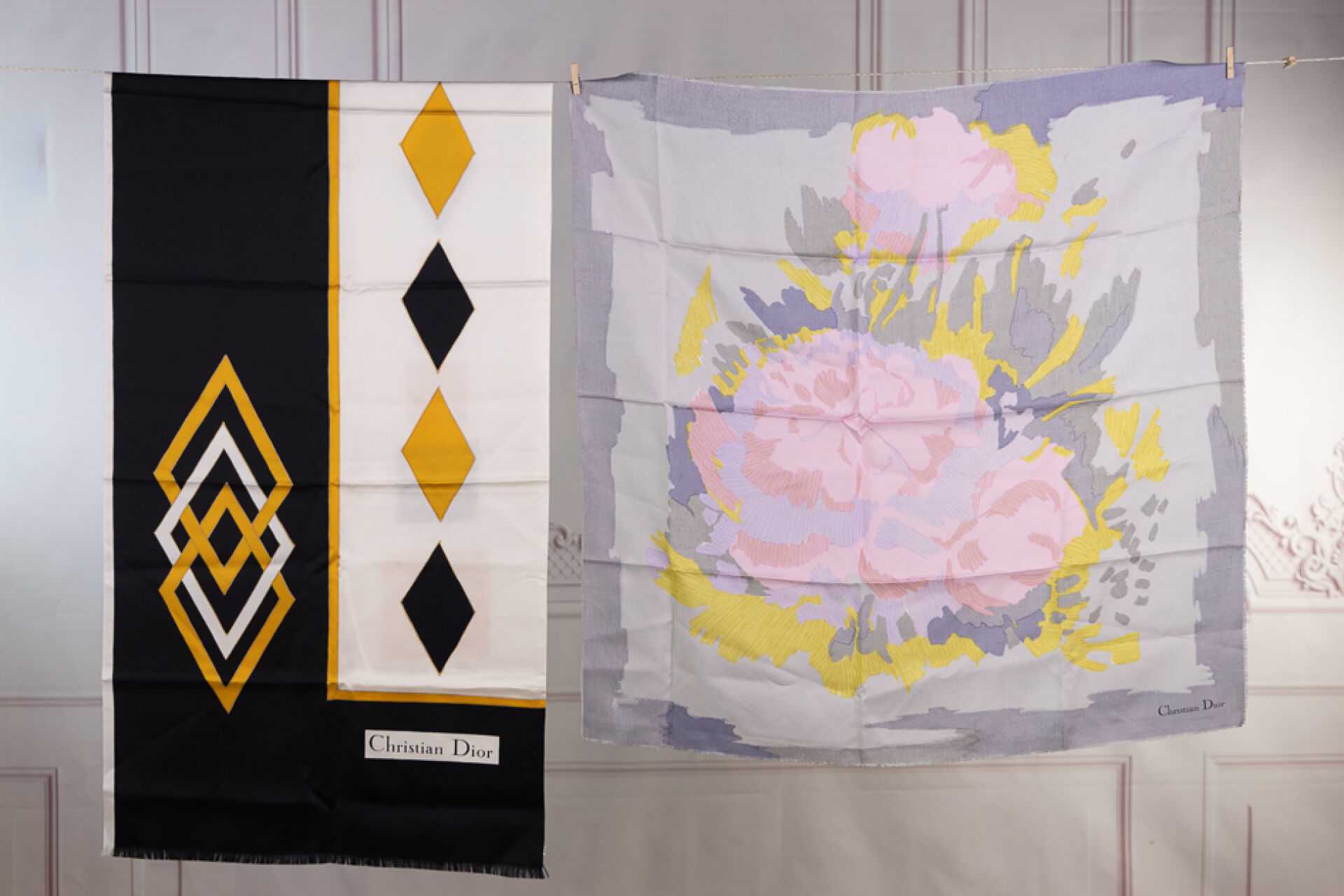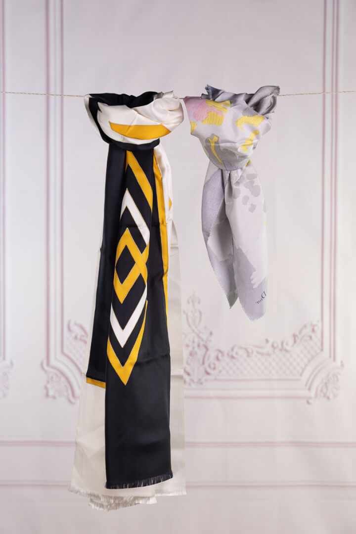 CHRISTIAN DIOR - Lot composé d'une écharpe en soie à motifs losanges noirs, ocre et blanc et un carré en soie imprimée à motif floral stylisé gris, rose et vert. Bon état