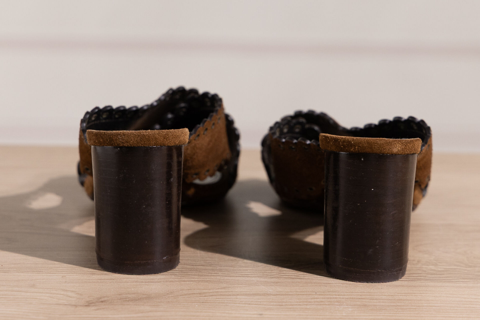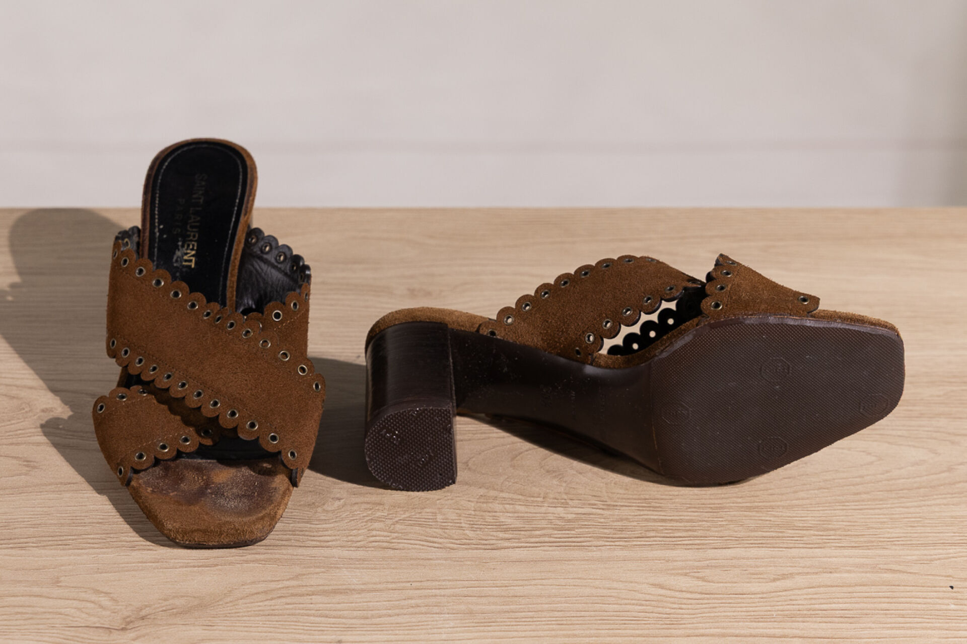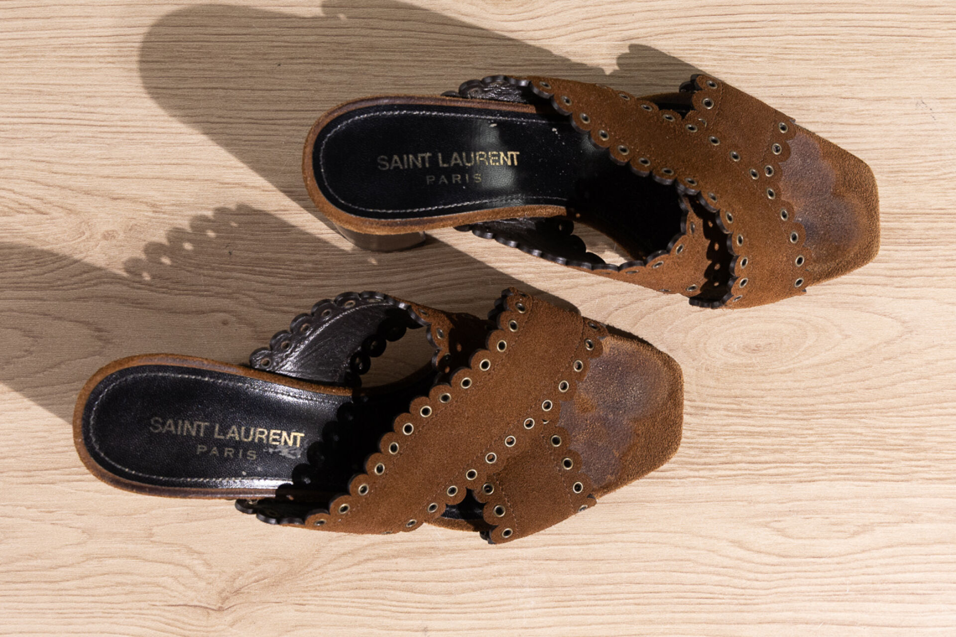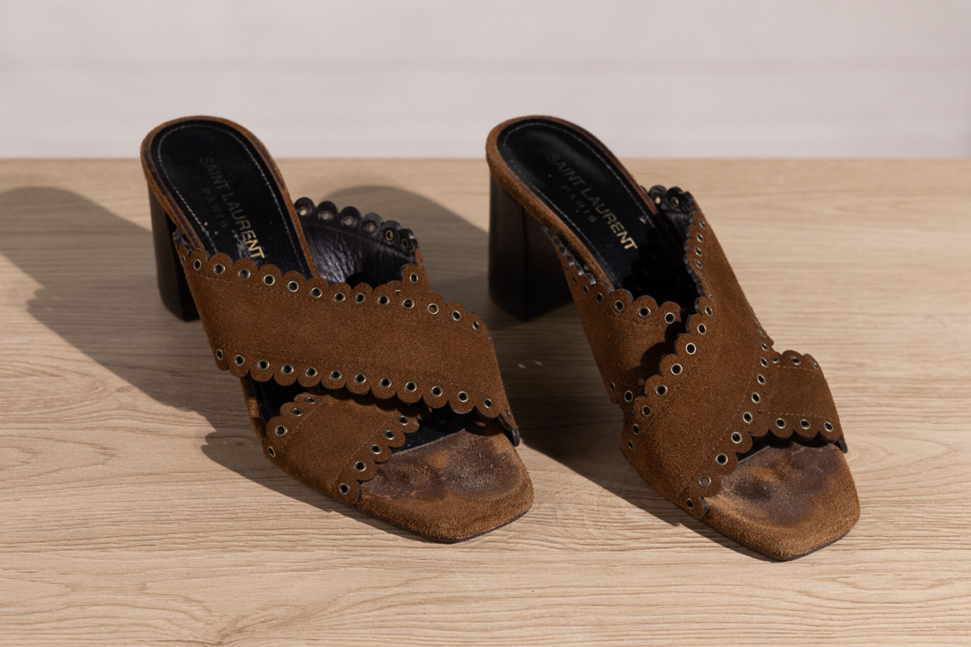 SAINT LAURENT Paris - Paire de nu pieds à talon, lanières de daim marron croisées perforées. Pointure 35,5 - Haut du talon : 6.5 cm Demi-semelle non d'origine