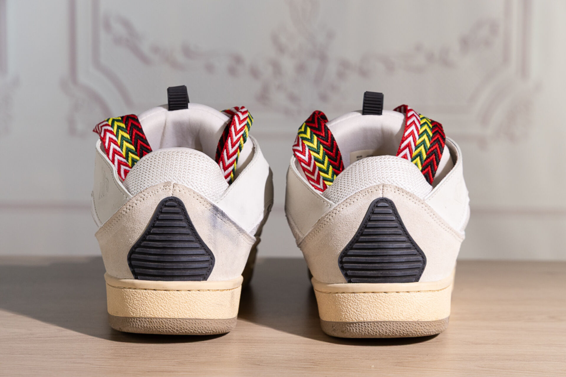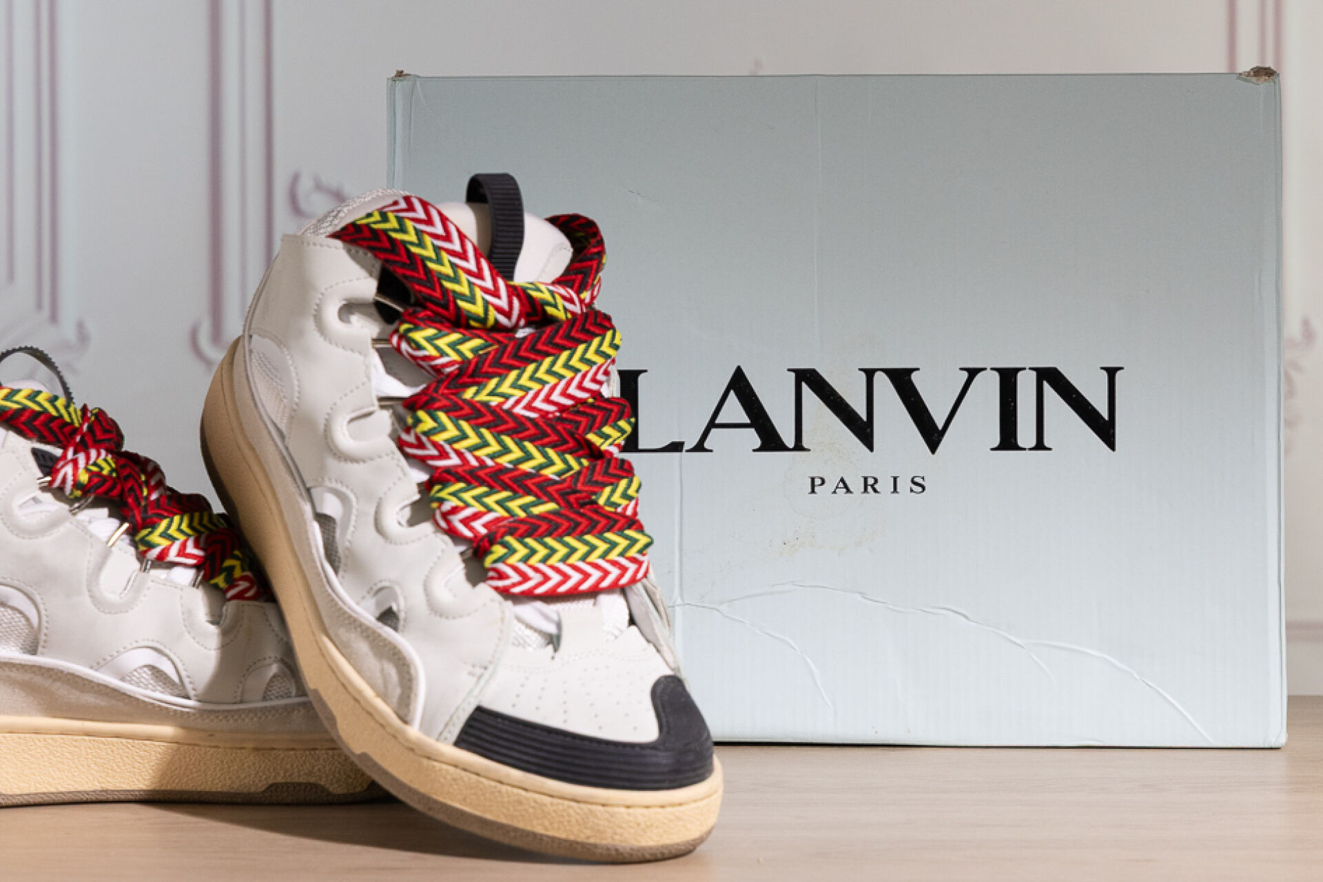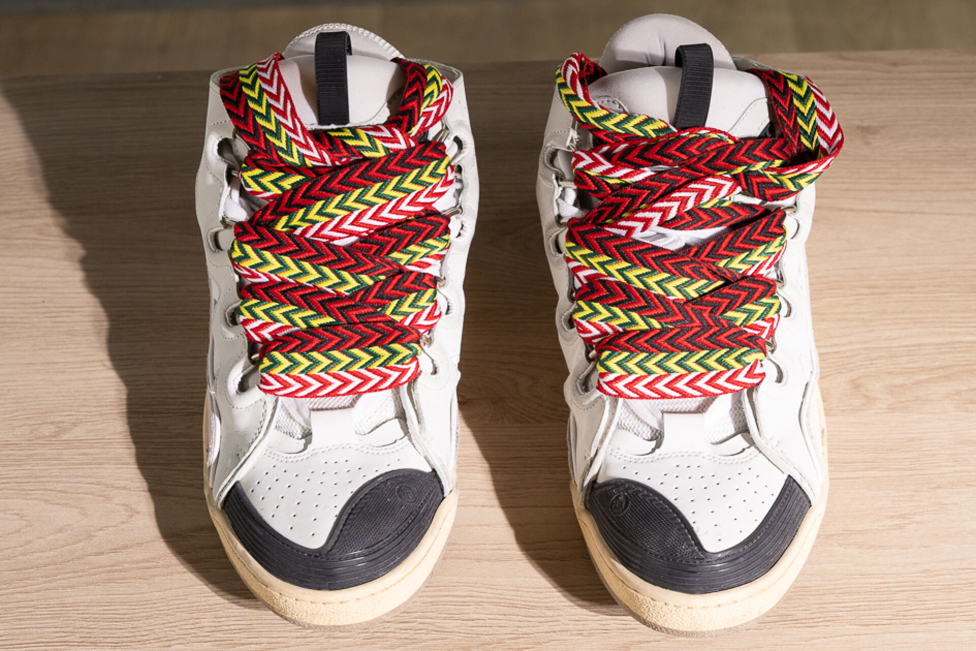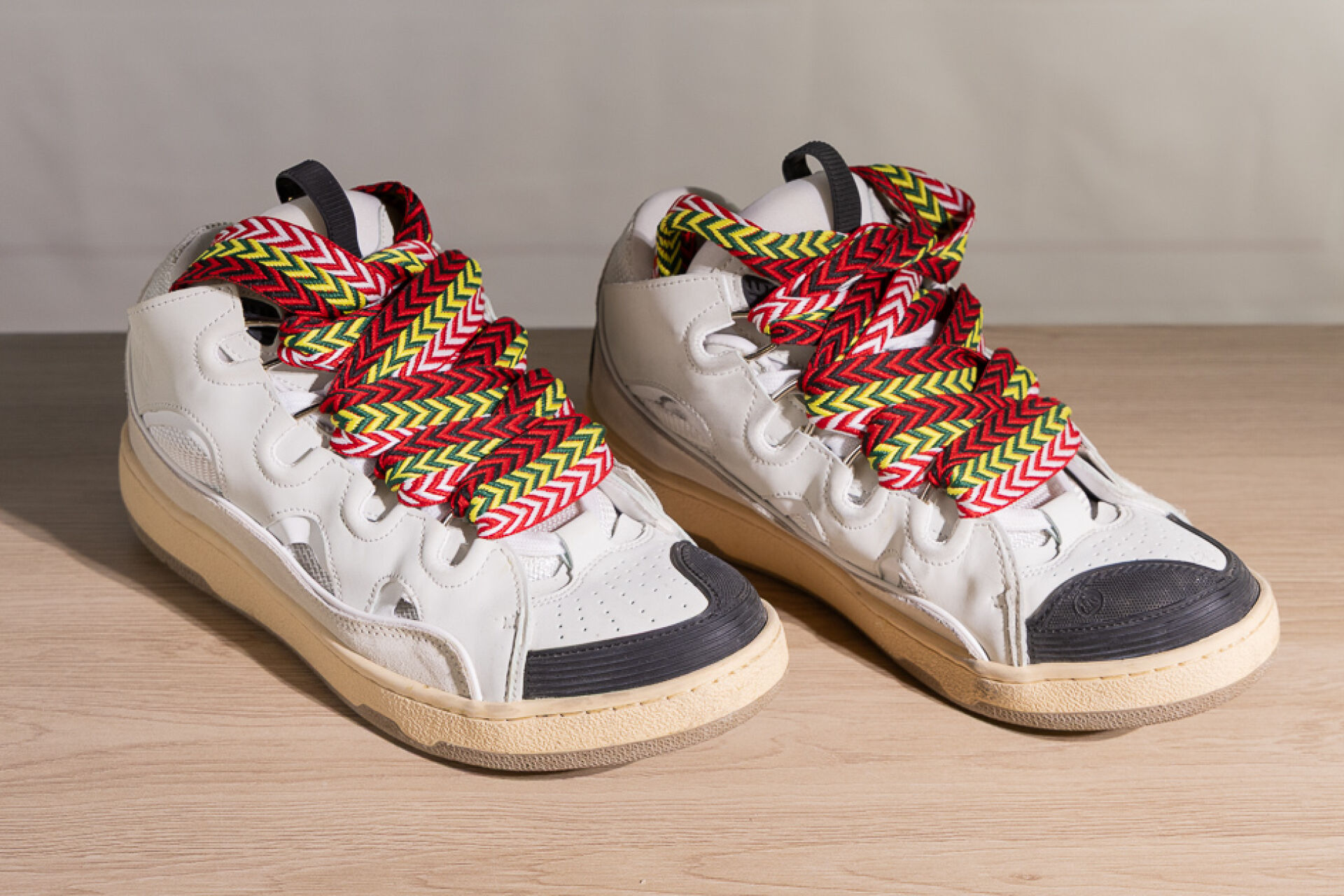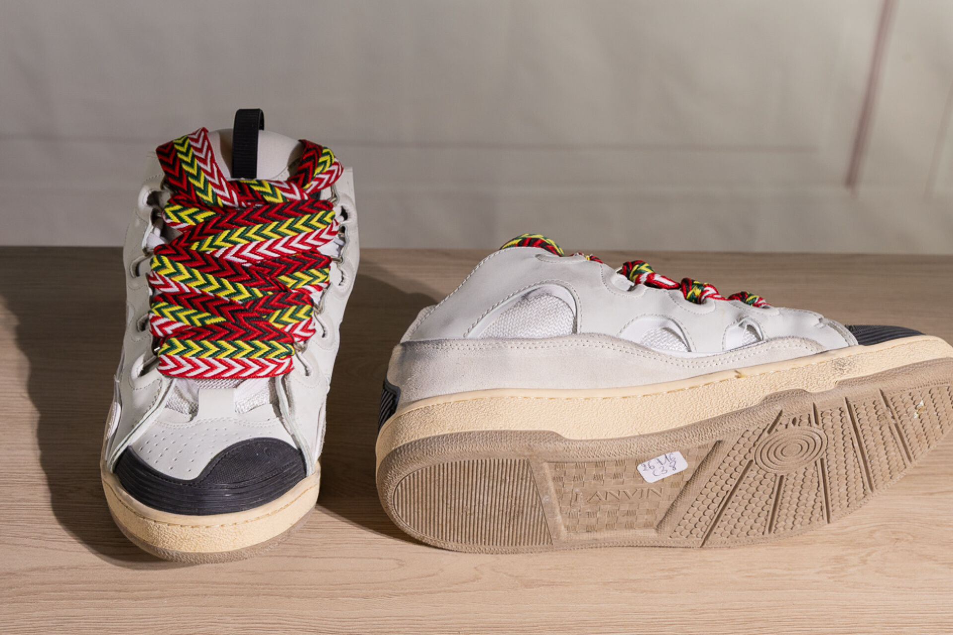 LANVIN - Paire de baskets basses grises à lacets maxi, chevrons rouge, blanc, verte, jaune et noir. Pointure 43 Déjà portées, usures, boite