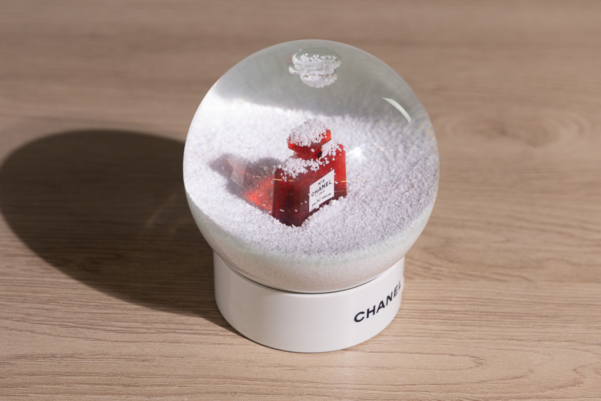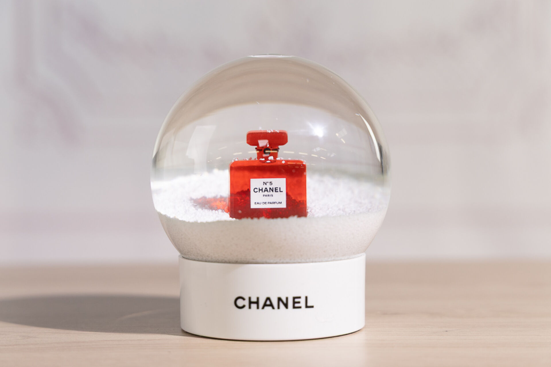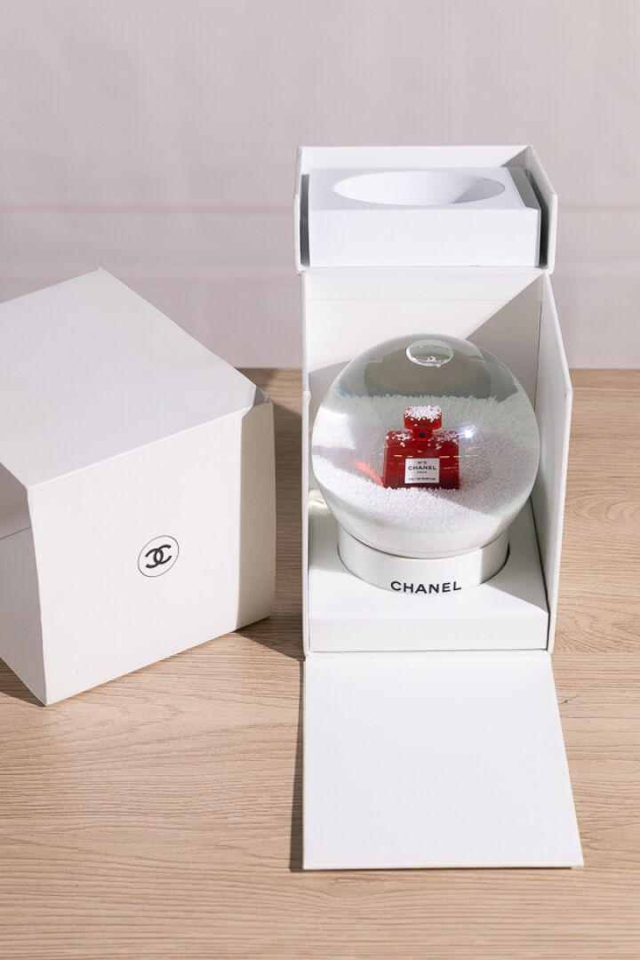 CHANEL - Boule à neige forme boule en plexi transparent enchâssant un flacon rouge eau de parfum n° 5, sur socle blanc signé. (Bel état.) Haut. : 12 cm (environ) Avec sa boîte et surboîte.