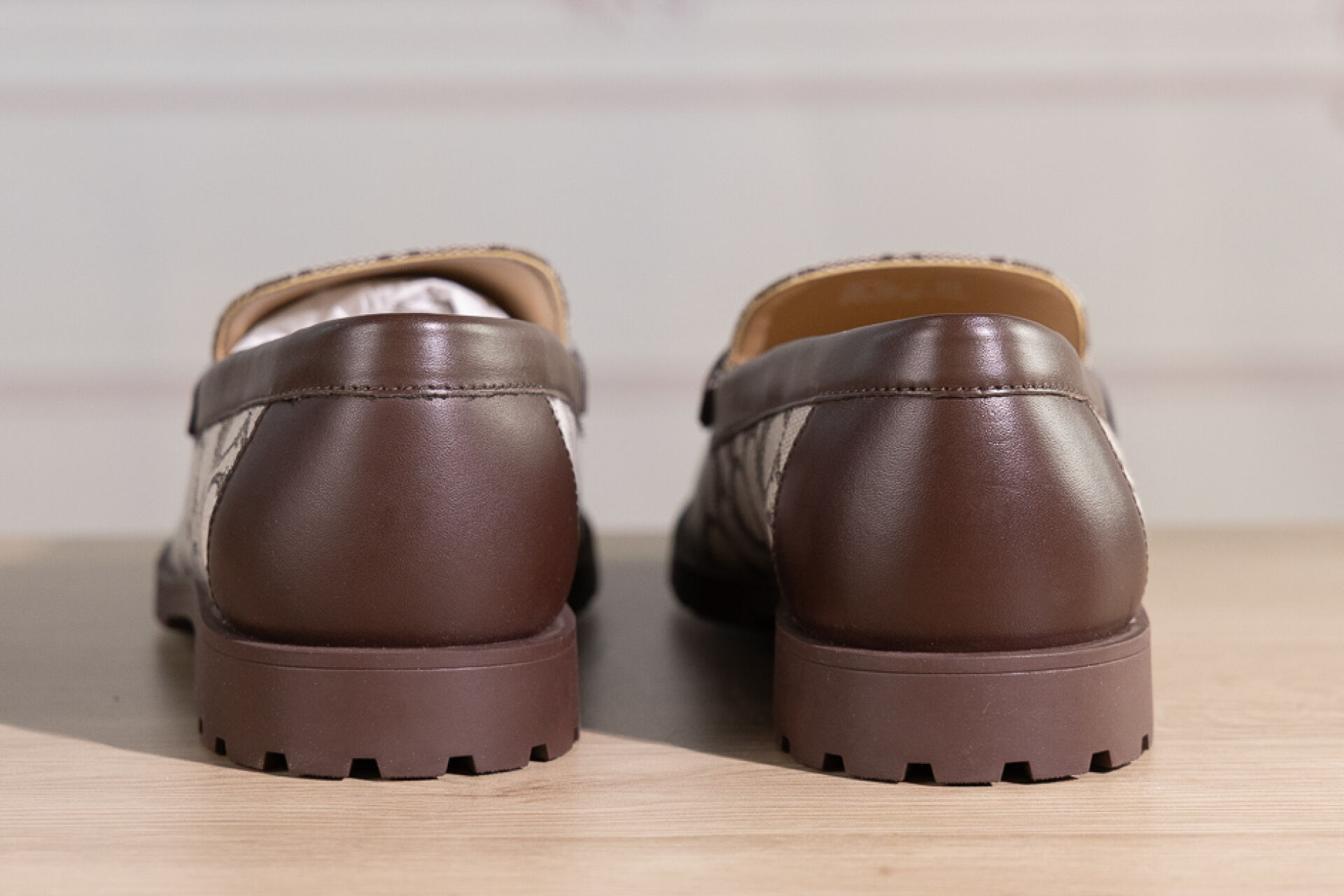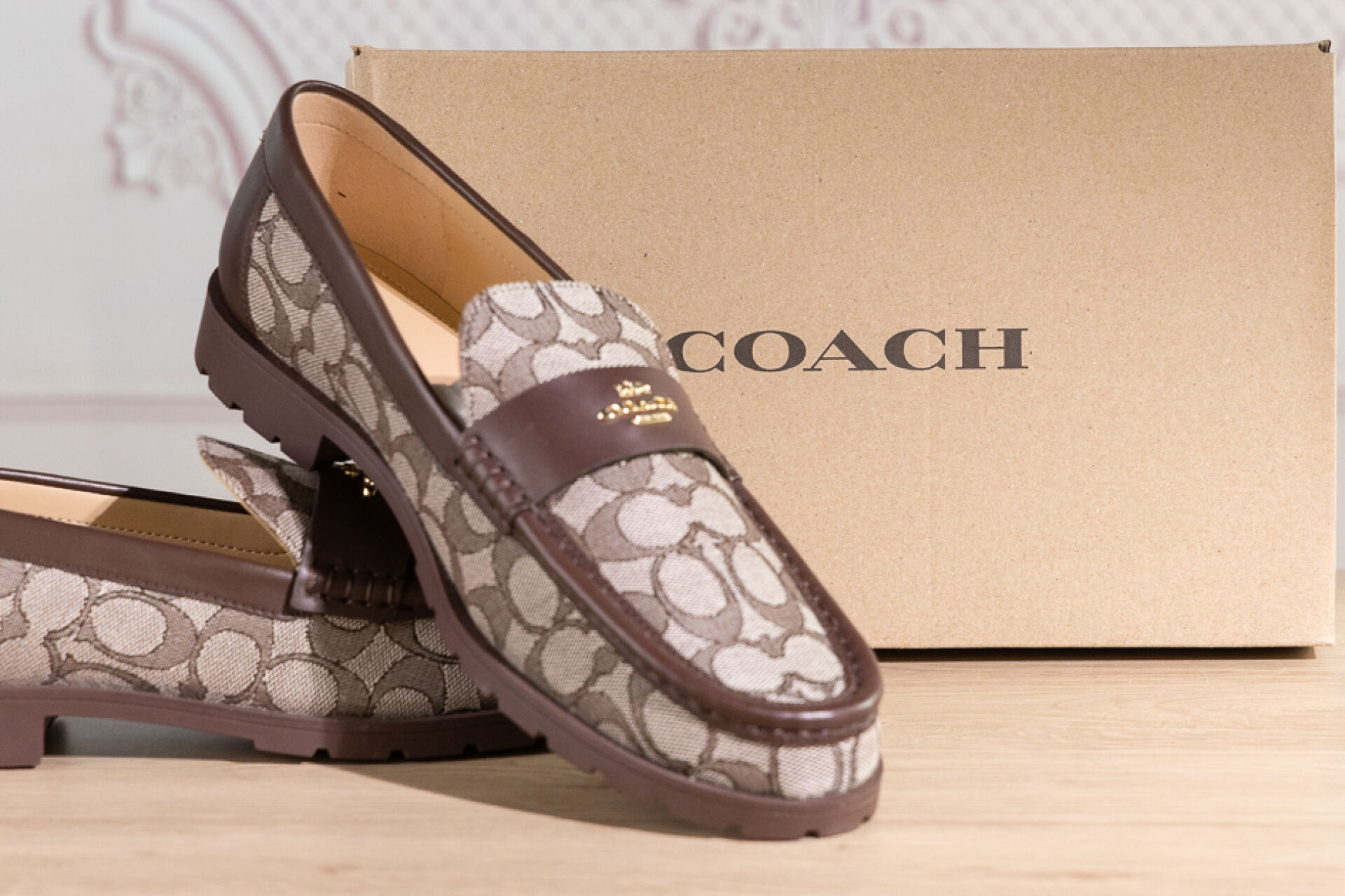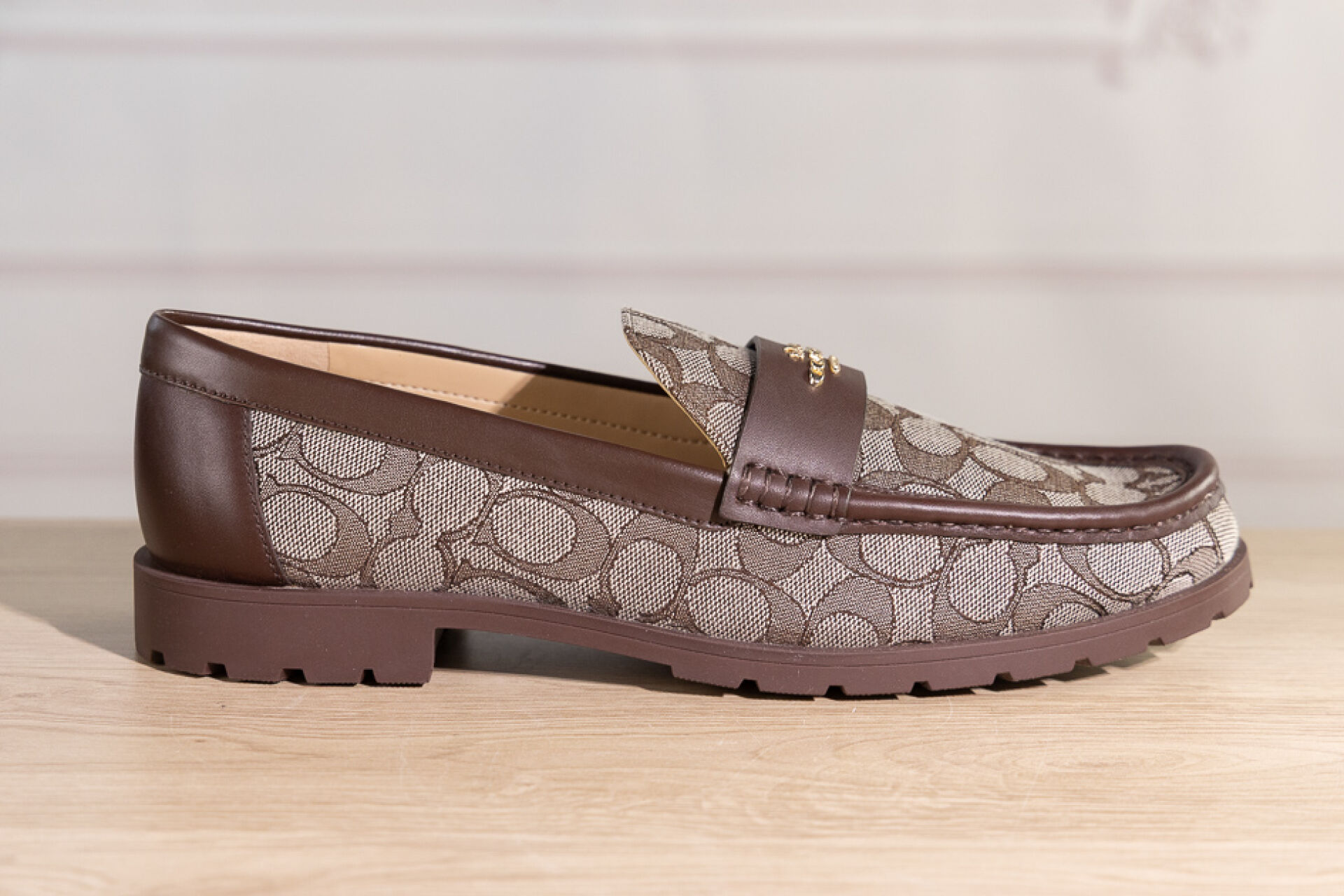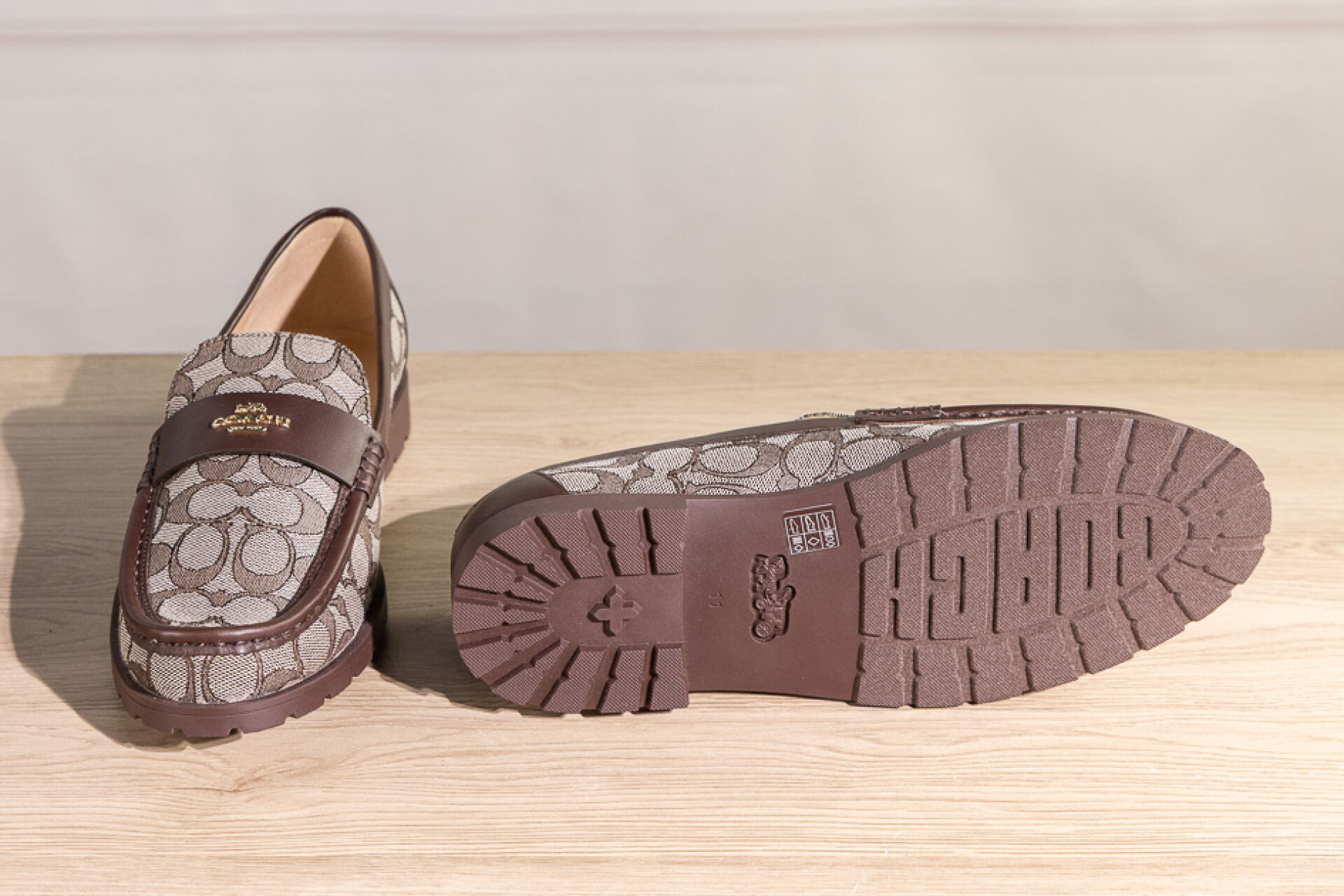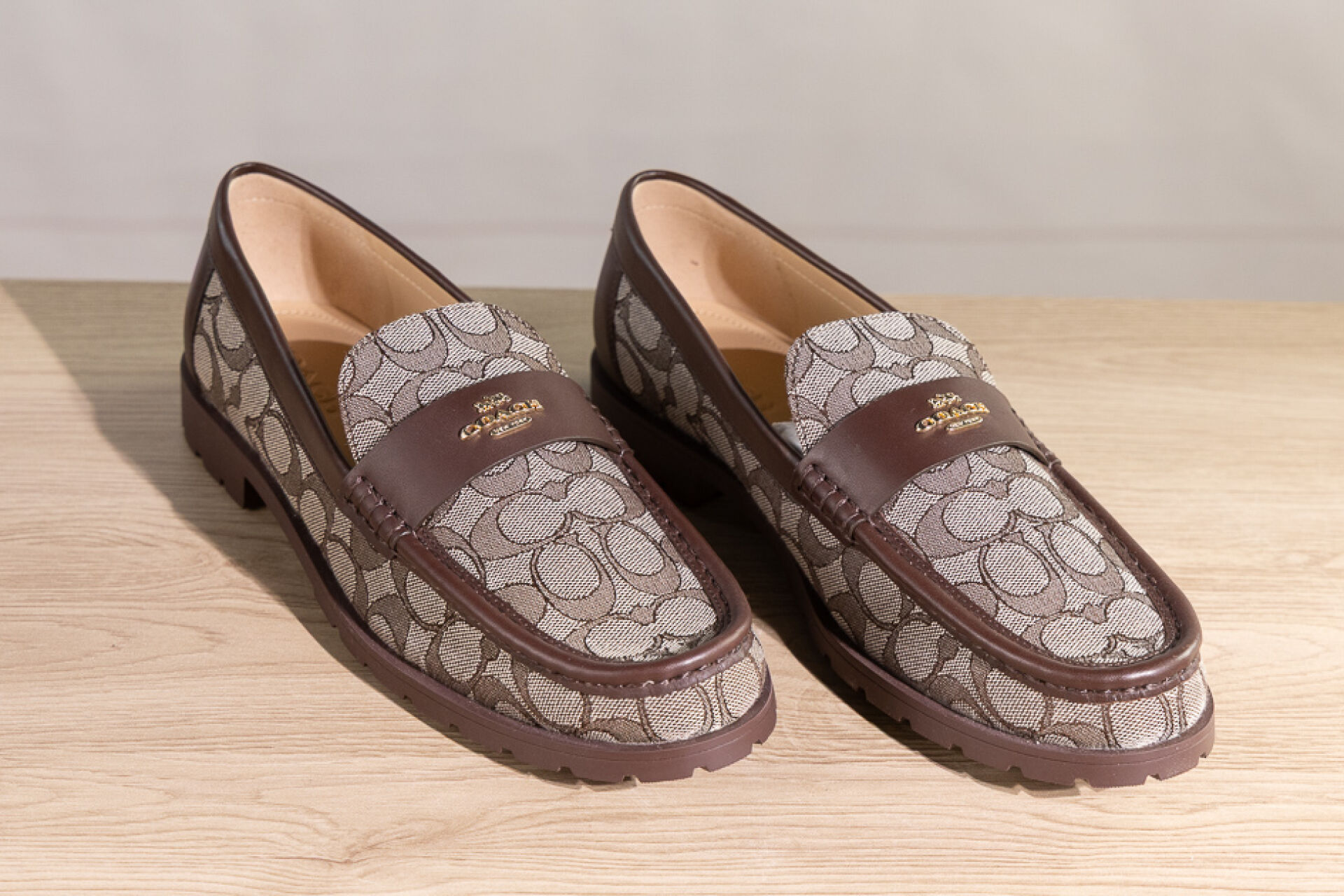 COACH - Paire de mocassins en toile siglée beige et cuir marron, semelle gomme crantée, signées. Pointure indiquée 11 (soit 41,5 français) Non portés, boite