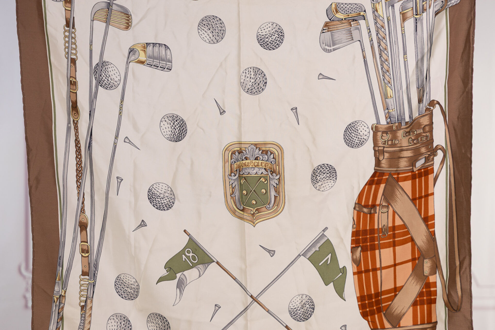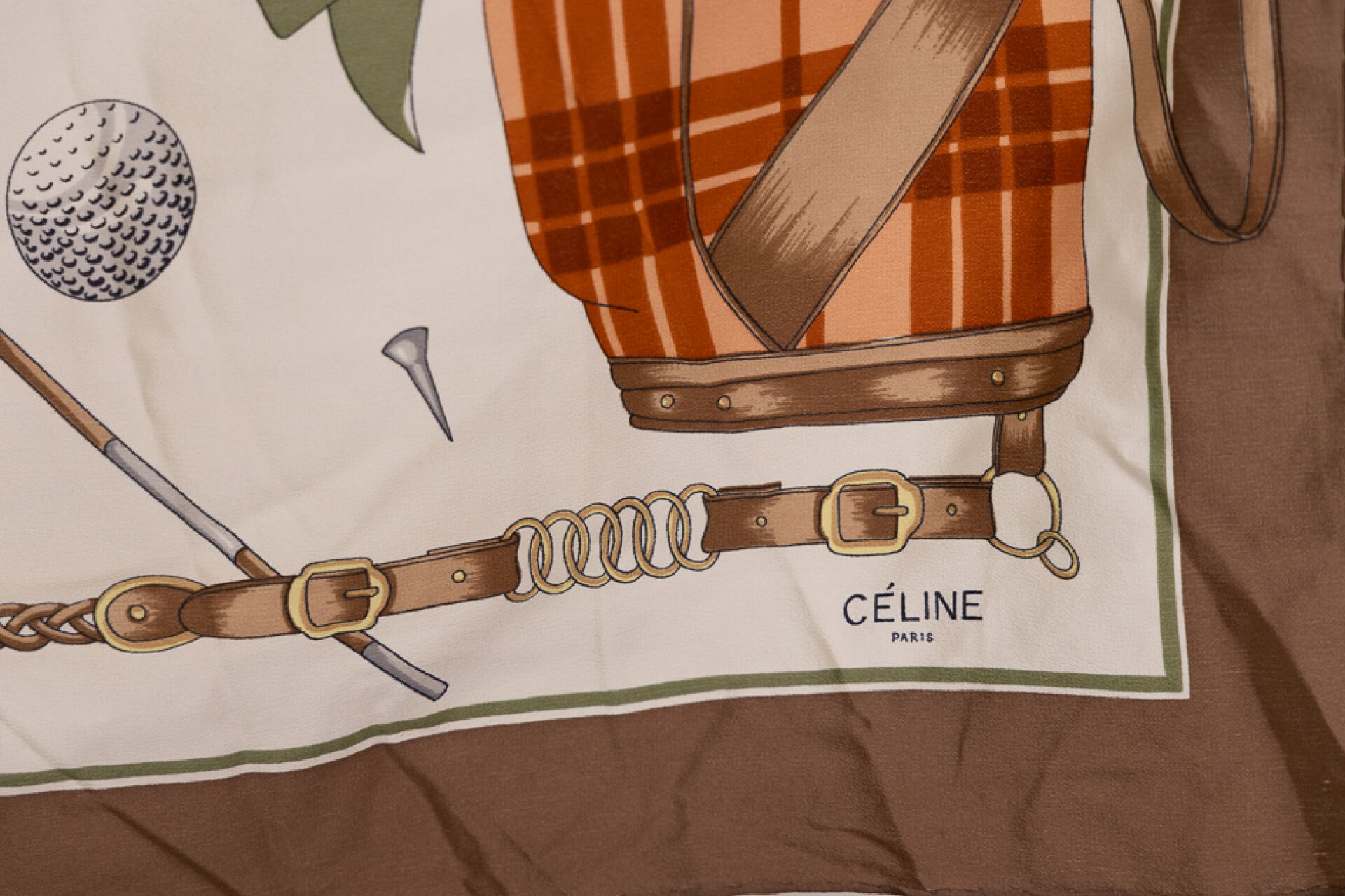 CELINE - Carré en soie imprimée des attributs de golf à dominantes beige, kaki et orangé. Bon état général, déjà porté, rouloté fragilisé