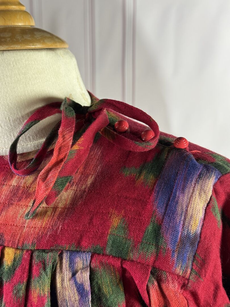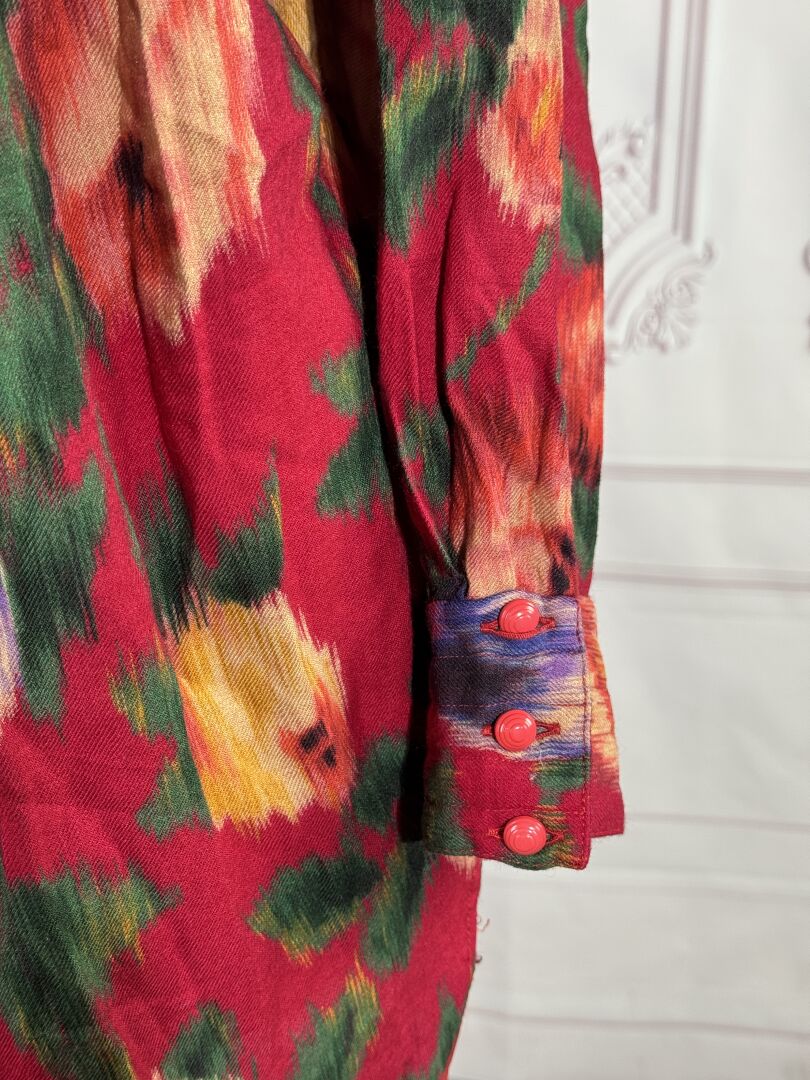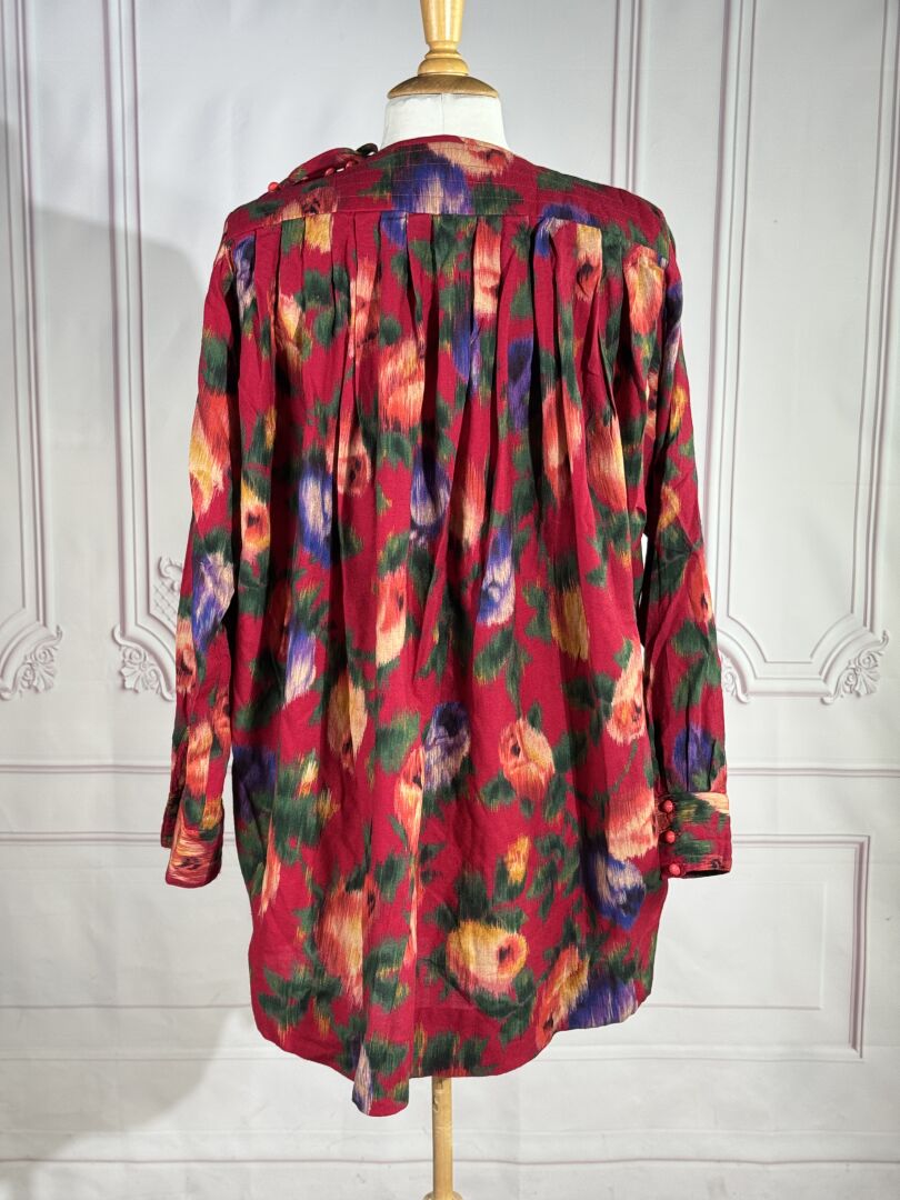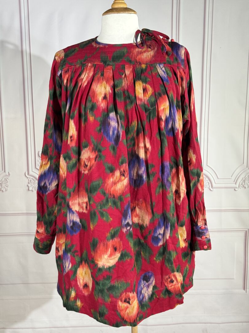 UNGARO - Robe courte, effet blousant, coton imprimé de fleurs sur fond framboise, encolure ronde, boutonnage épaule, manches longues boutonnées, deux poches. Taille indiquée 44/10 (soit 40 français, taille petit) Robe ayant été modifiée dans sa longueur, bon état général