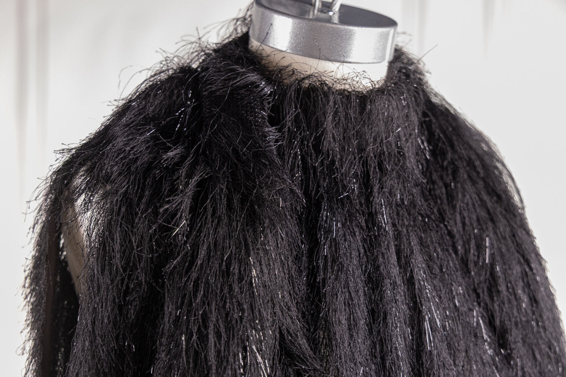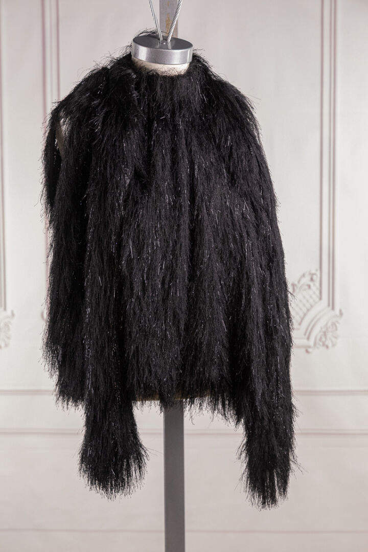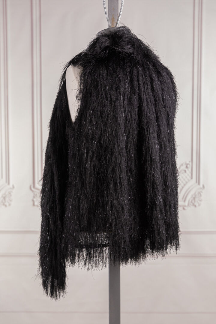 SACAI - Top en filet noir rehaussé de franges pailletée à encolure montante à nouer, sans manches. Taille 2