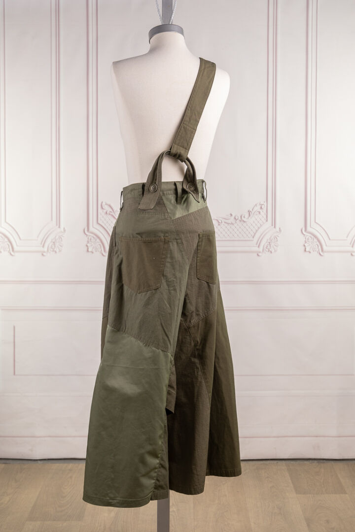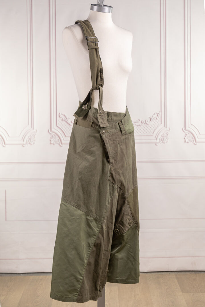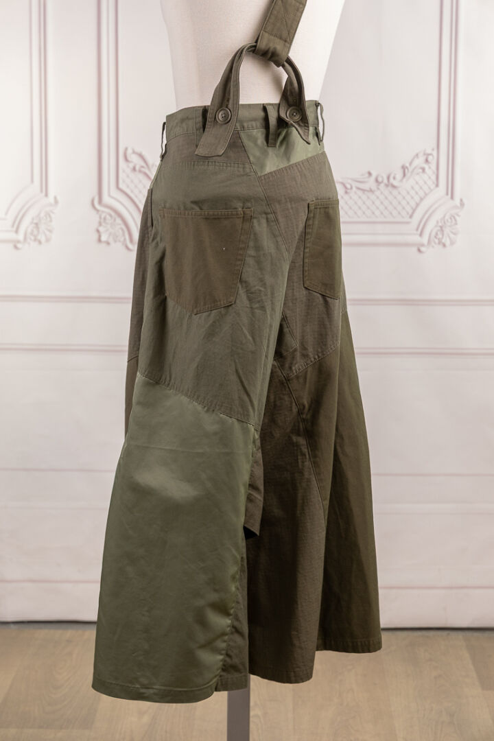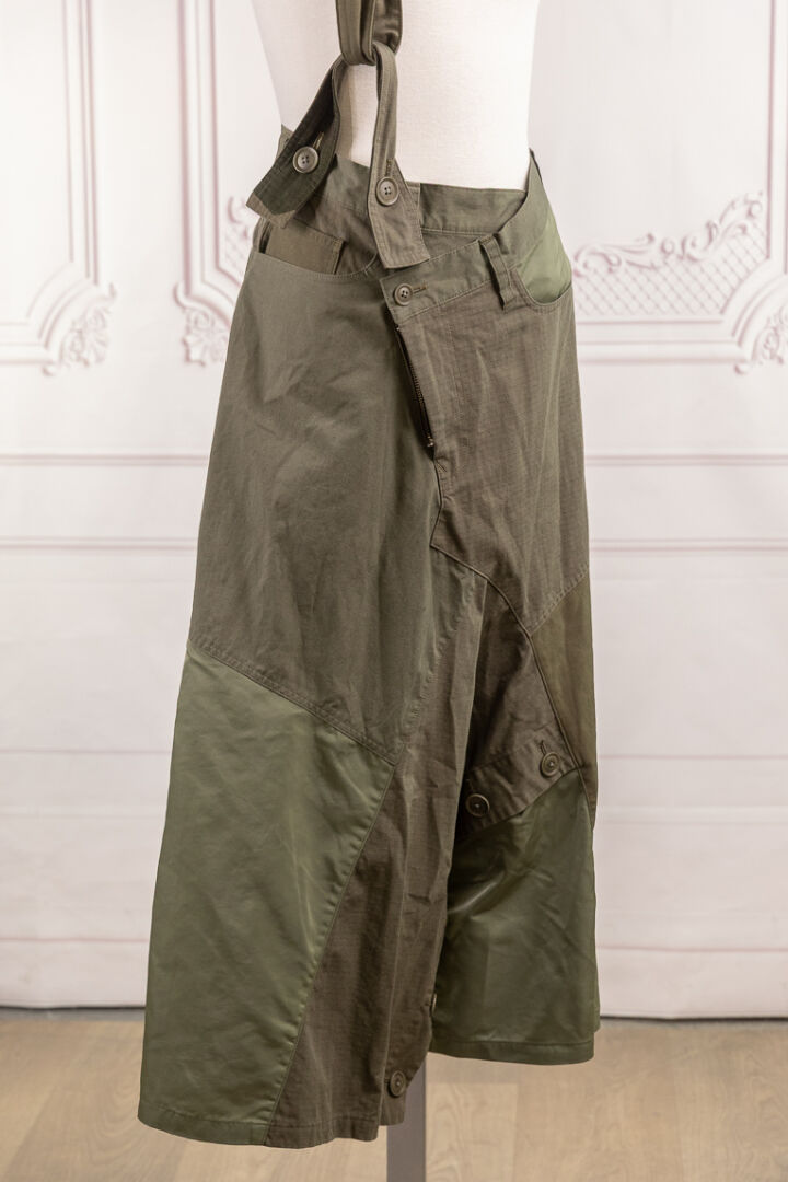 GROUND Y - Ample jupe culotte en patchwork de tissus techniques kaki à bretelles modulables. Taille 36/38