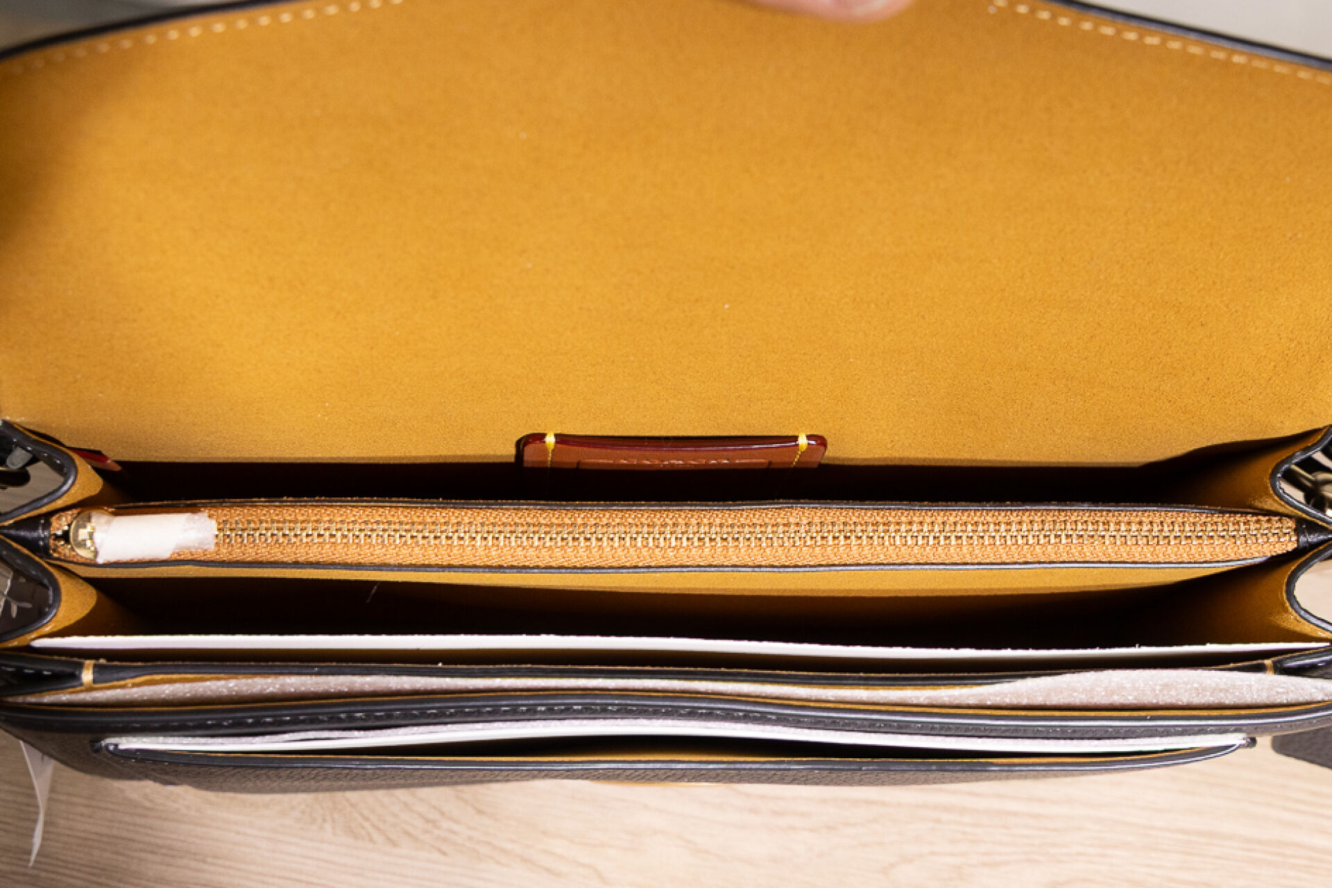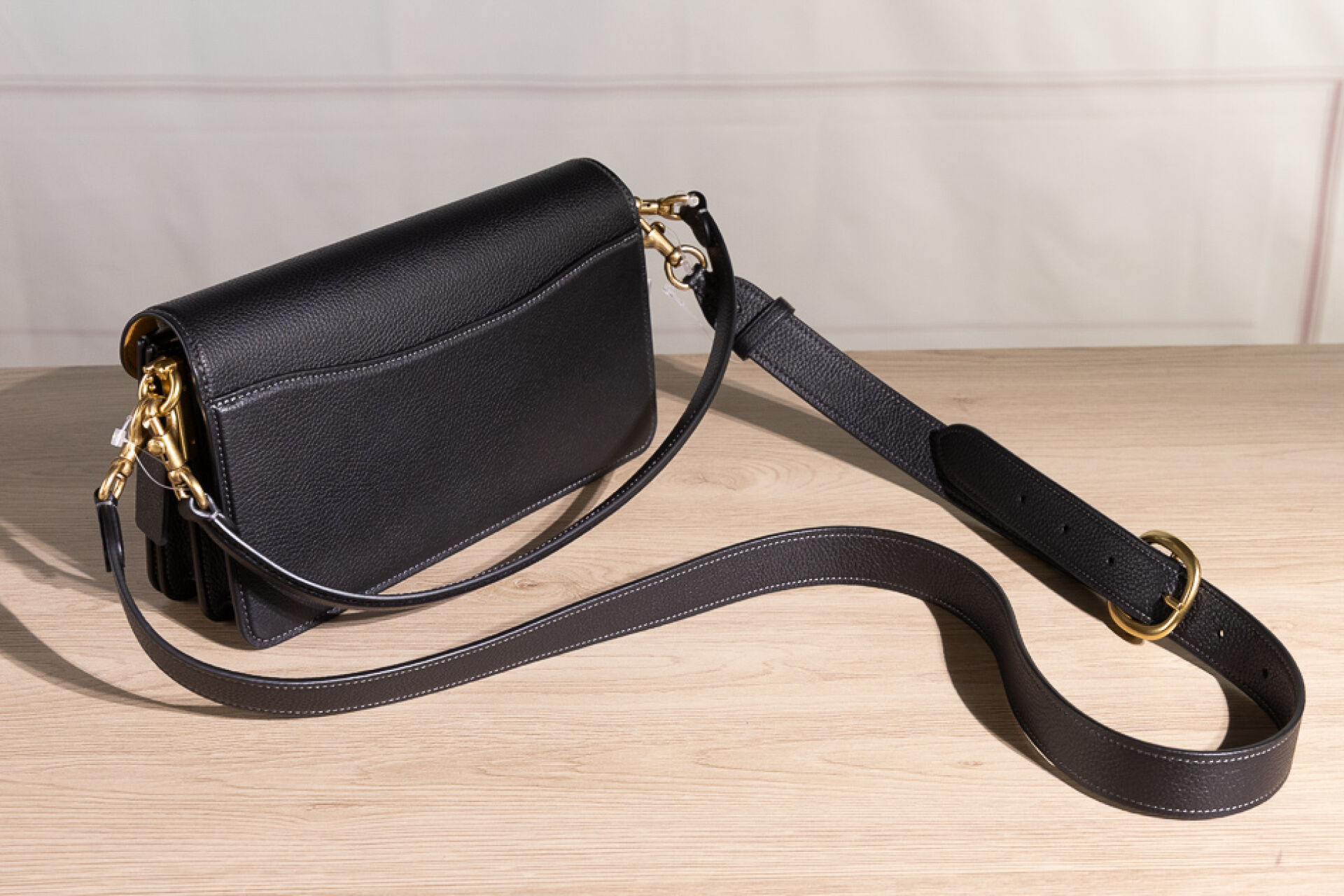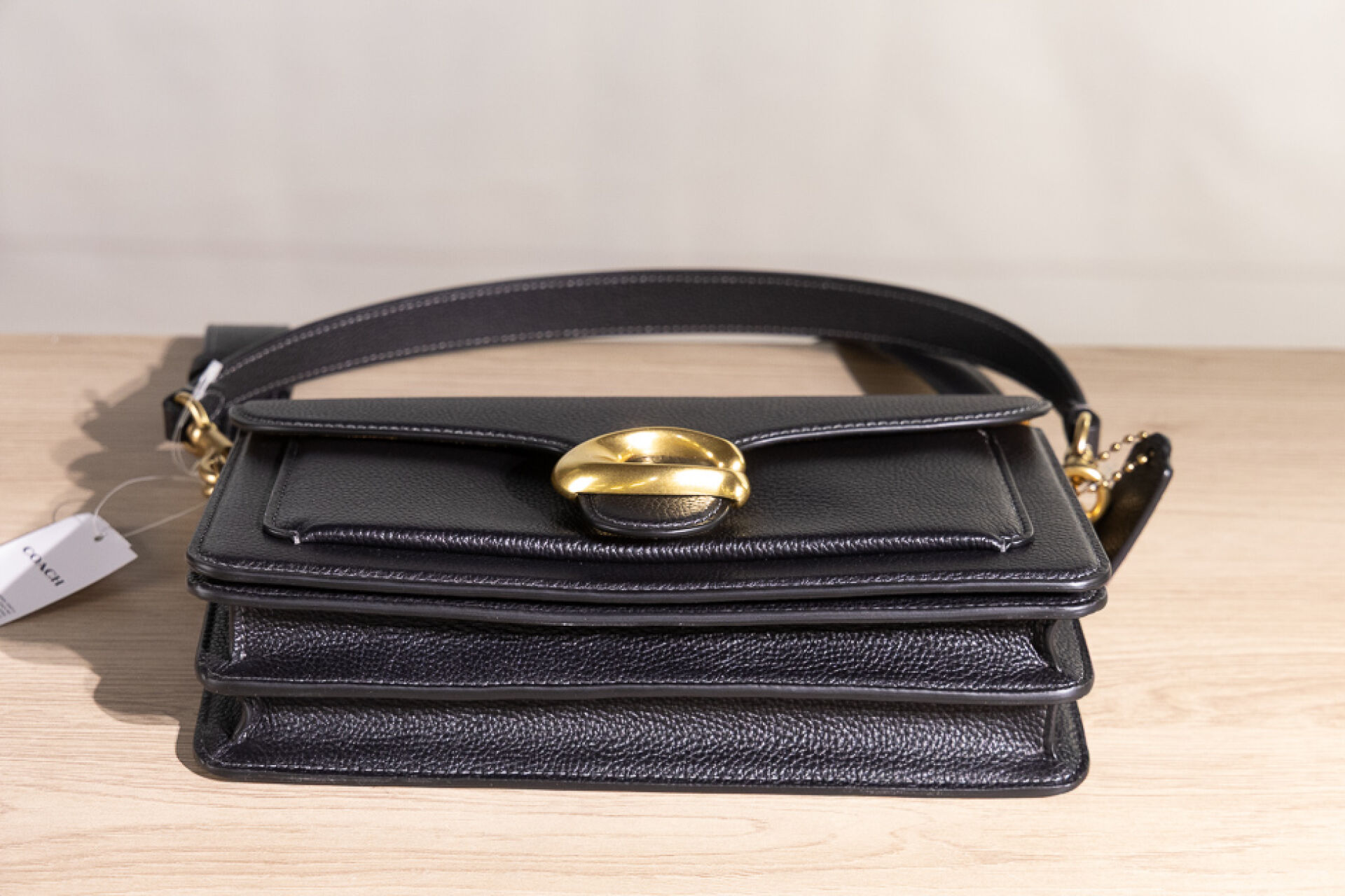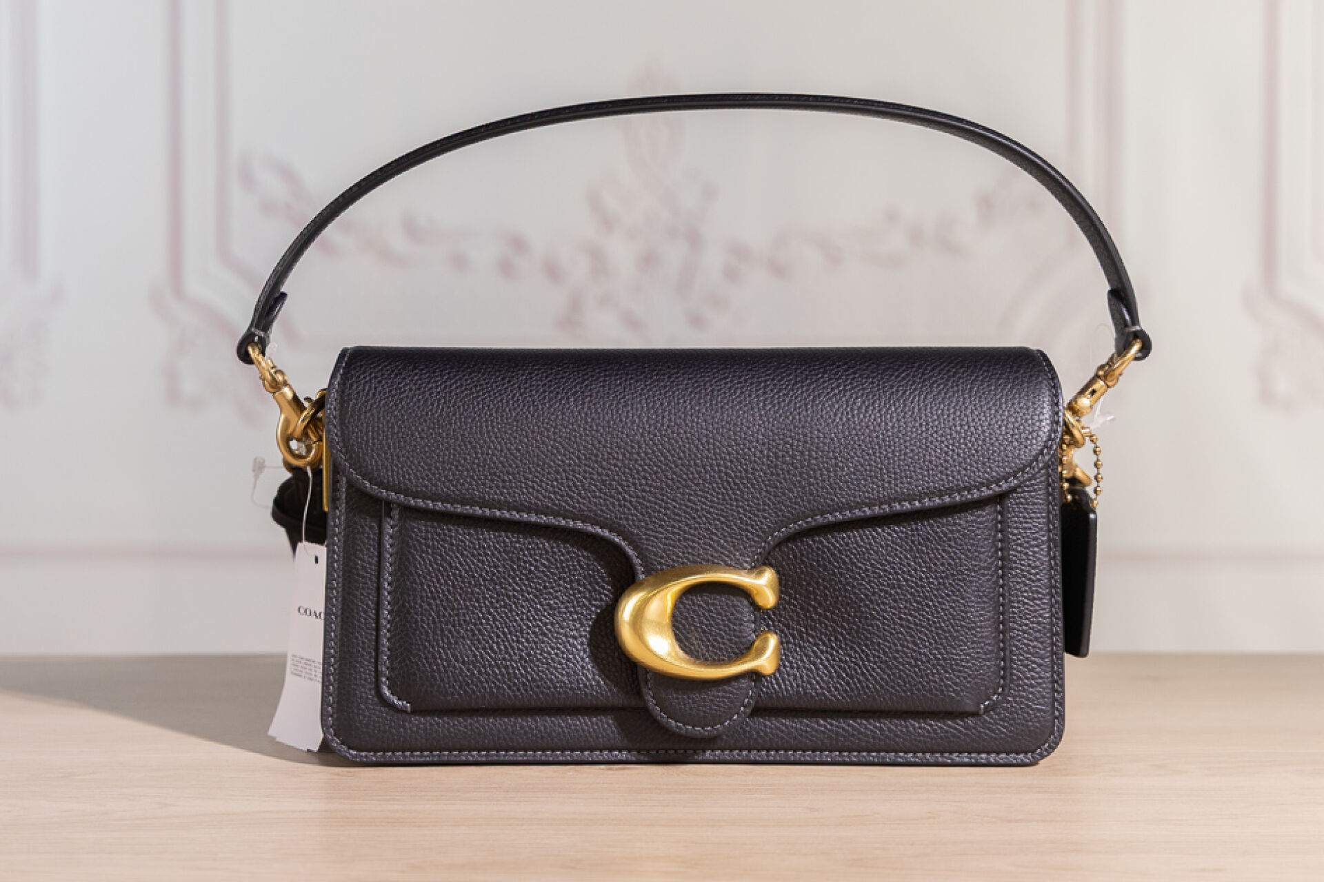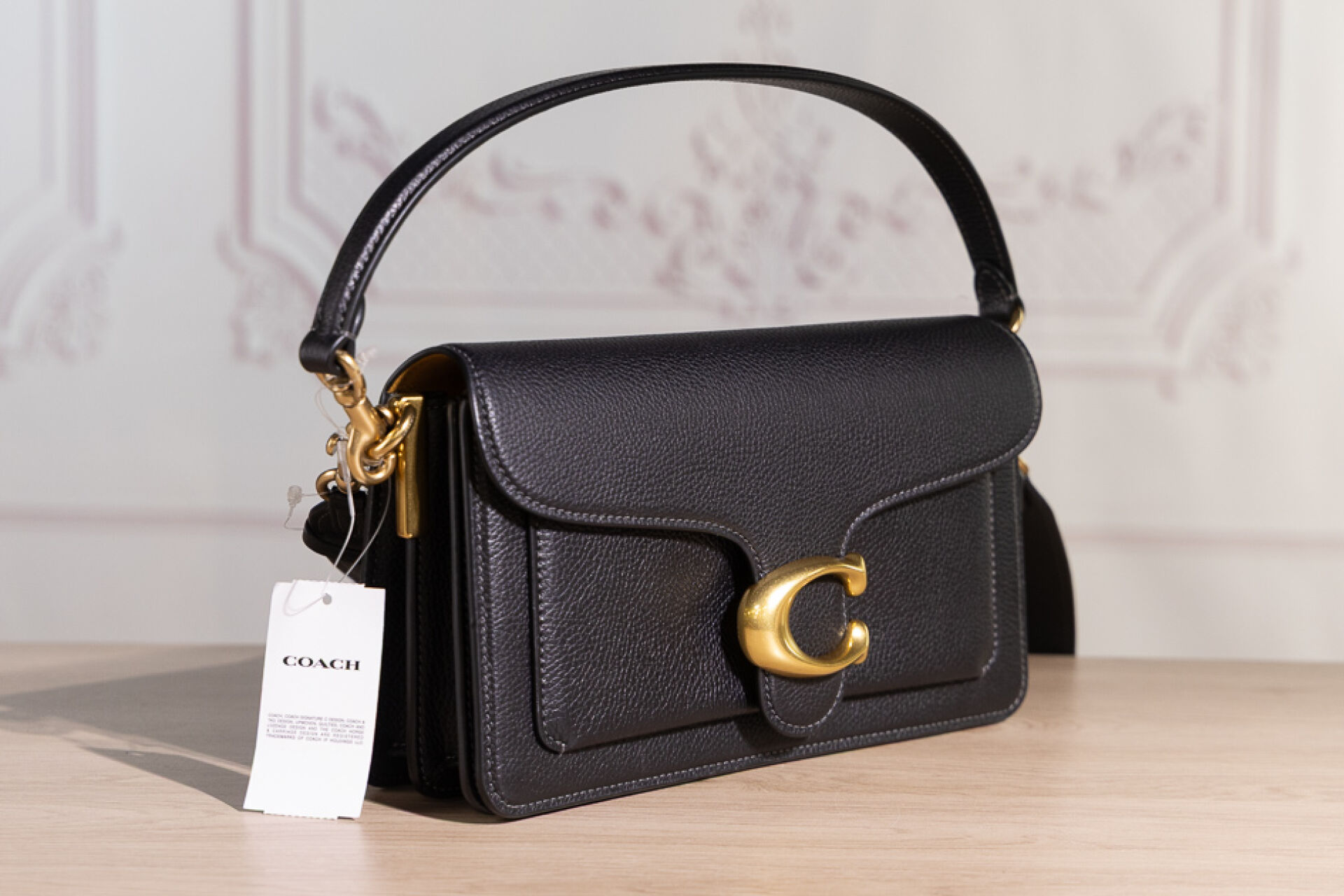 COACH - Sac "Tabby" en cuir grainé noir, fermoir aimanté sous rabat rehaussé du sigle en métal doré vieilli, poche plaquée au dos, poignée et anse bandoulière amovibles. Haut. : 13 cm - Long. : 26 cm Non porté