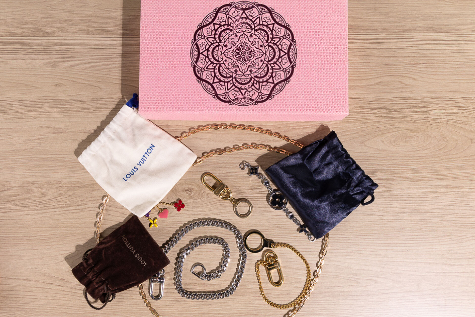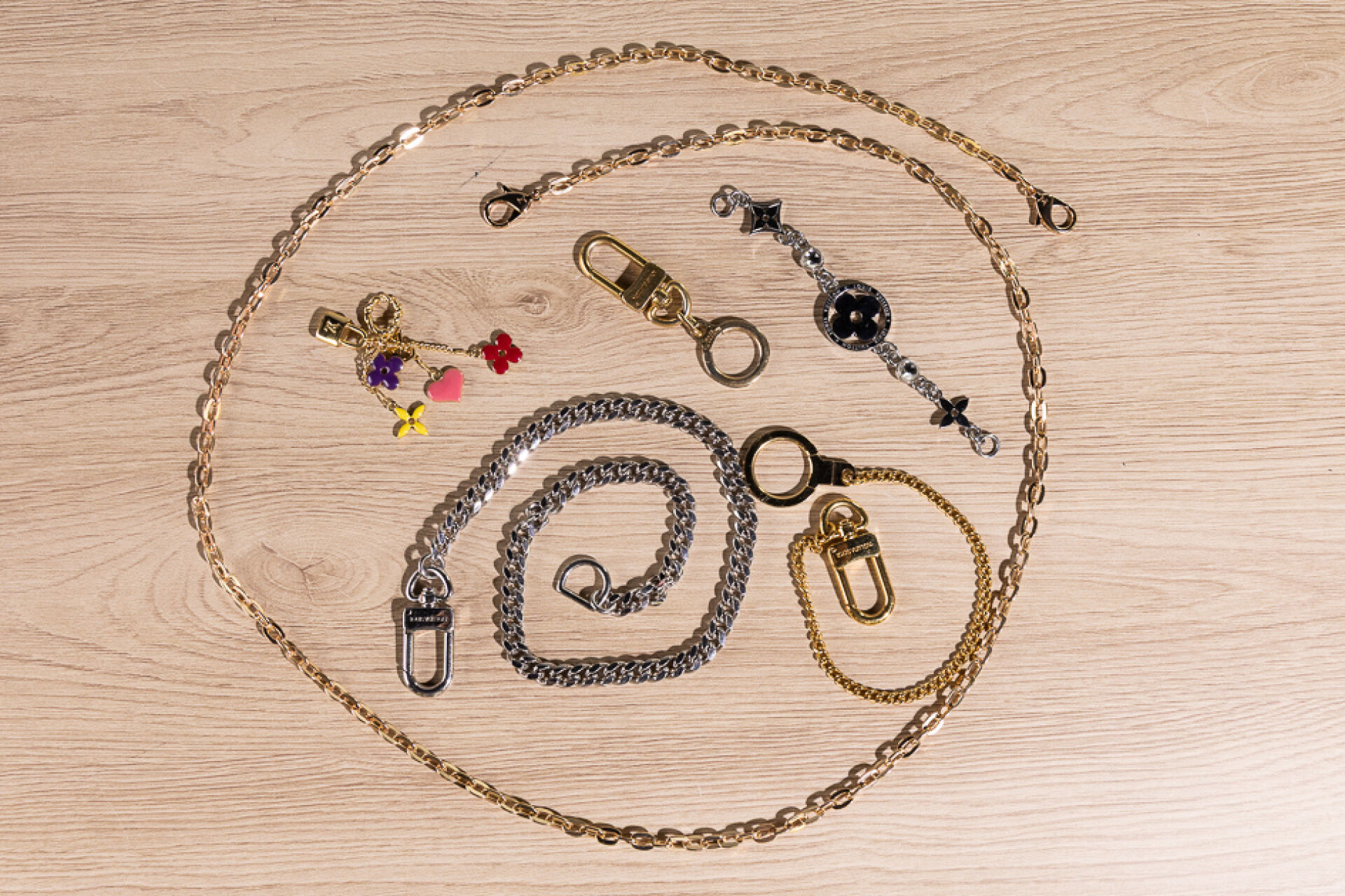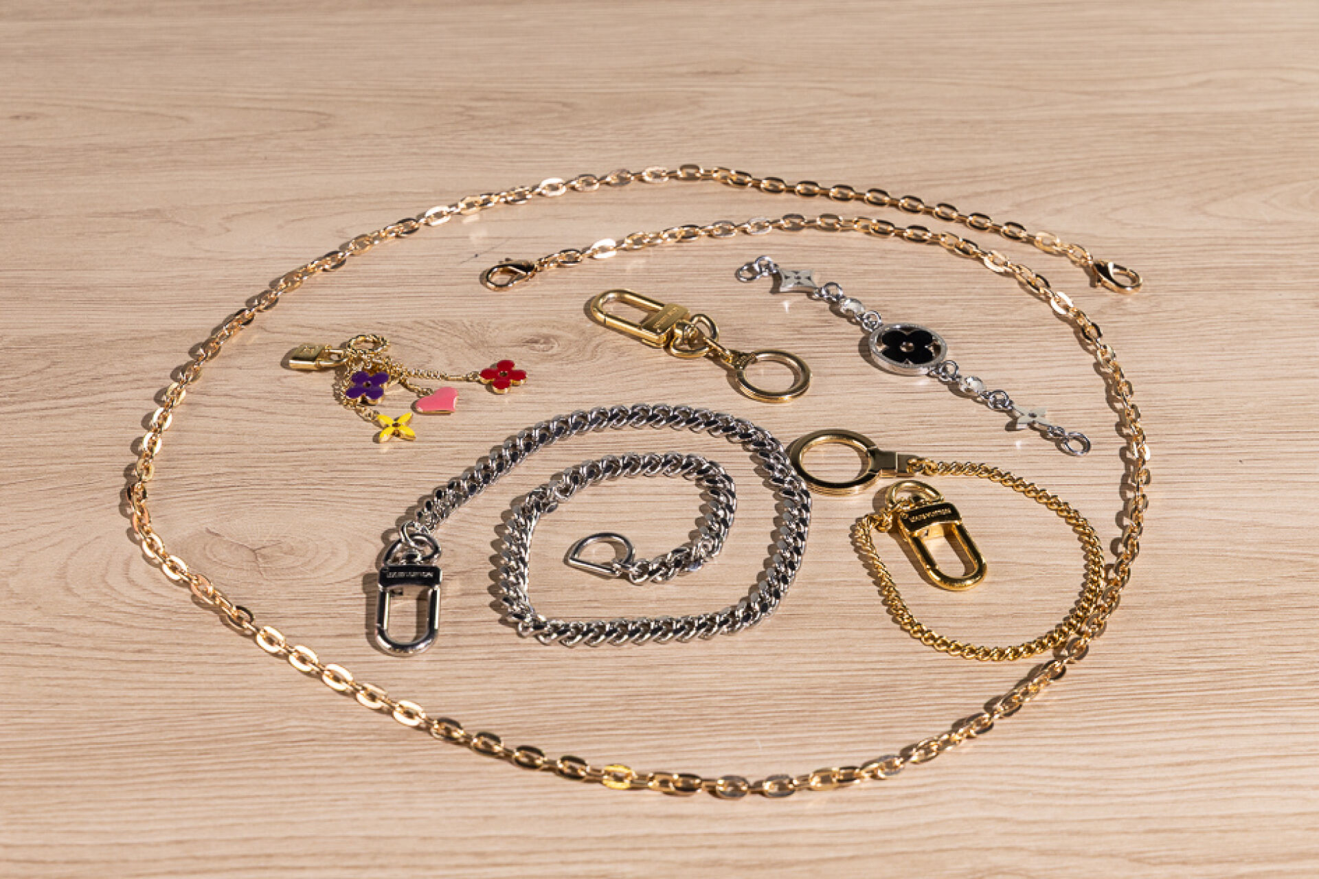 LOUIS VUITTON - Ensemble d'accessoires pour sac composé d'une chaine gourmette argenté, une longue chaine doré, une petite chaine doré à finition attache porte clef, un mousqueton doré, un anneau doré à finition charm's au Monogram émaillé multicolore sur métal doré et d'une chaine argenté au Monogram. Griffures d'usage