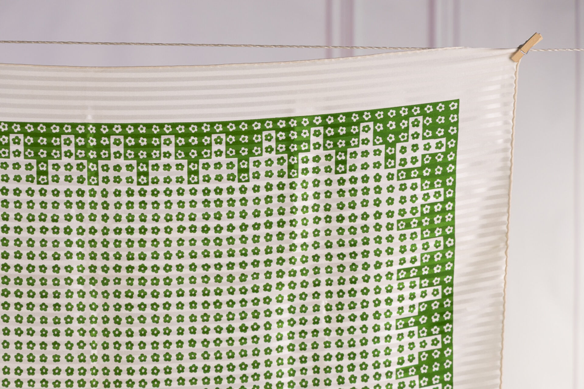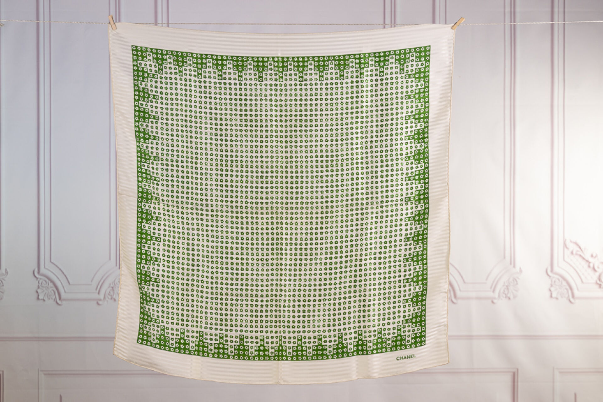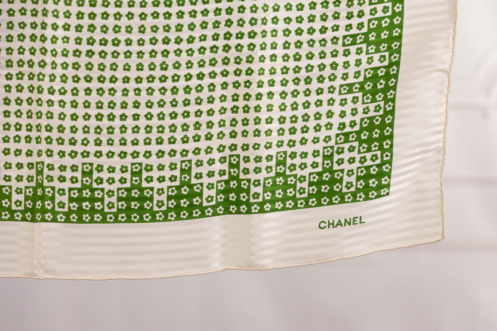 CHANEL - Carré en soie rayée blanche imprimée d'un tapis floral vert. Mini tâches