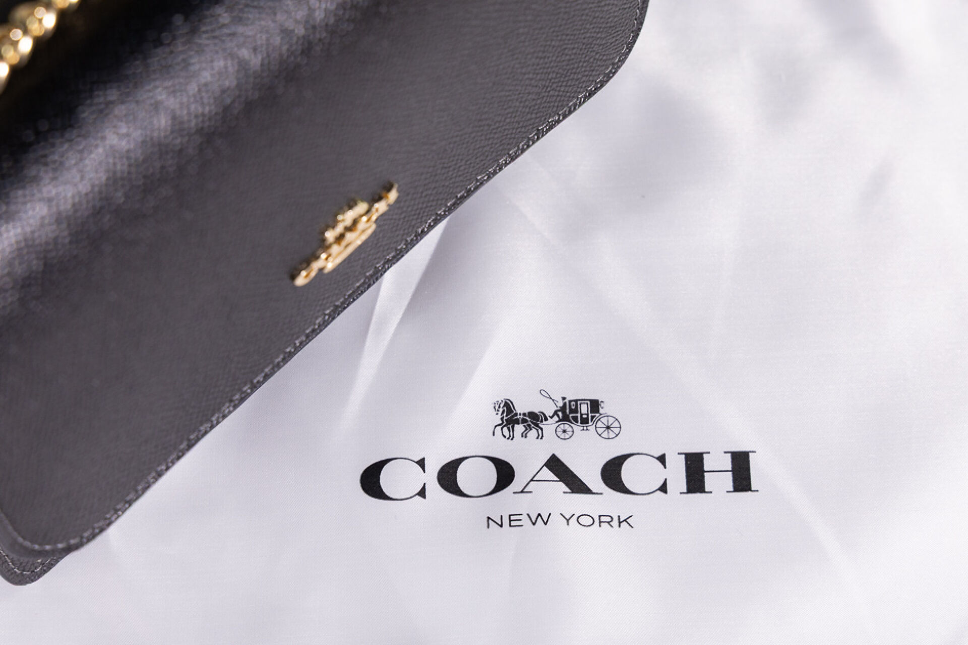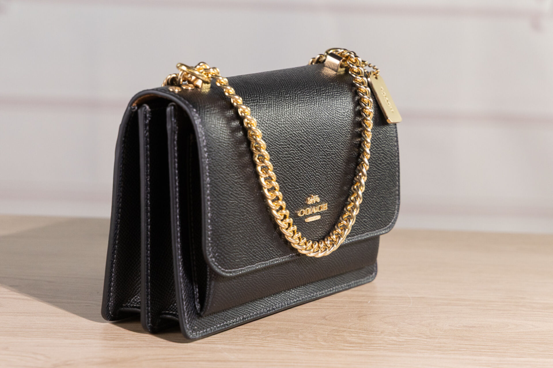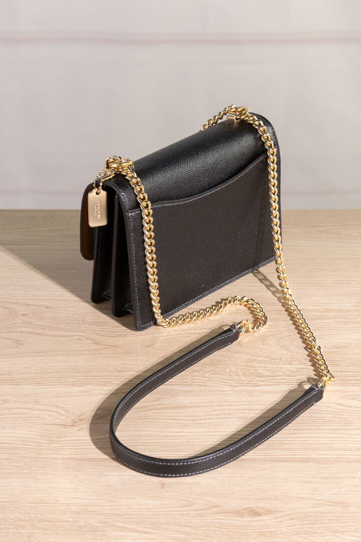 COACH - Petit sac en cuir grainé noir à deux soufflets, fermoir aimanté sous rabat, poche plaquée au dos, anse chaine dorée et cuir transformable. Haut. : 13 cm - Long. : 18 cm Non porté, dustbag