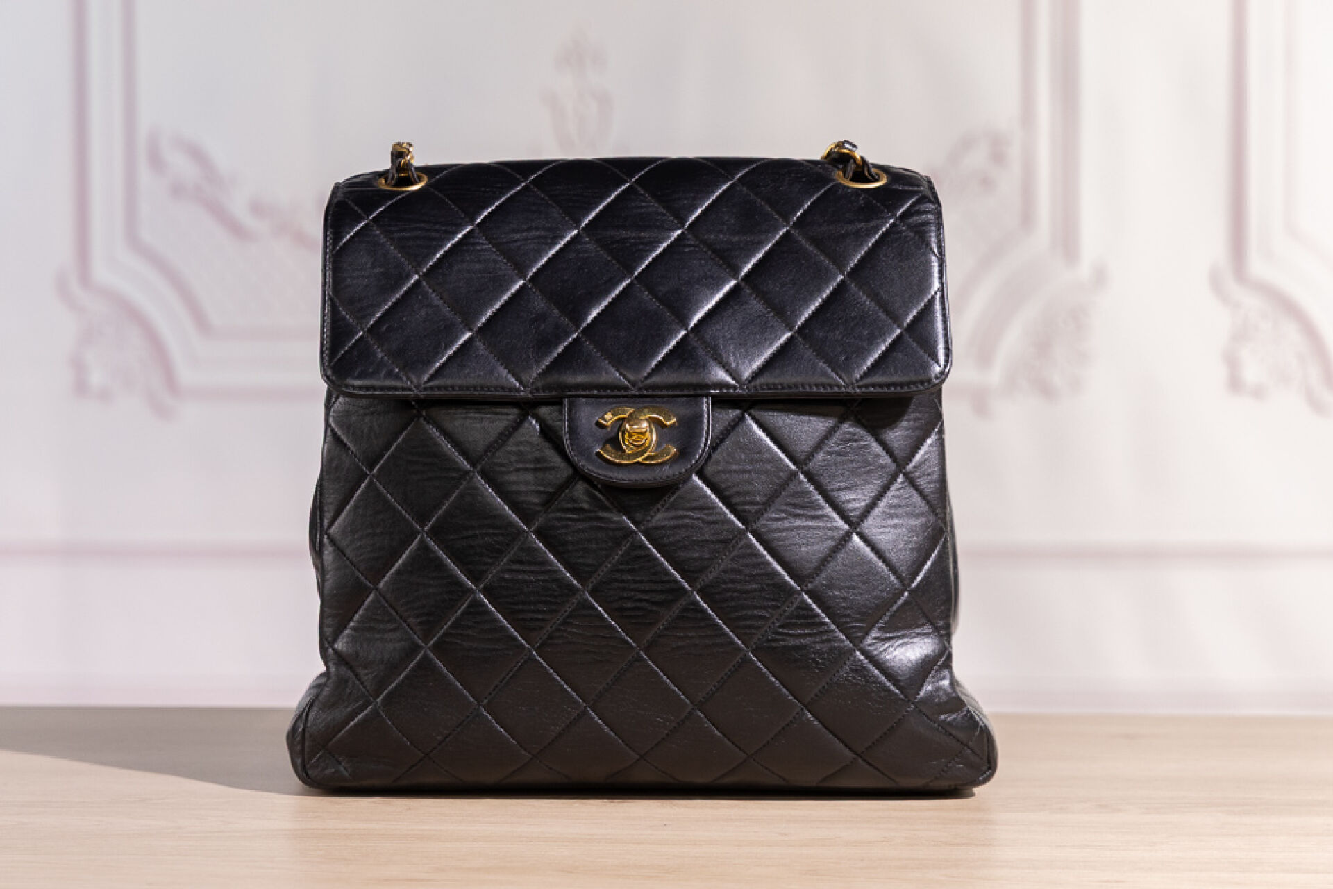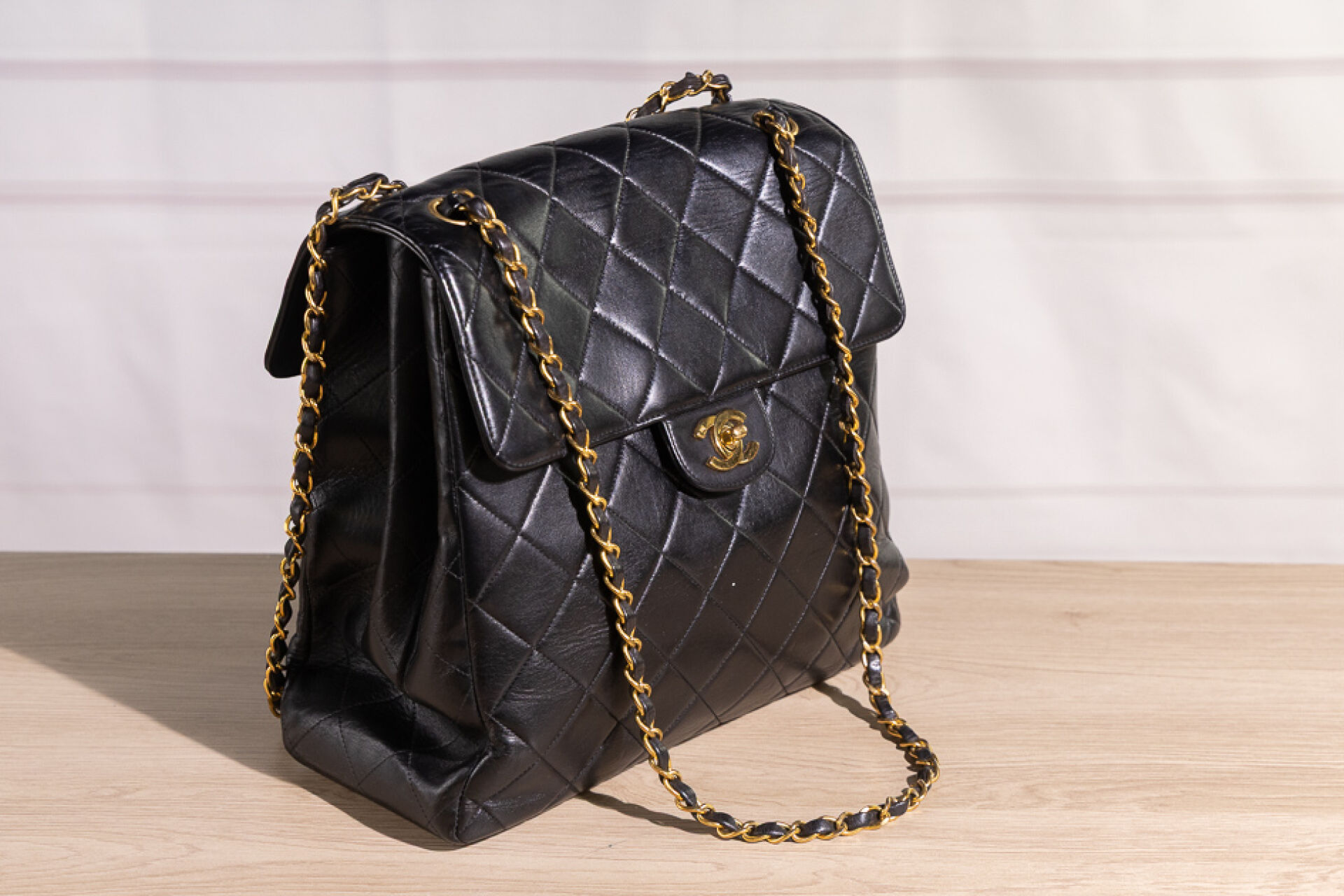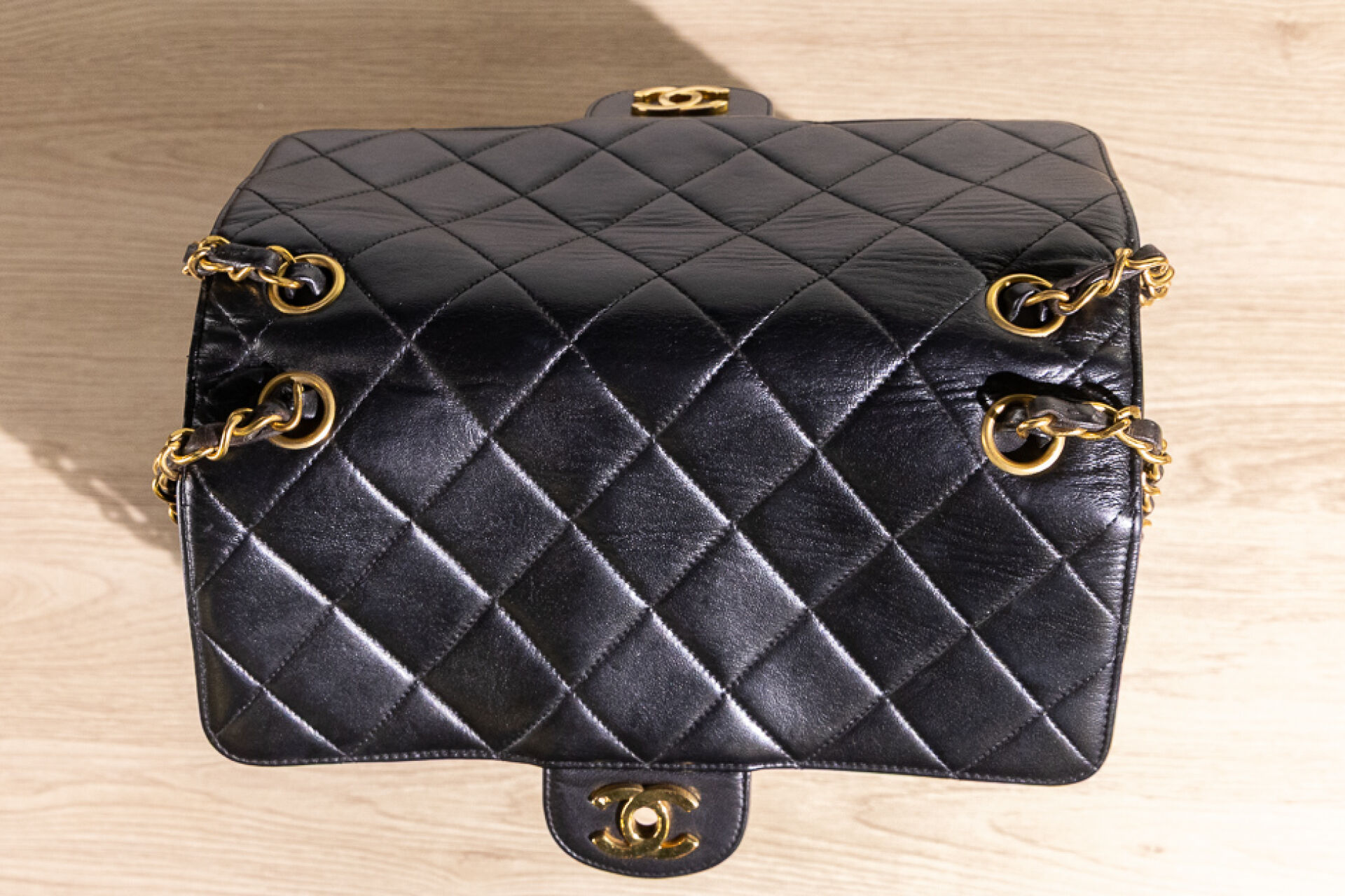 CHANEL - Sac "Timeless" haut recto-verso en cuir matelassé noir, double anse en métal doré entrelacées de cuir à la couleur, fermoir pivotant en métal doré siglé sur chacun des rabats, doublure en cuir noir. Tampon or Chanel Made in France. Hologramme illisible. (Très légères oxydations, sac re-ciré) Haut. : 26,5 cm ; Long. : 28,5 cm ; Prof. : 12,3 cm Avec son dust bag.