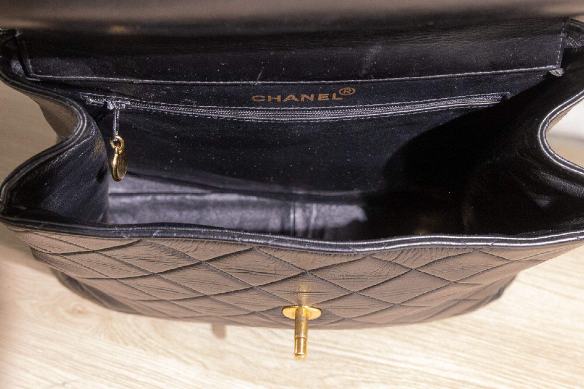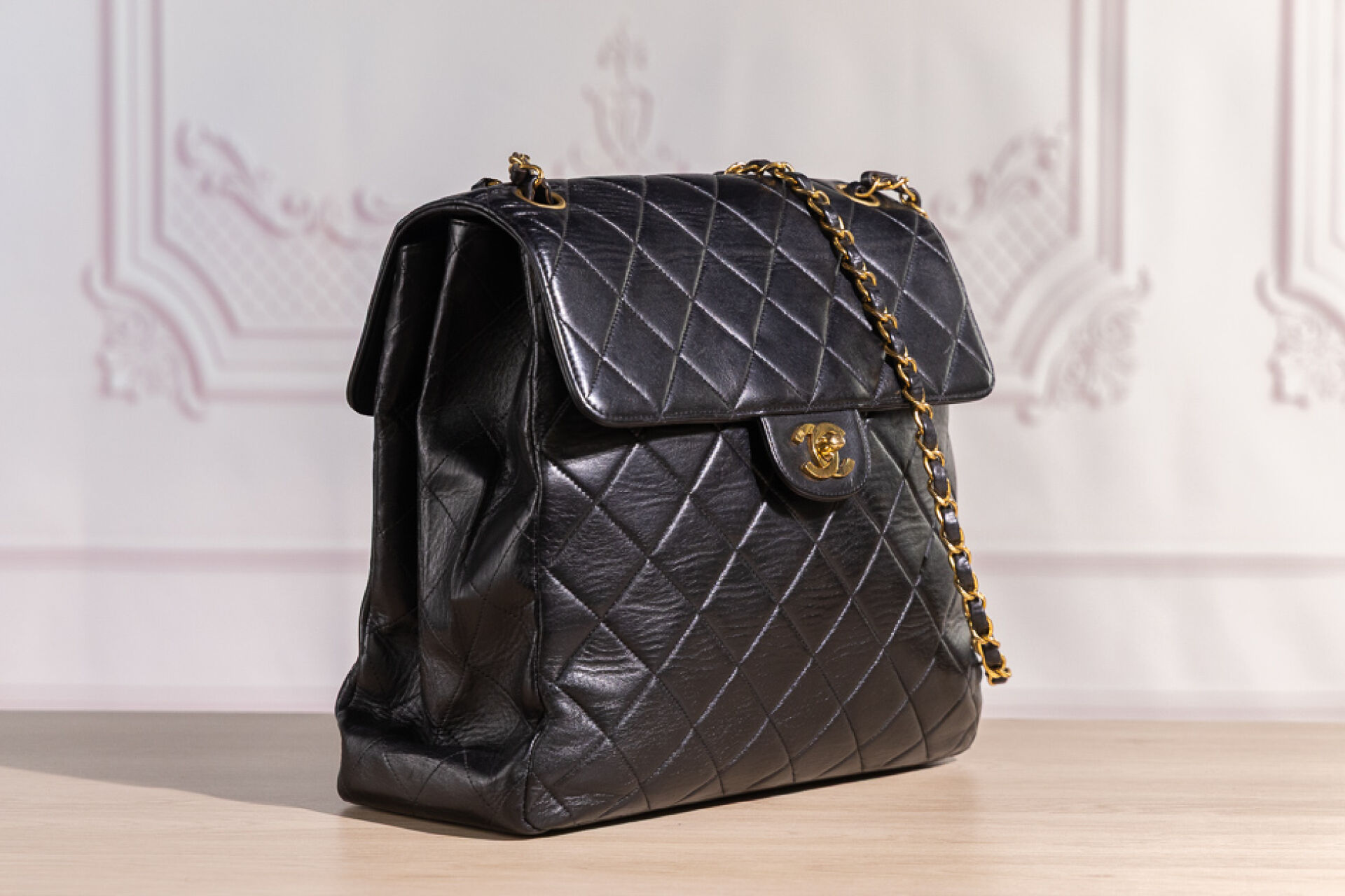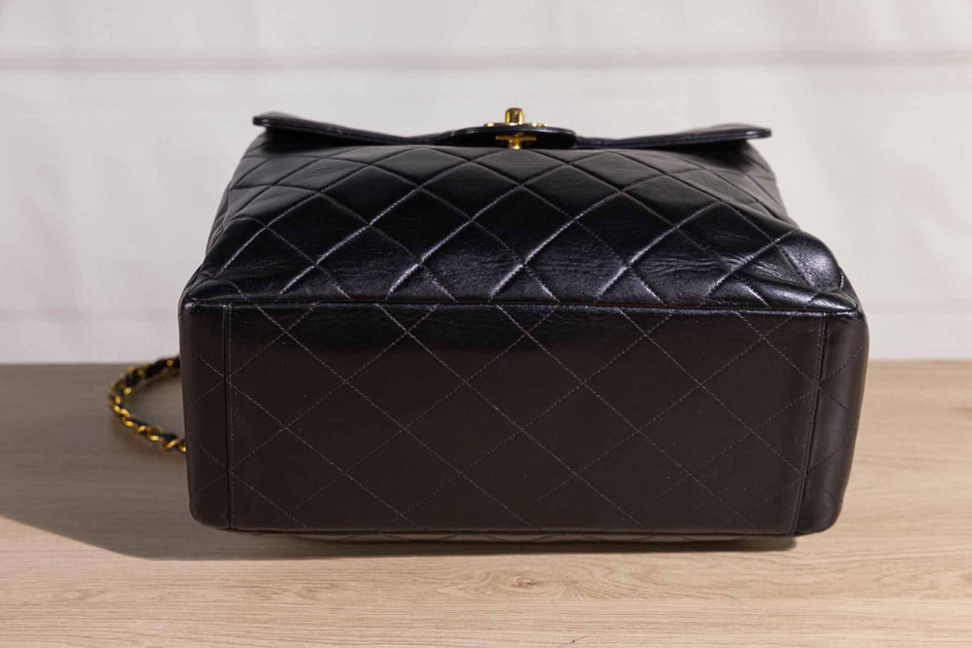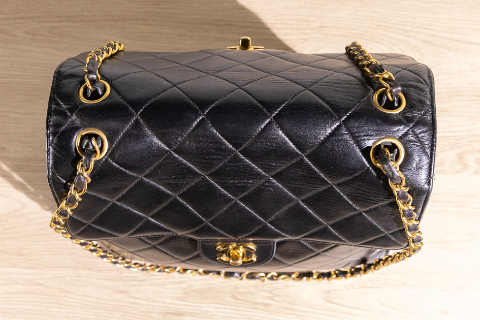CHANEL - Sac "Timeless" haut recto-verso en cuir matelassé noir, double anse en métal doré entrelacées de cuir à la couleur, fermoir pivotant en métal doré siglé sur chacun des rabats, doublure en cuir noir. Tampon or Chanel Made in France. Hologramme illisible. (Très légères oxydations, sac re-ciré) Haut. : 26,5 cm ; Long. : 28,5 cm ; Prof. : 12,3 cm Avec son dust bag.