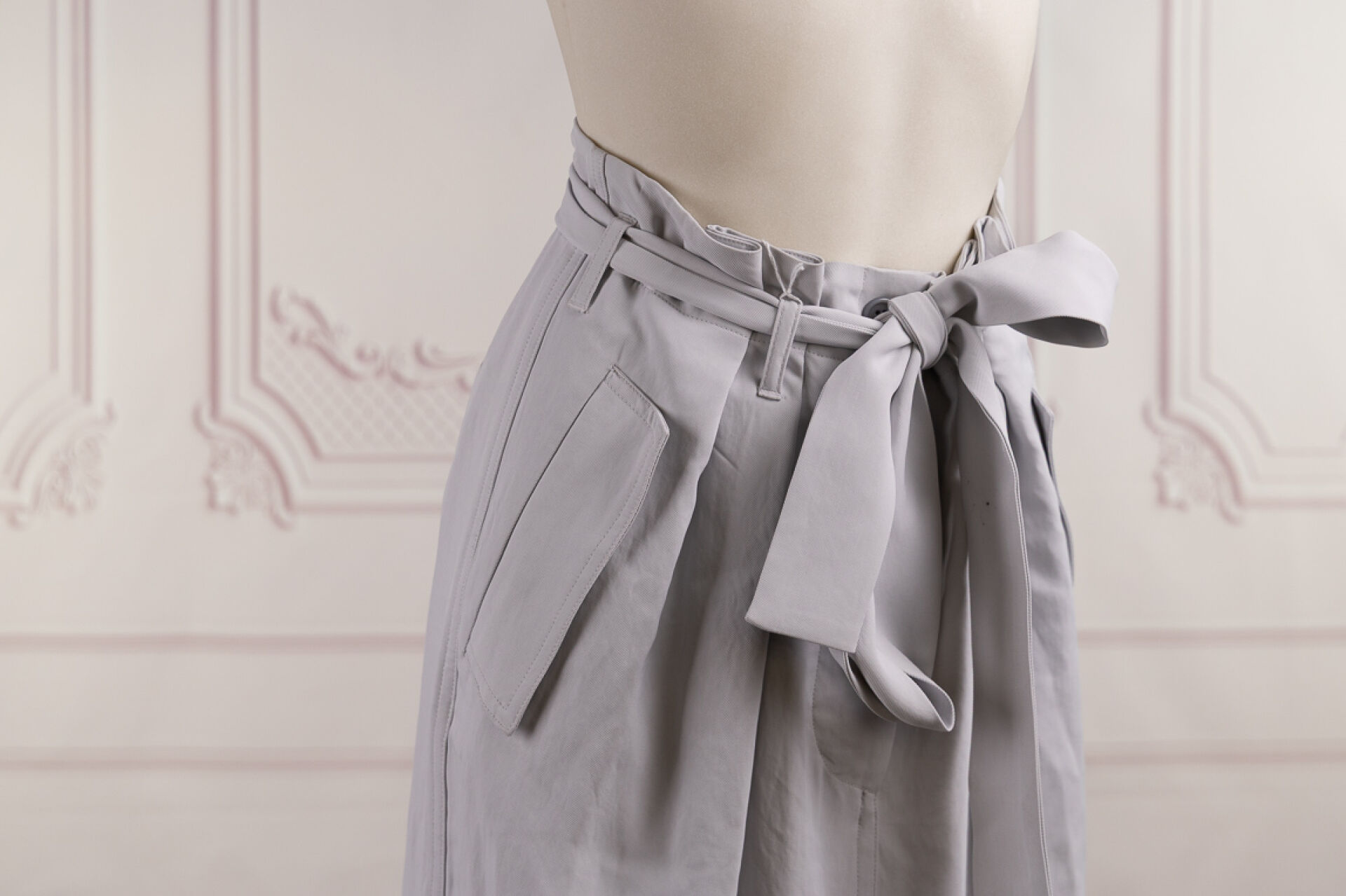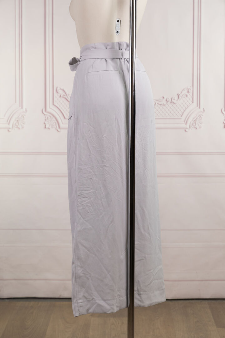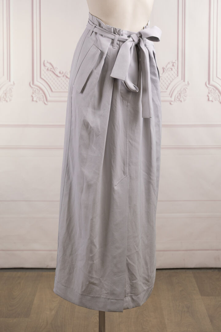 DRIES VAN NOTEN - Jupe longue fendue devant en gabardine gris bleuté, fronces à la taille enchâssant chaque poche verticale sous rabat, ceinture, deux poches horizontales au dos. Taille indiquée 36. Quelques traces.