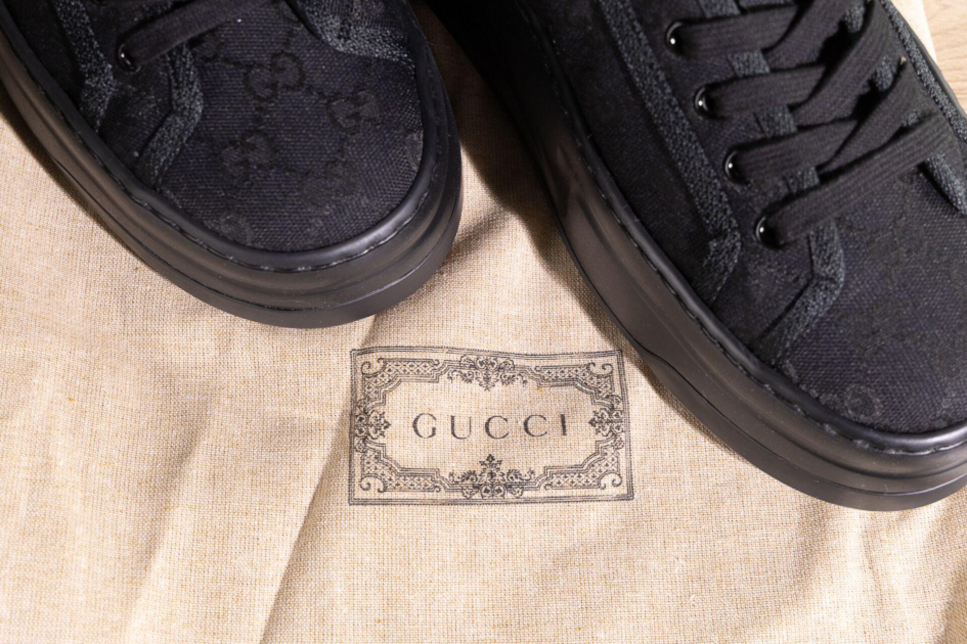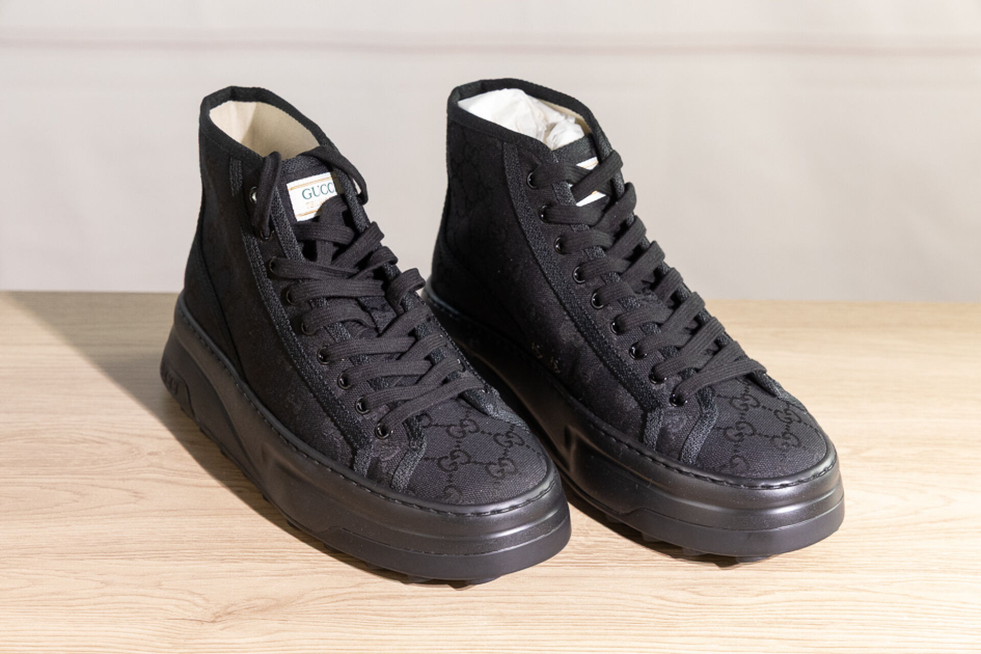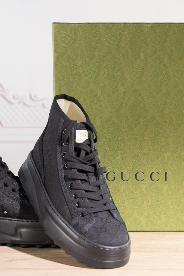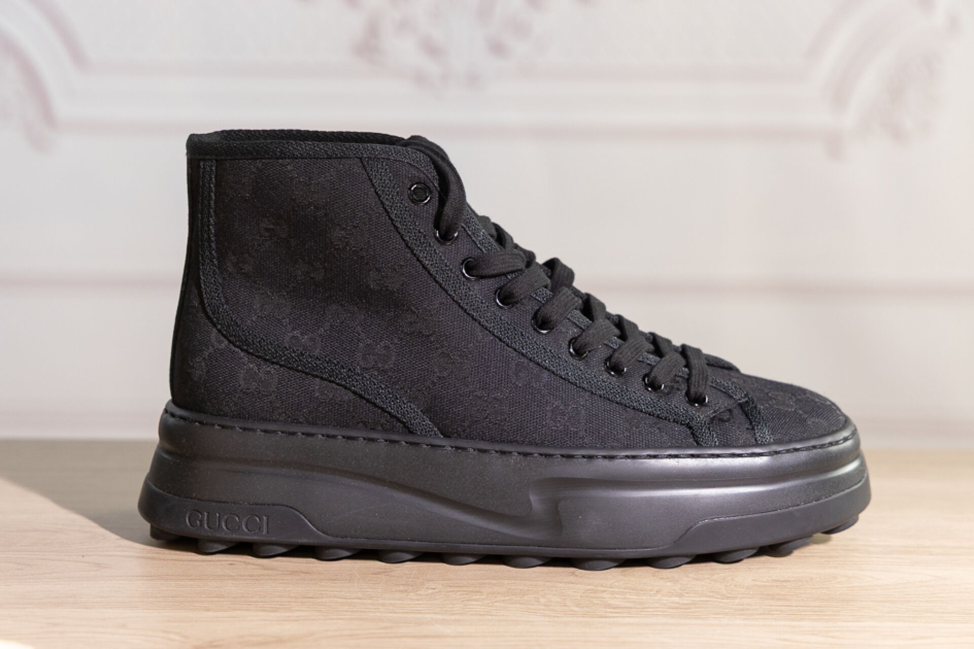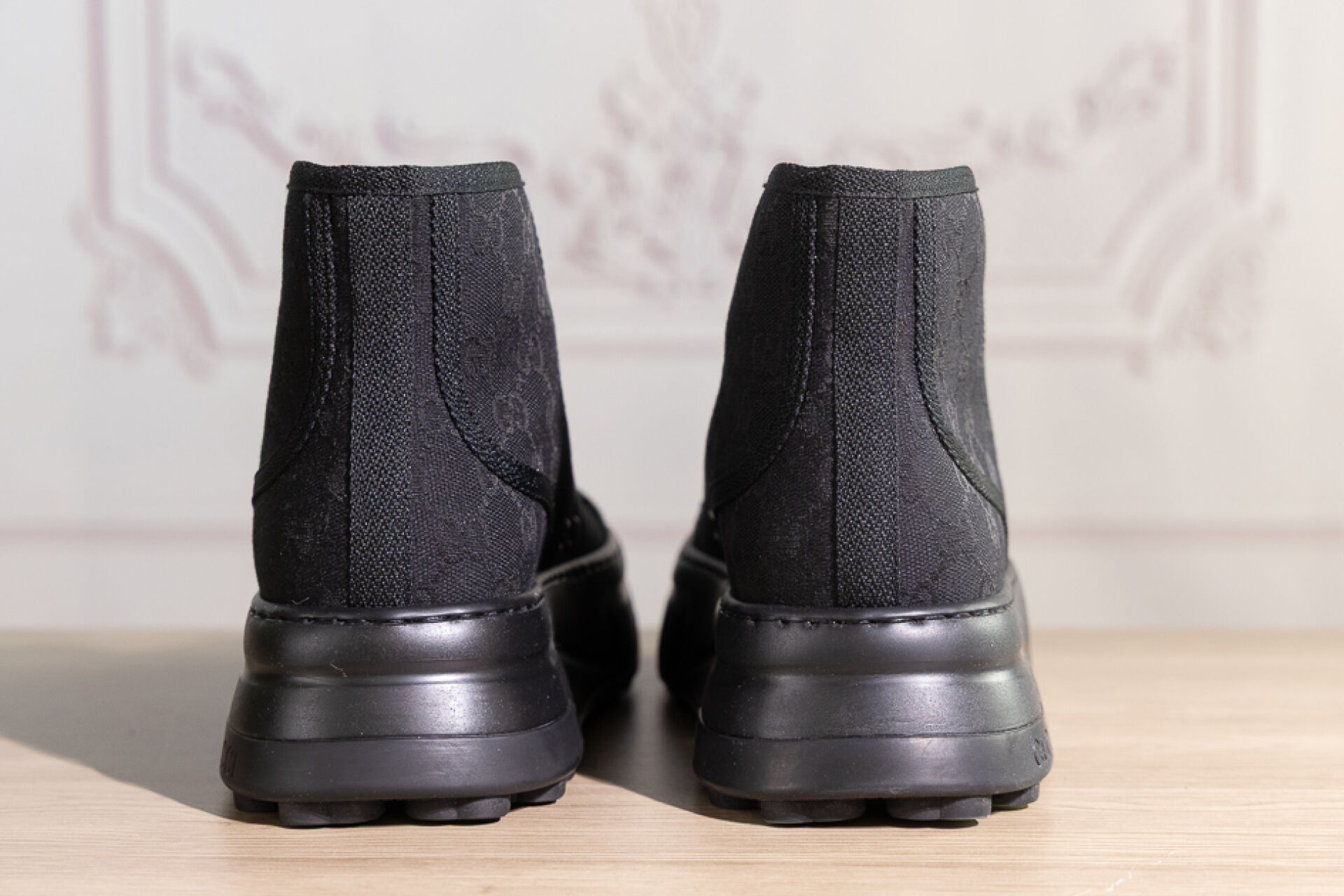 GUCCI - Paire de tennis montantes en toile GG suprême noir, lacets, importante semelle siglée en relief. Boite, lacets de rechange. Pointure indiquée 6 (soit 40 français) Non portées