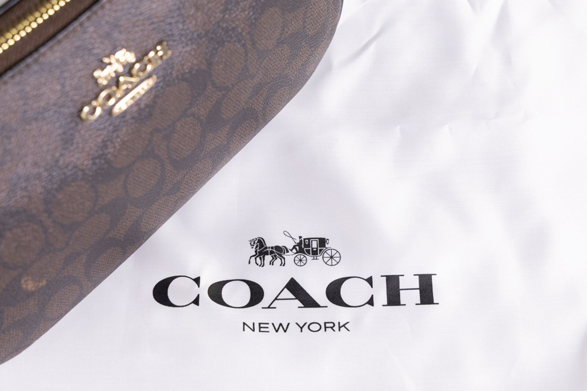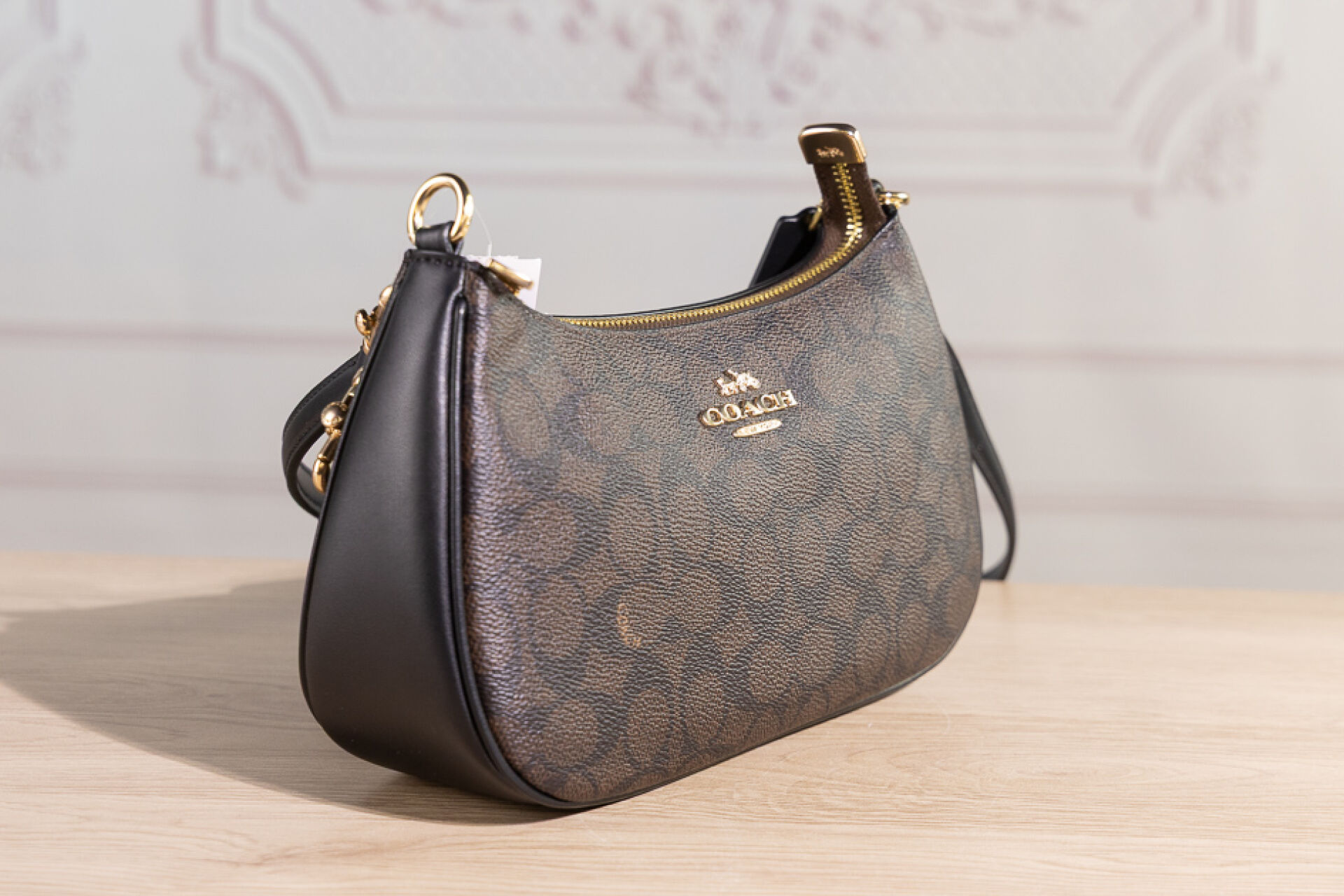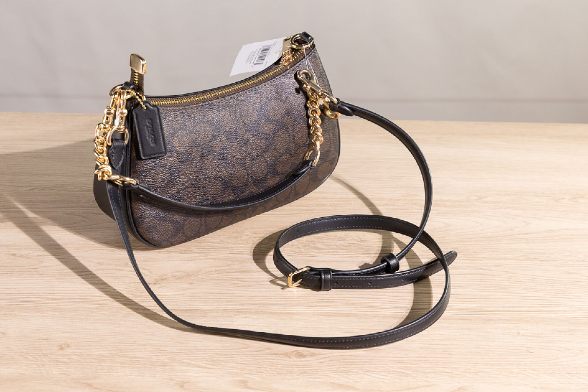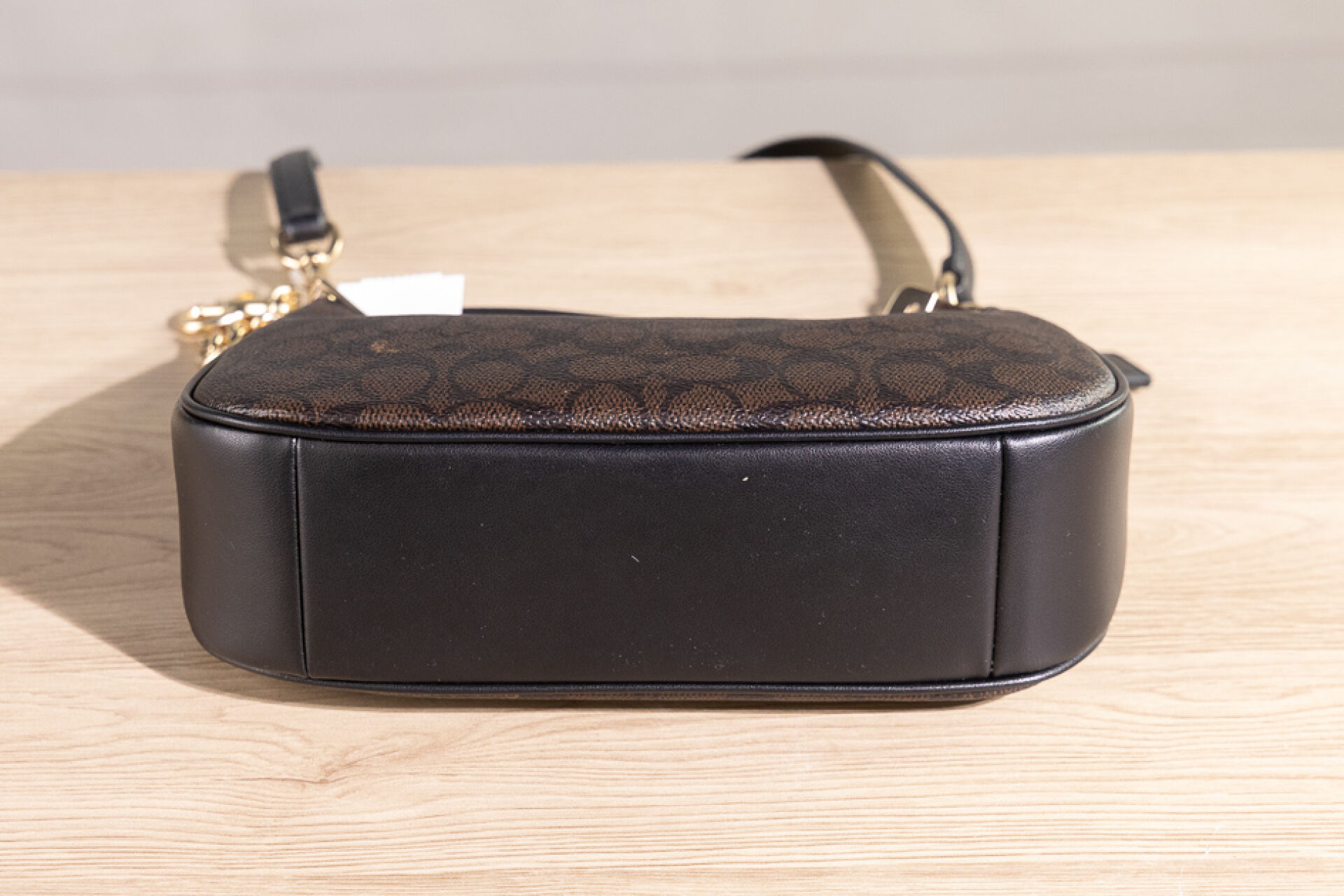 COACH - Petit sac en toile enduite au sigle marron et cuir noir, fermeture à glissière, poignée et anse bandoulière amovibles réglables. Haut. : 15 cm - Long. : 25 cm Non porté, étiquette d'origine, dustbag