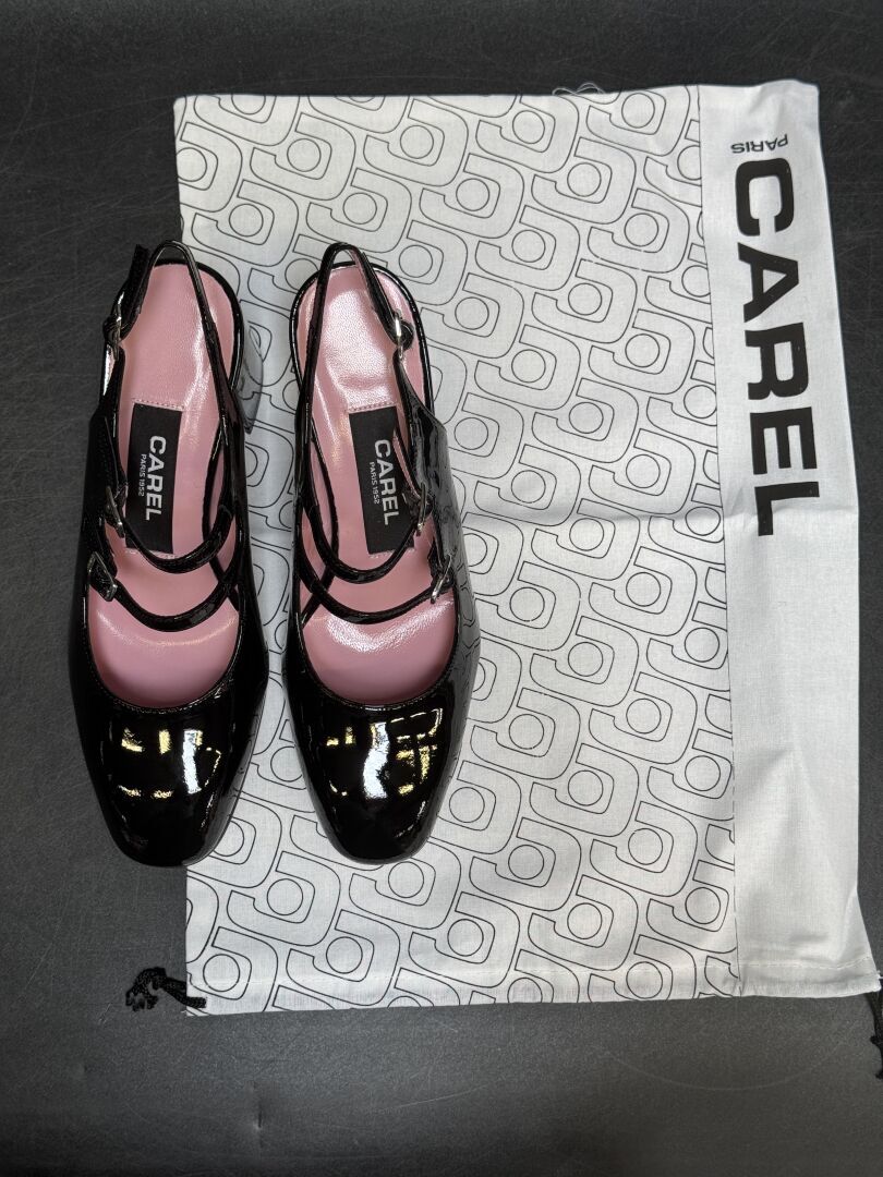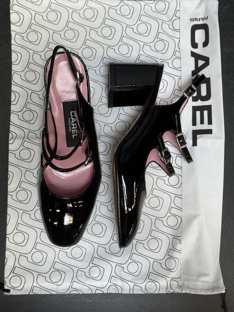 CAREL - Paire de souliers, modèle "Banana", cuir agneau noir vernis, deux brides, ouvert à l'arrière, talons. Pointure 38 - Haut du talon : 7 cm Etat neuf