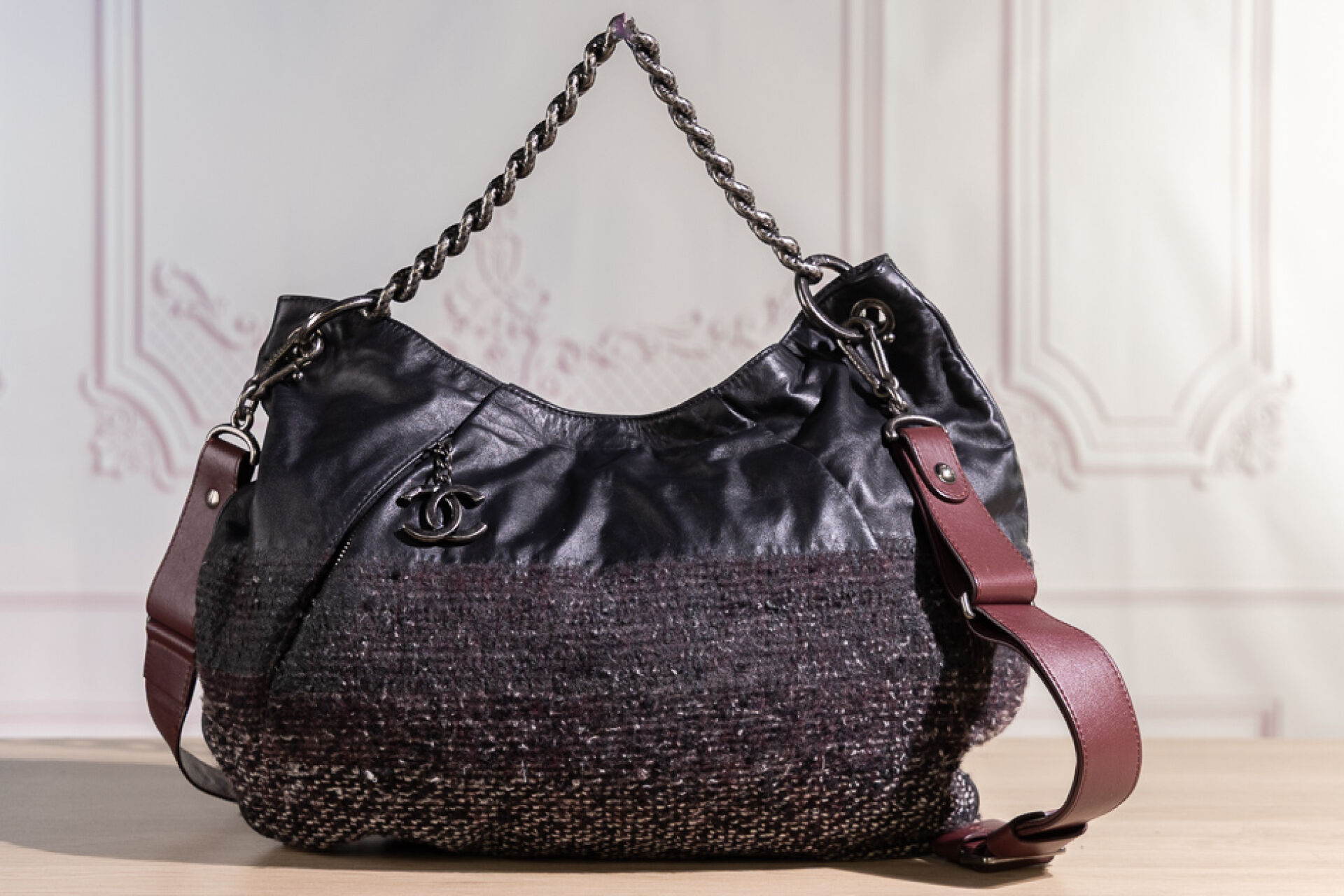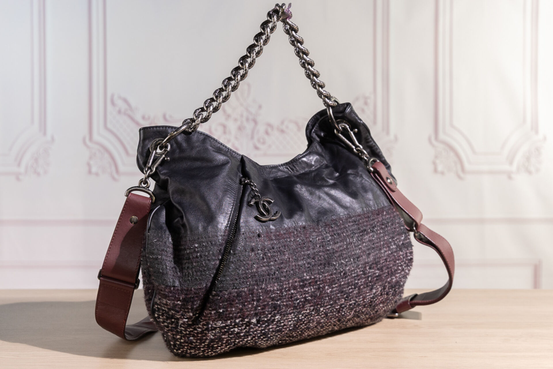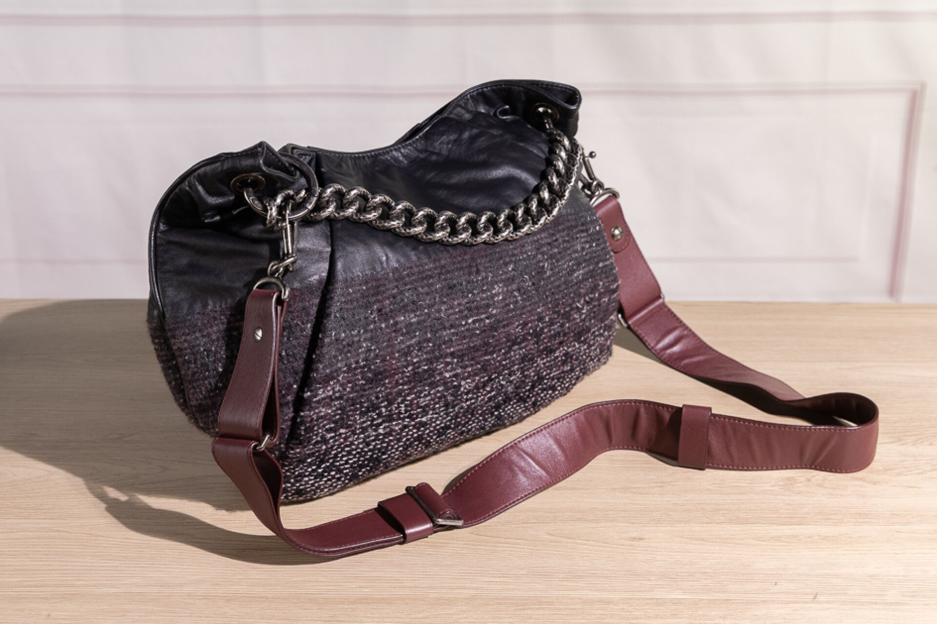 CHANEL - Sac maxi bourse en tweed chiné bordeaux, blanc, noir à effet dégradé et cuir noir, une poche dissimulée sous un pli devant à tirette double C, une poignée chaîne en métal argenté martelé vieilli, et une anse bandoulière réglable amovible en cuir bordeaux, fermoir aimanté sur doublure en gros grain bordeaux. Tampon argent Chanel Made in Italy. Hologramme 17077911. Haut. : 30 cm ; Long. : 44 cm Avec son dust bag.