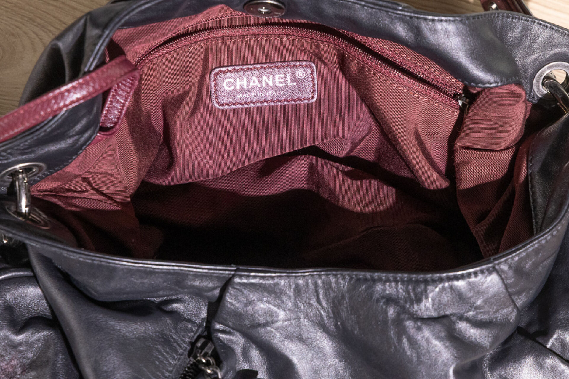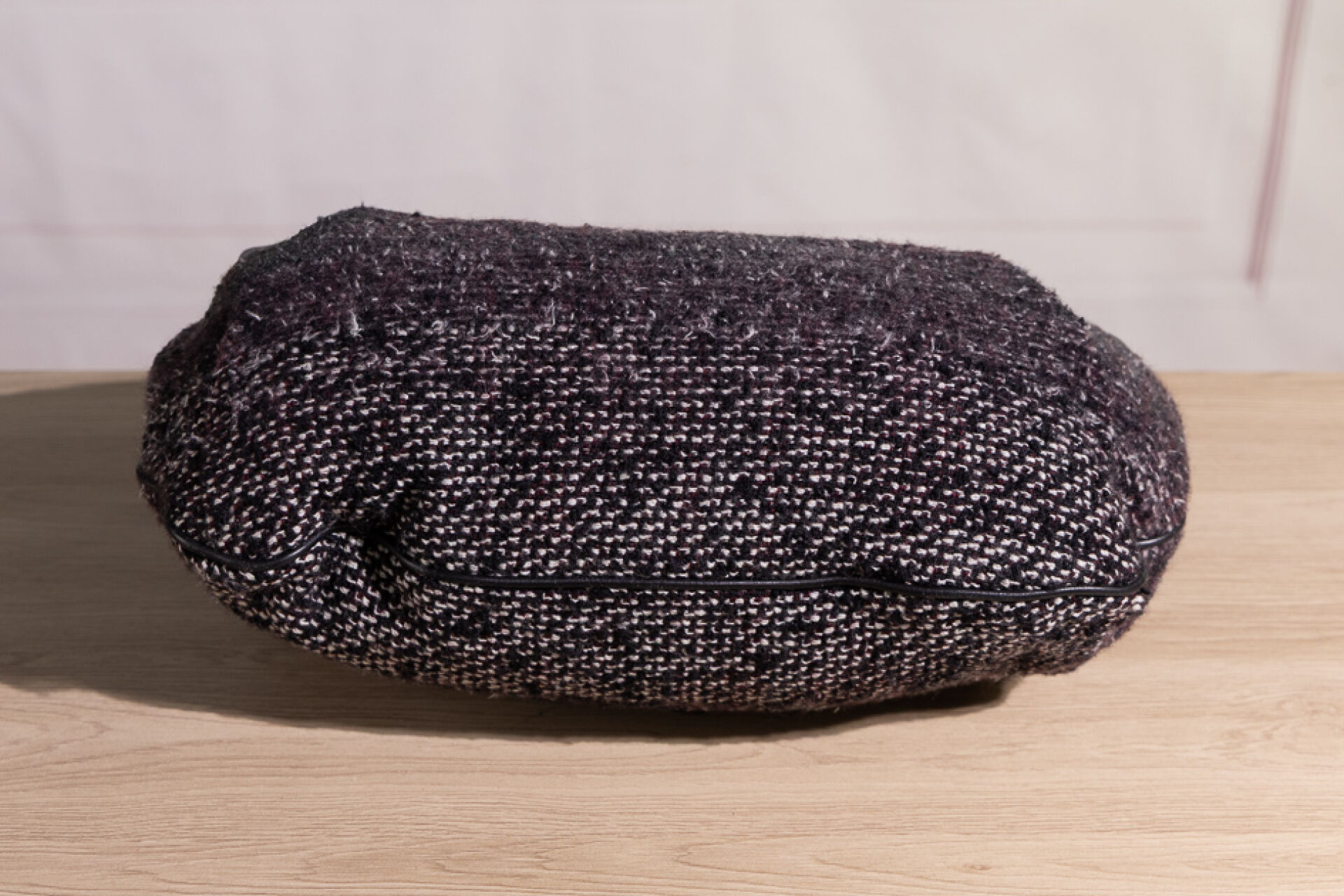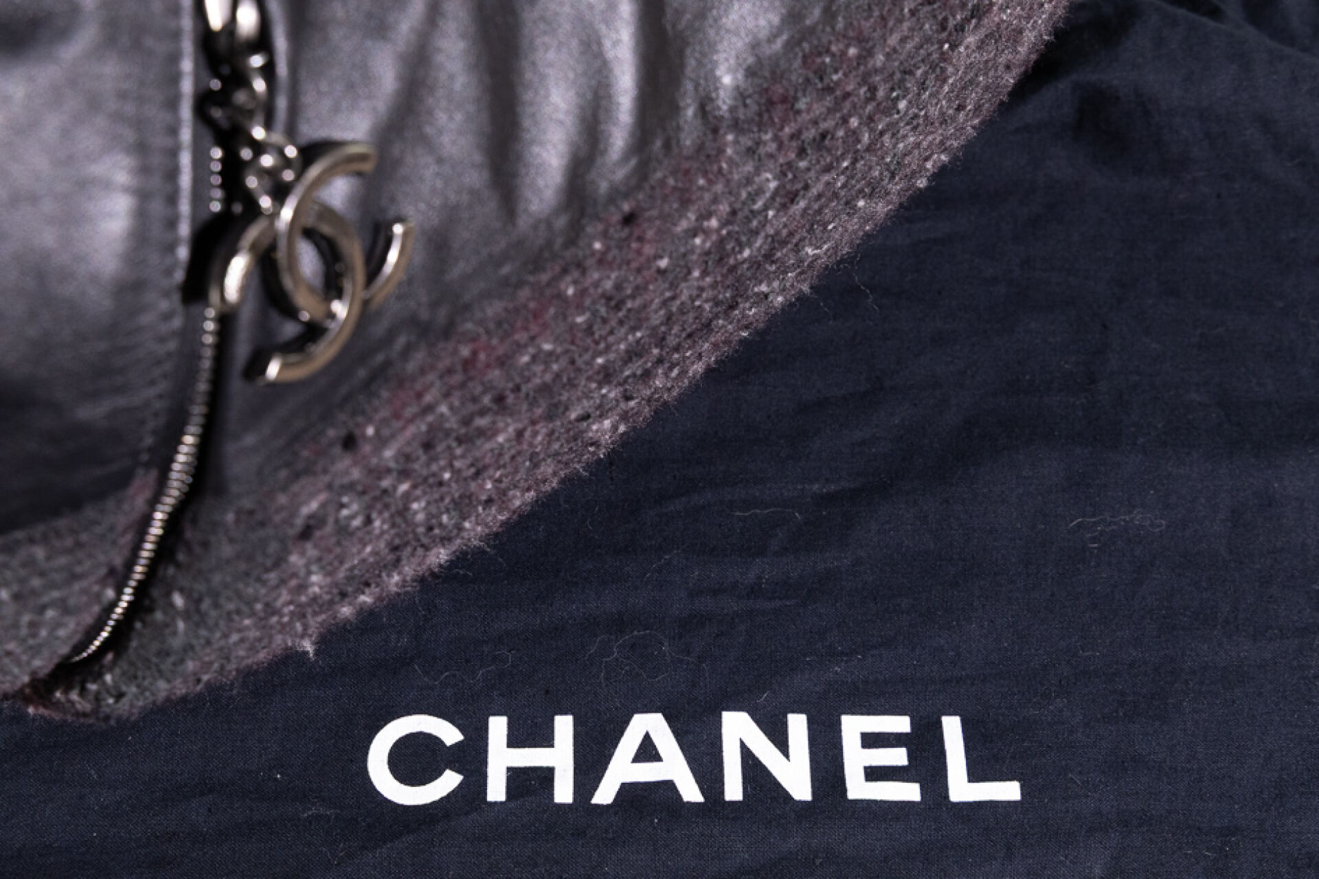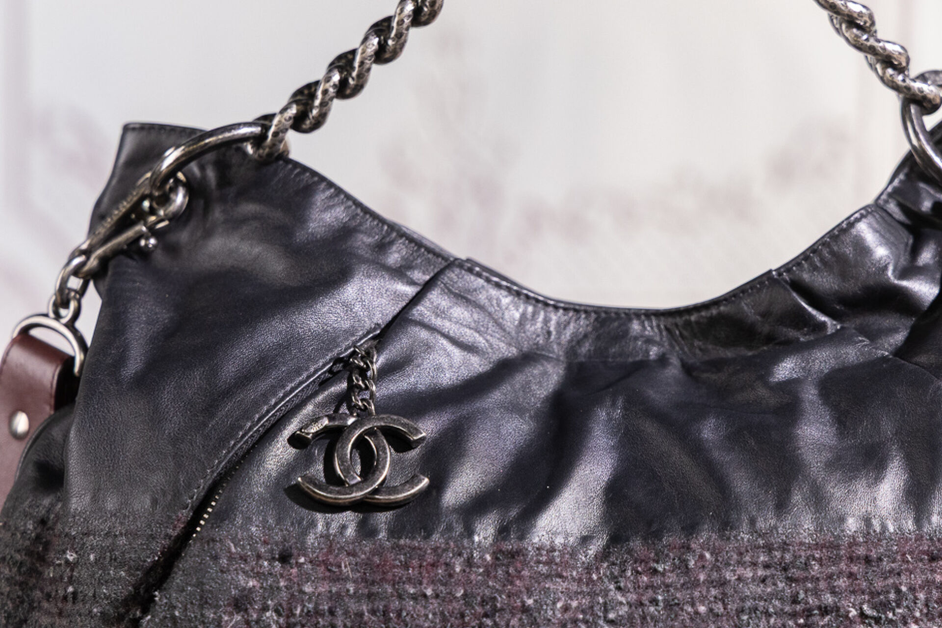 CHANEL - Sac maxi bourse en tweed chiné bordeaux, blanc, noir à effet dégradé et cuir noir, une poche dissimulée sous un pli devant à tirette double C, une poignée chaîne en métal argenté martelé vieilli, et une anse bandoulière réglable amovible en cuir bordeaux, fermoir aimanté sur doublure en gros grain bordeaux. Tampon argent Chanel Made in Italy. Hologramme 17077911. Haut. : 30 cm ; Long. : 44 cm Avec son dust bag.