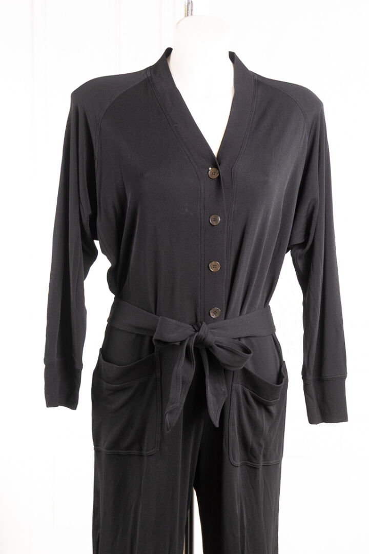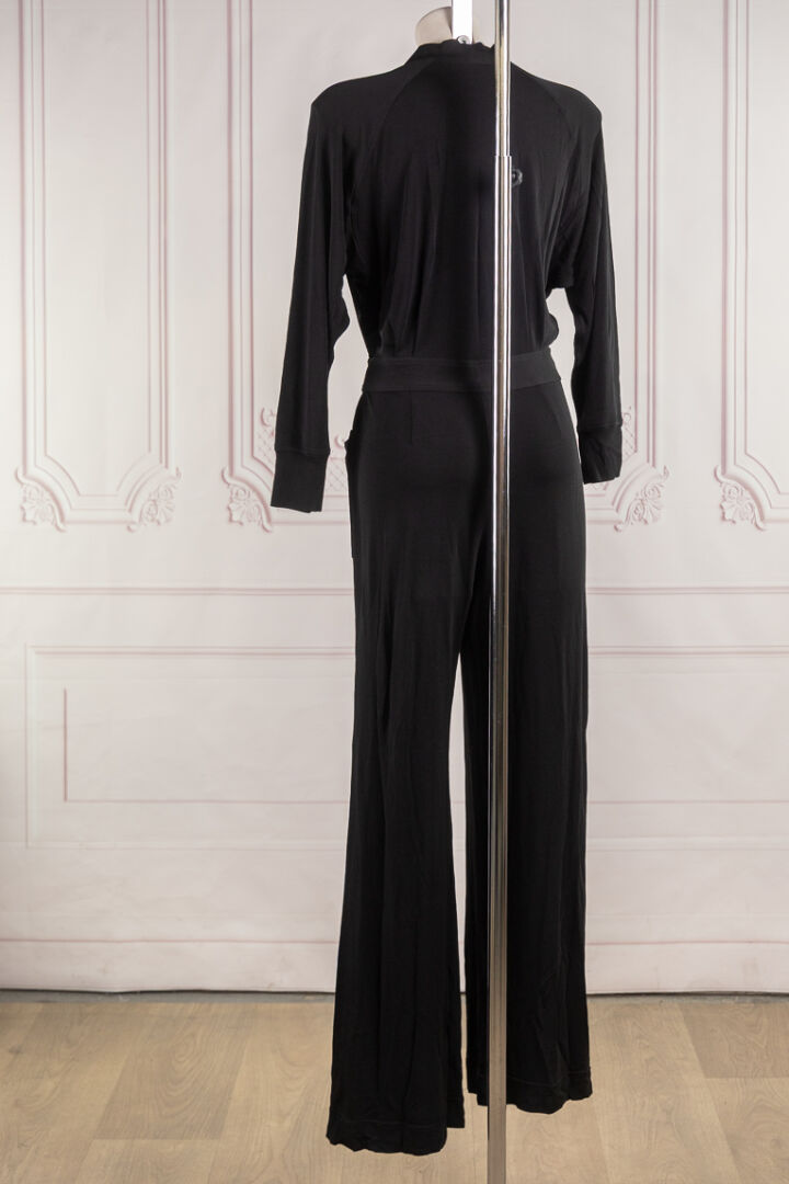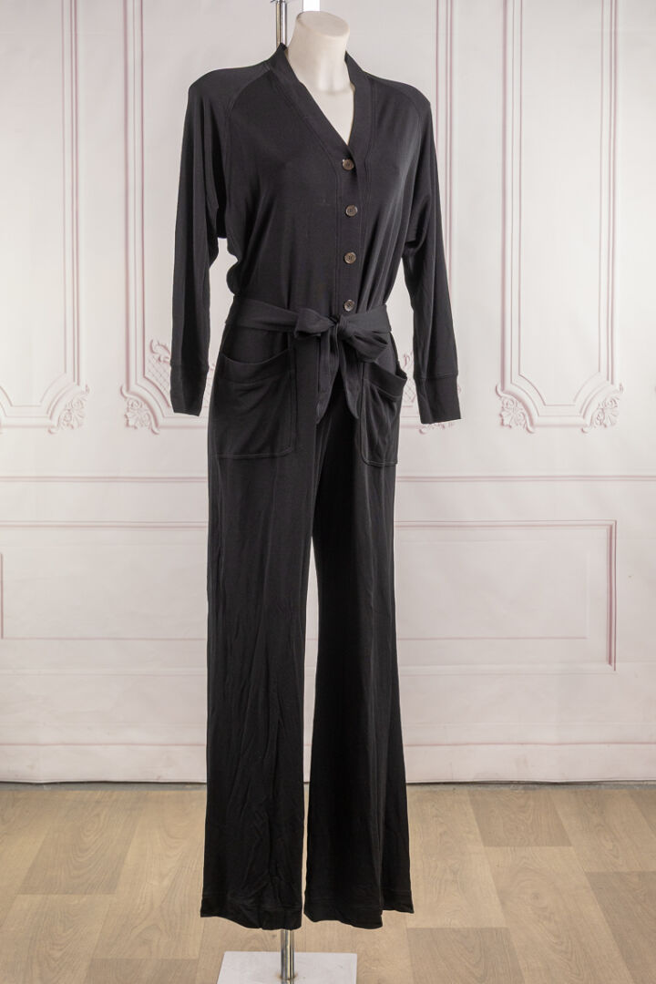HERMES Paris - Combinaison en jersey noir, simple boutonnage, manches 3/4, deux poches plaquées, ceinture. Taille indiquée 42 Déjà portée, bon état
