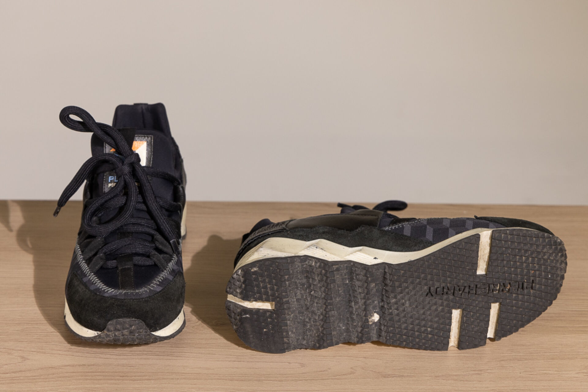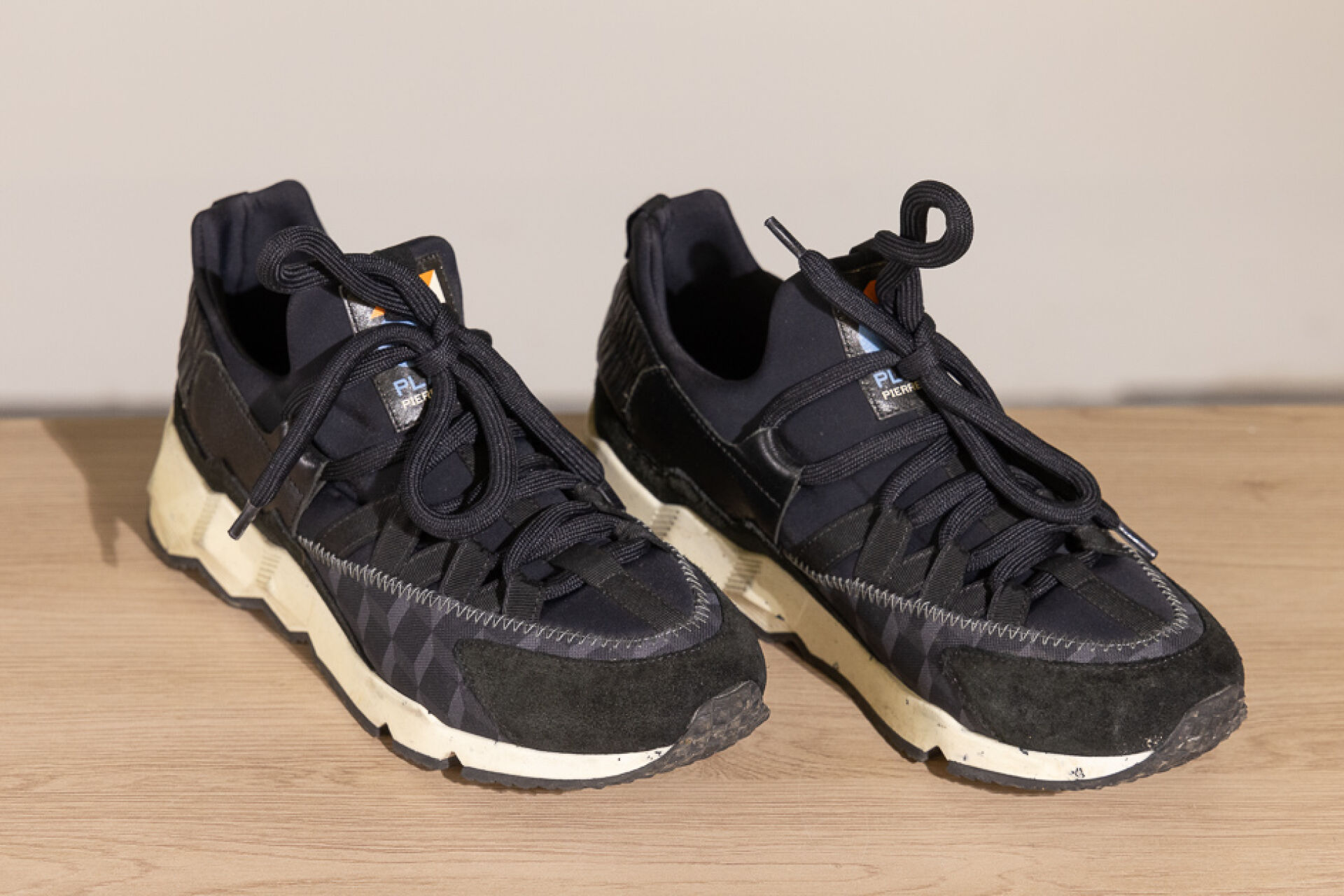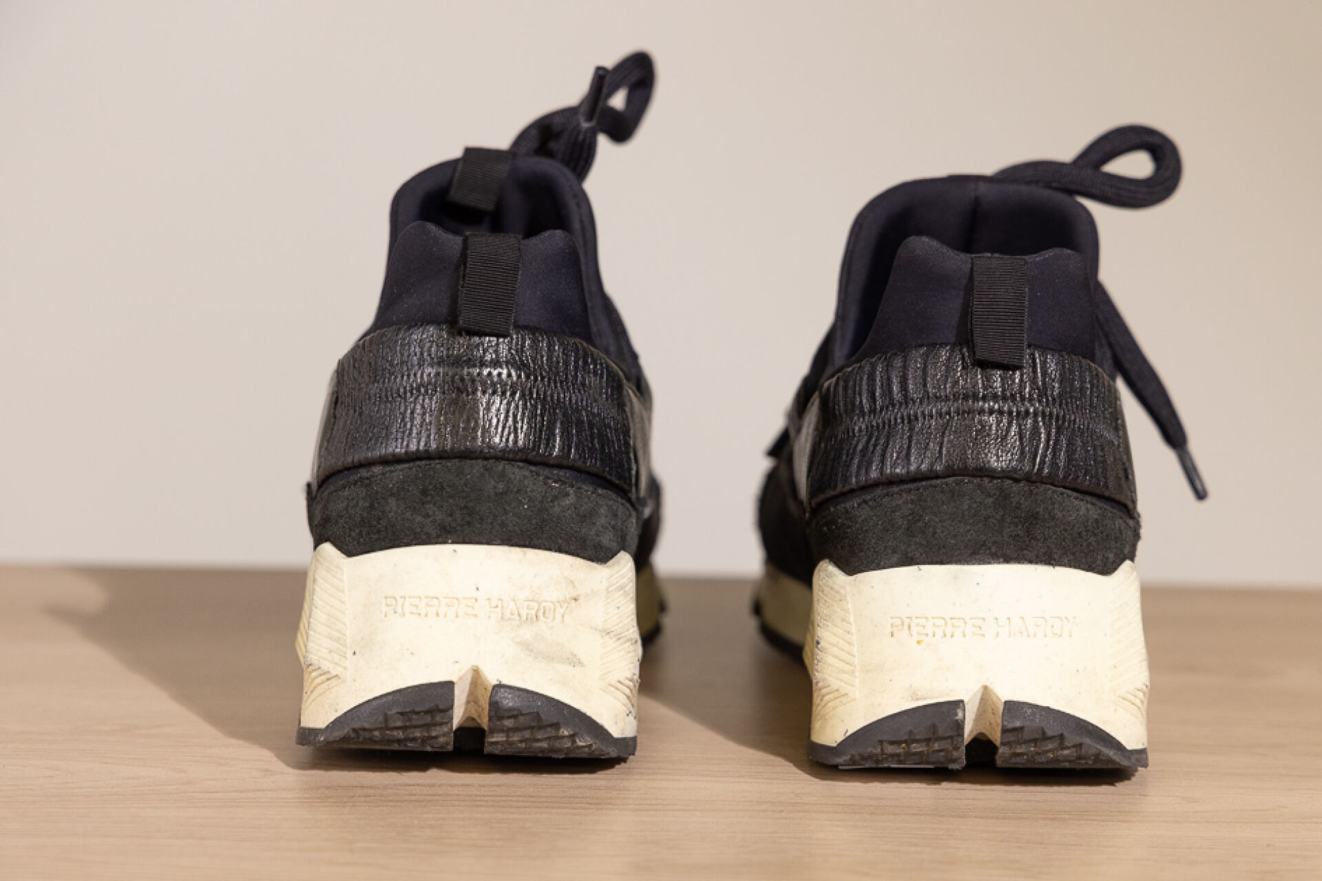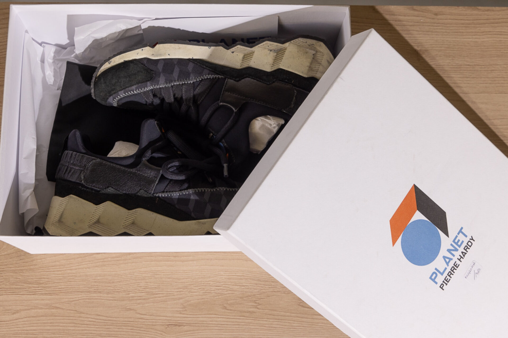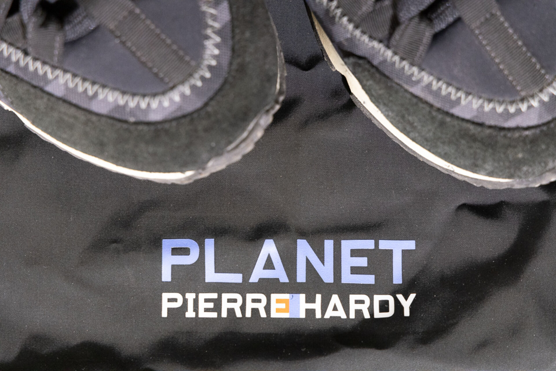 PIERRE HARDY x PLANET - Paire de sneakers noir en patchwork de daim, toile cubique et néoprène sur semelle ivoire découpée reprenant les cubes, lacets. Dustbag et boite. Pointure 39 Déjà portée, usures