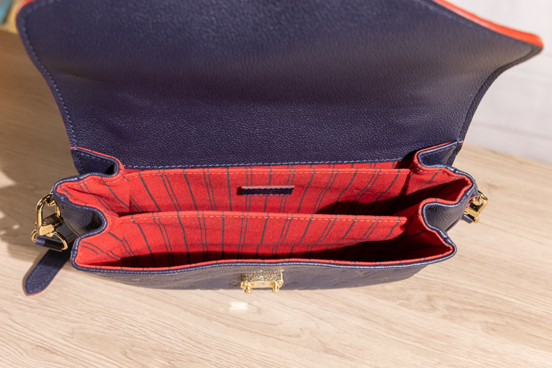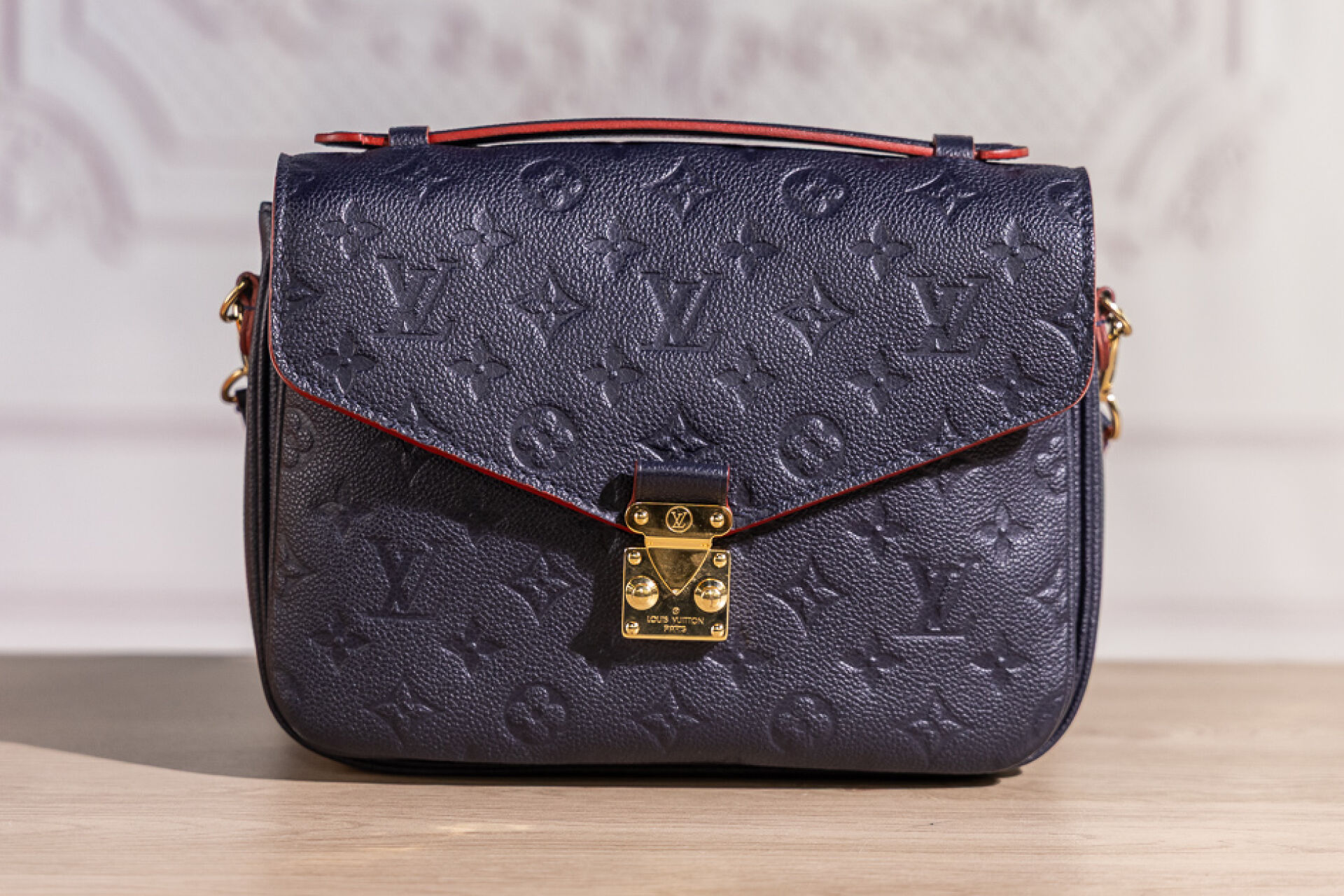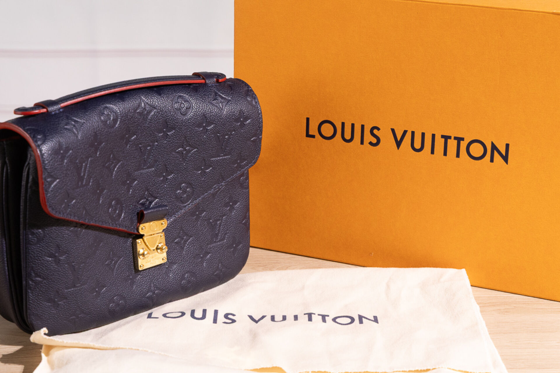 LOUIS VUITTON - Sac Metis en cuir grainé marine embossé au Monogram bord de tranche rouge coquelicot, fermoir cartable en métal doré sur rabat, poignée, poche zippée au dos, doublure principale à trois compartiments en coton rouge rayé noir, anse bandoulière amovible réglable. Tampon or Louis Vuitton Paris Made in Spain. (Bel état.) Haut. : 20,4 cm ; Long. : 24,9 cm ; Prof. : 6,6 cm Avec son dust bag et sa boîte.